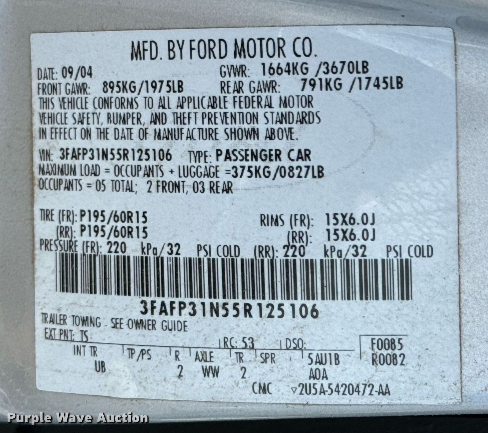 2005 Ford Focus ZX3 SE. Miles: 98,131 on odometer, VIN: 3FAFP31N55R125106. Engine Displacement: 2.0L L4 DOHC, Cylinders: 4, Fuel type: Gas. Transmission Automatic. Interior AC, Heat, Power windows, Power locks. Tires Size: 195/60R15. Notes Dash warning indicator: Check engine. Kansas title. SEK-CAP. Girard, KS 66743