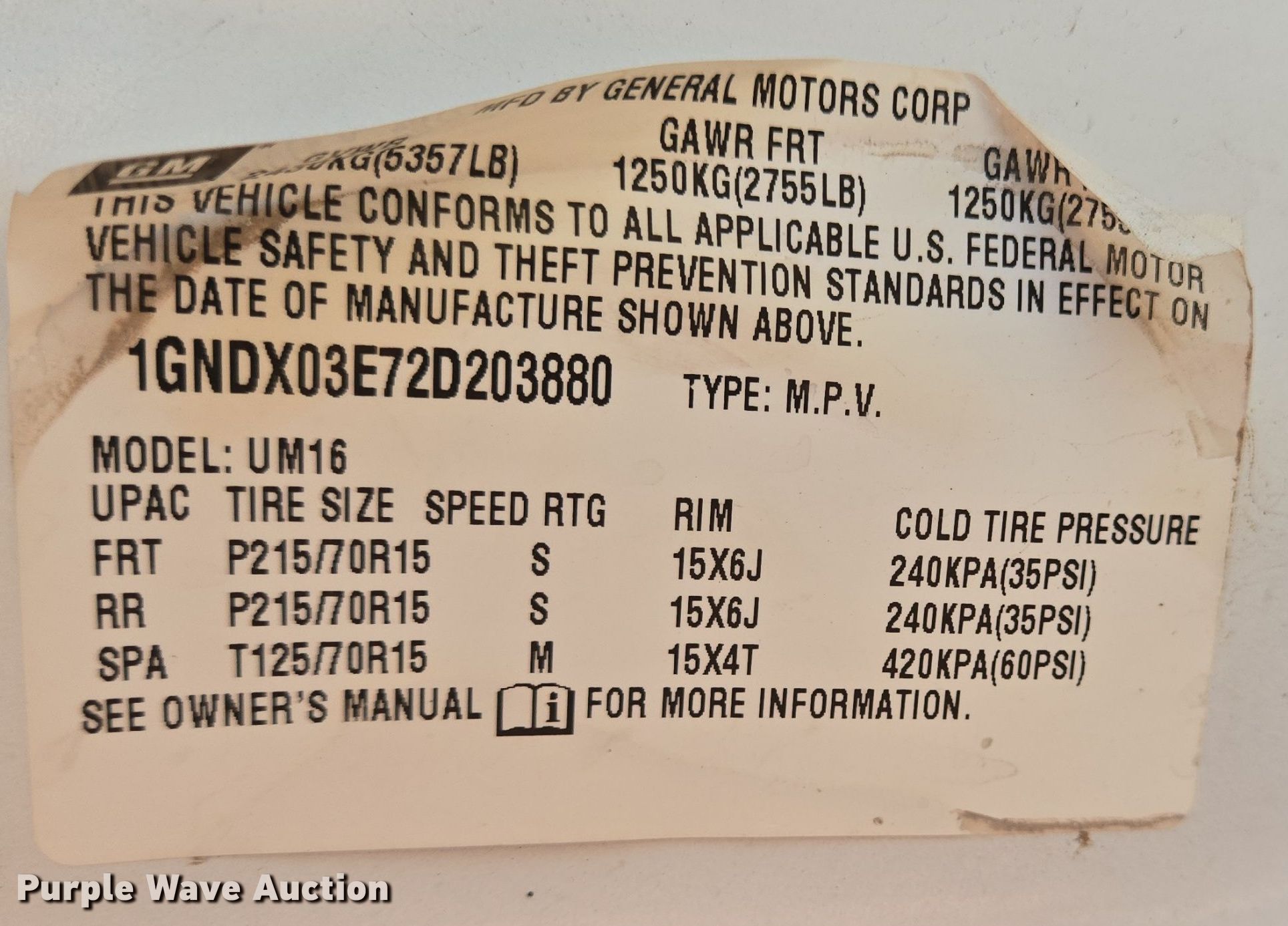 Purple Wave is selling a used Passenger Vehicle in Texas. This item is a 2002 Chevrolet Venture van with the following: Miles: 168,757 on odometer, VIN: 1GNDX03E72D203880