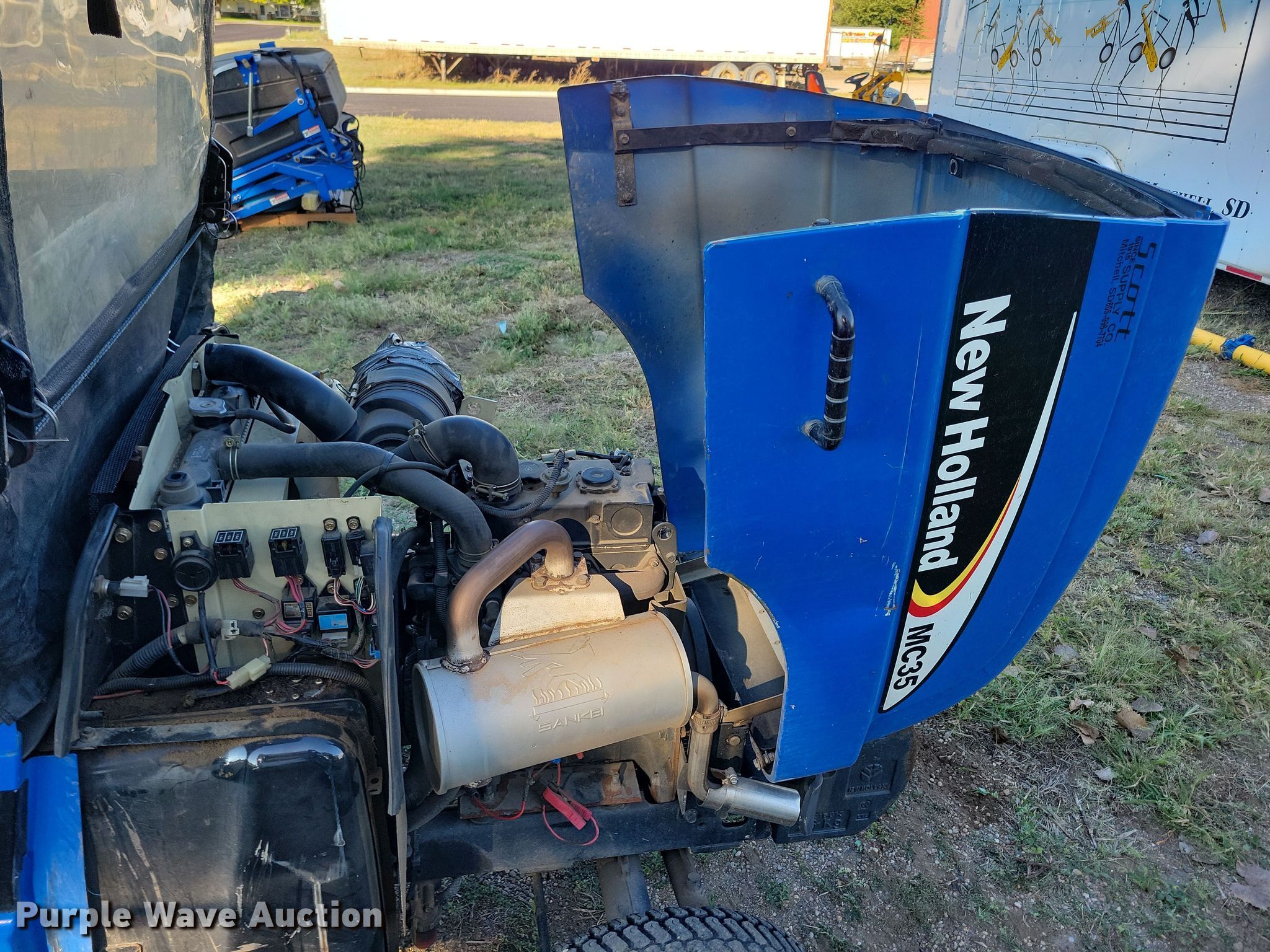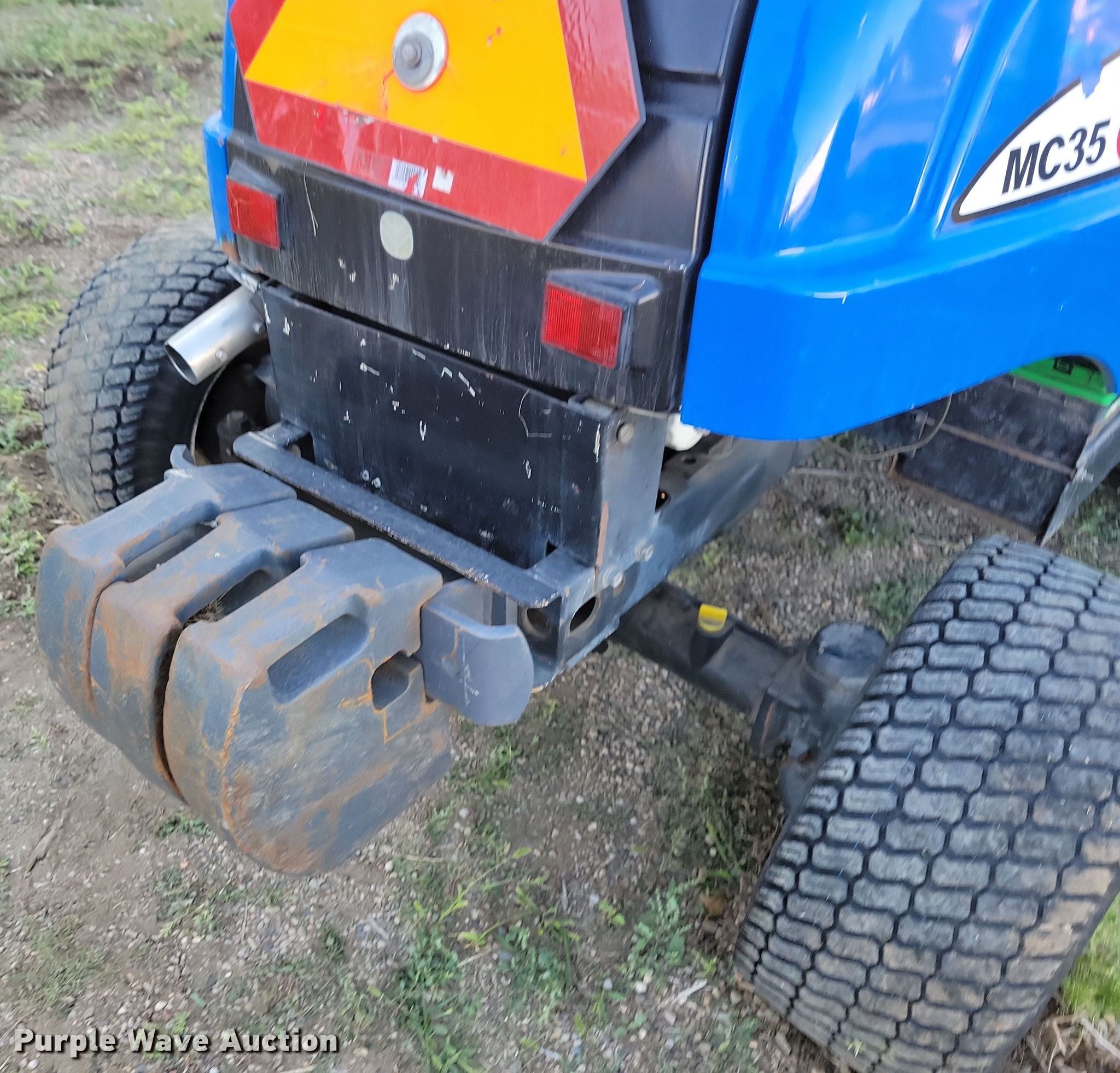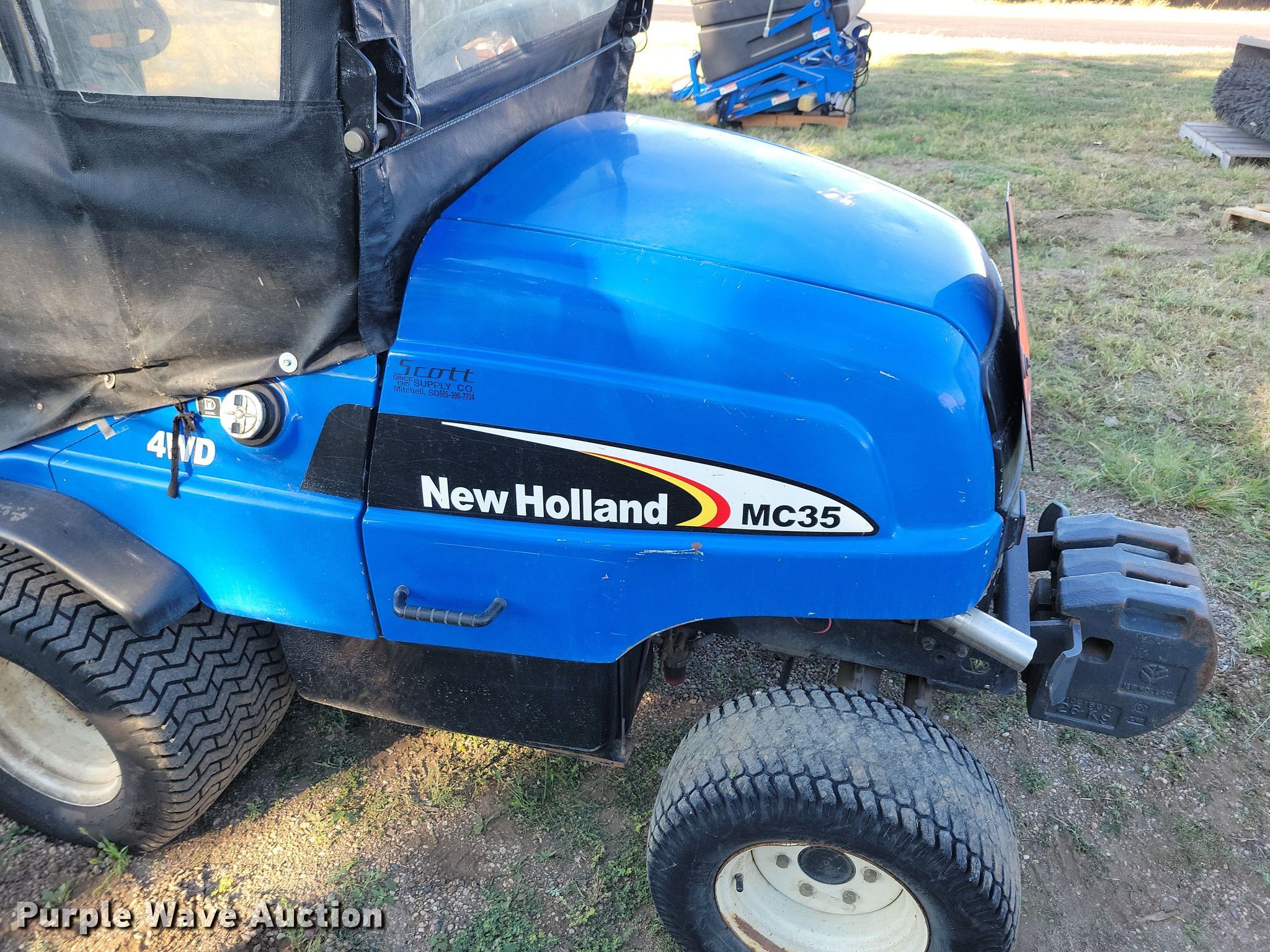New Holland MC35 lawn mower. Hours: 2,285 on meter, Cutting width: 72". Engine Shibaura, Displacement: 1.662L, Cylinders: 3, Fuel type: Diesel, kW: 26.1. Transmission Hydrostatic. Chassis Four wheel drive. Operators station Enclosed cab. Features Counter weights, Snow blower Width: 62", New Holland 62MS, Broom Width: 54", Sweepster. Tires Front: 24X13-12NHS, Rear: 20X8-10NHS. Notes Hydraulic pump issues, weak. Mitchell School District. Mitchell, SD 57301