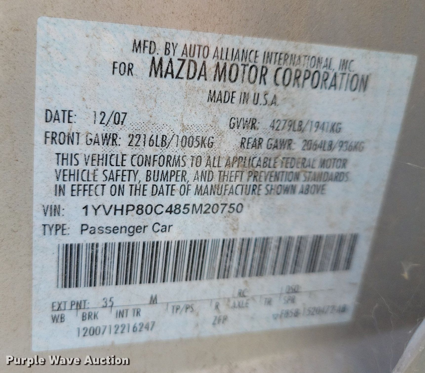 Purple Wave is selling a used Passenger Vehicle in South Dakota. This item is a 2008 Mazda Mazda 6 with the following: Miles: 188,991 on odometer, VIN: 1YVHP80C485M20750, Unit #: PW1