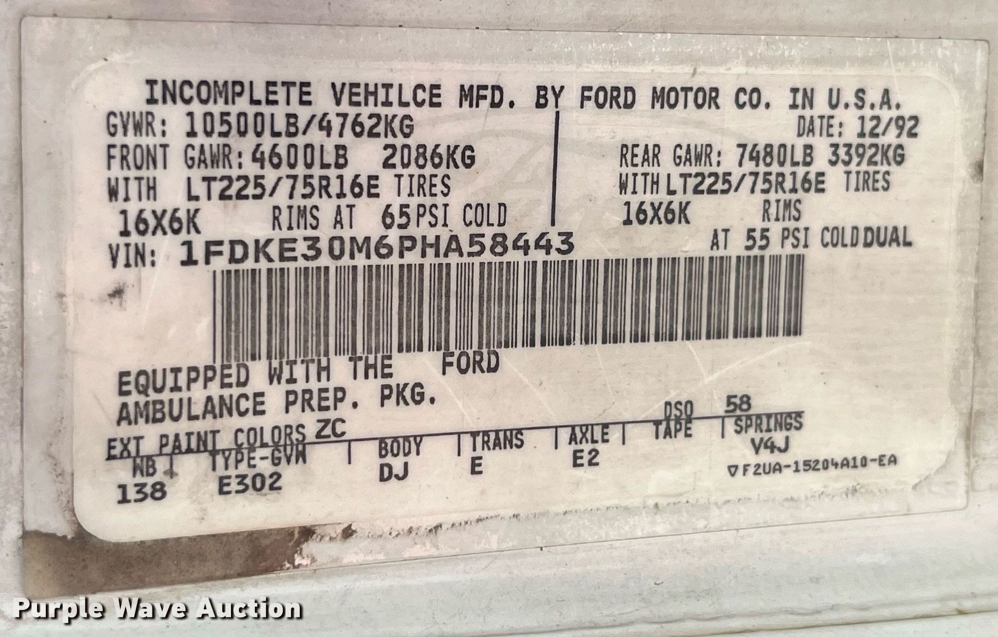 1993 Ford E350 ambulance. Miles: 113,760 on odometer, Hours: 877 on meter, VIN: 1FDKE30M6PHA58443. Engine Displacement: 7.3L, Cylinders: 8, Fuel type: Diesel. Transmission Automatic. Chassis Axles: Single, Suspension: Spring, Brakes: Hydraulic. Interior AC, Heat, Power windows, Power locks, Cruise control, Auxiliary controls. Features Ambulance body Cayel Craft Inc., PA/ siren controls, Oxygen hookups. Tires Front: LT225/75R16, Rear: LT215/85R16. Notes Dash warning indicator: Engine temp. Missouri title. Seller is a government entity who will be assigning and distributing the title. Please contact the seller for distribution questions. City of Moberly. Moberly, MO 65270