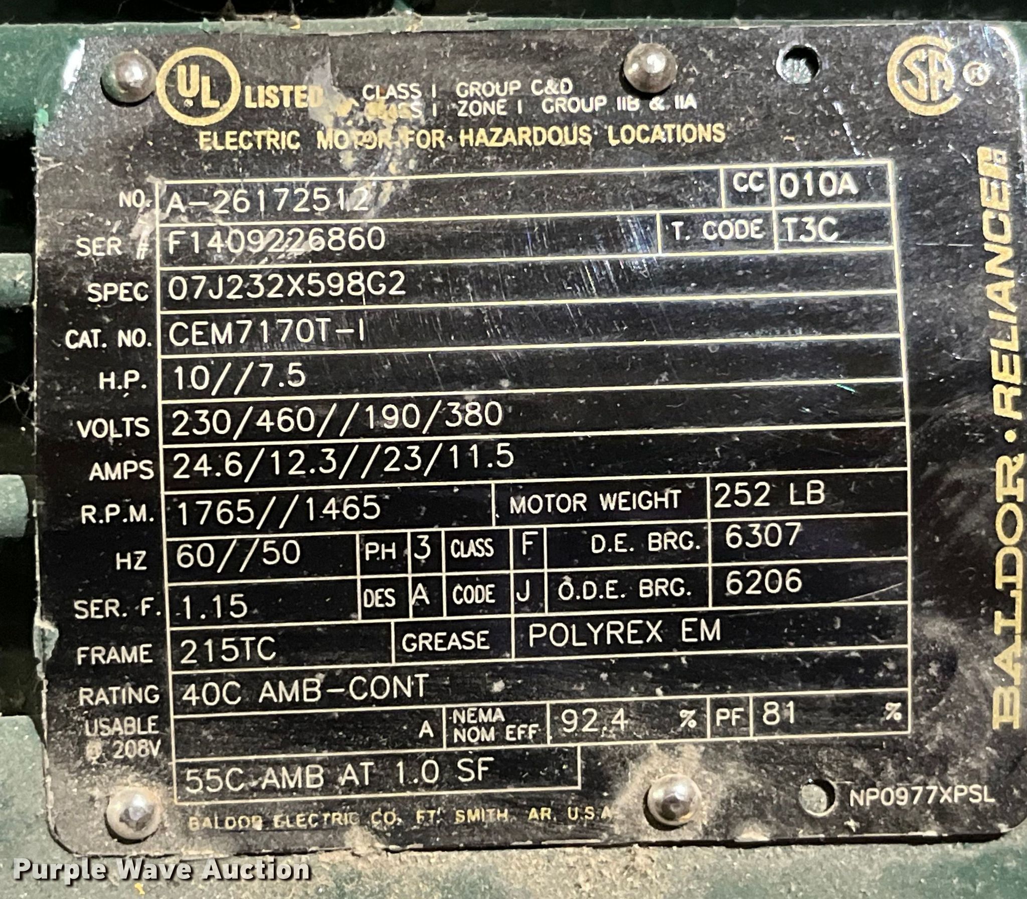 Purple Wave is selling a used Electric Motor in Missouri. This item is a (2) Baldor electric motors with the following: Baldor CEM7170T-1, Volts: 230/460/ /190/380, H.P: 10/7.5, Phase: Three, Baldor VM7014, Volts: 208-230/460, H.P: 1, Phase: Three