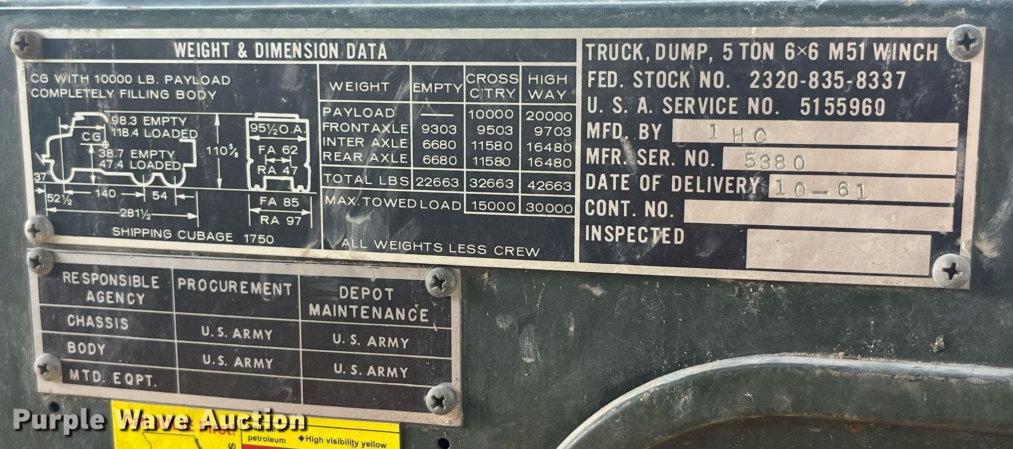 1961 International M51 dump truck. Miles: 21,062 on odometer Actual miles unknown, Hours: 753 on meter Actual hours unknown, VIN: 5380. Engine Cylinders: 6, Fuel type: Gas. Transmission Manual, Speed: 5. Chassis Axles: Tandem, Suspension: Spring over walking beam, Brakes: Hydraulic. Features Dump bed 10' 5" L x 88" W, Side height: 23", Bed type: Steel, Ram: Single, End gate: Manual. Tires Size: 11.00-20. Notes Windshield chipped or cracked, Non-operational unit, Unit must be towed or hauled. Illinois title. Mileage has not been verified. Exempt will be written in the odometer disclosure on the title. Seller is a government entity who will be assigning and distributing the title. Please contact the seller for distribution questions. Title distribution may be delayed up to 14 days from verification of funds. Payson, IL 62360