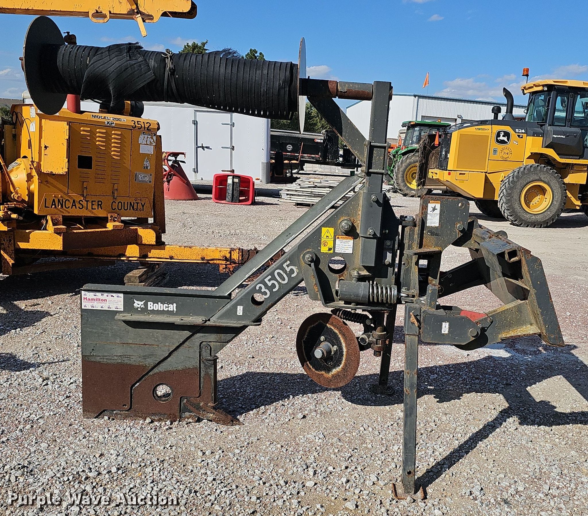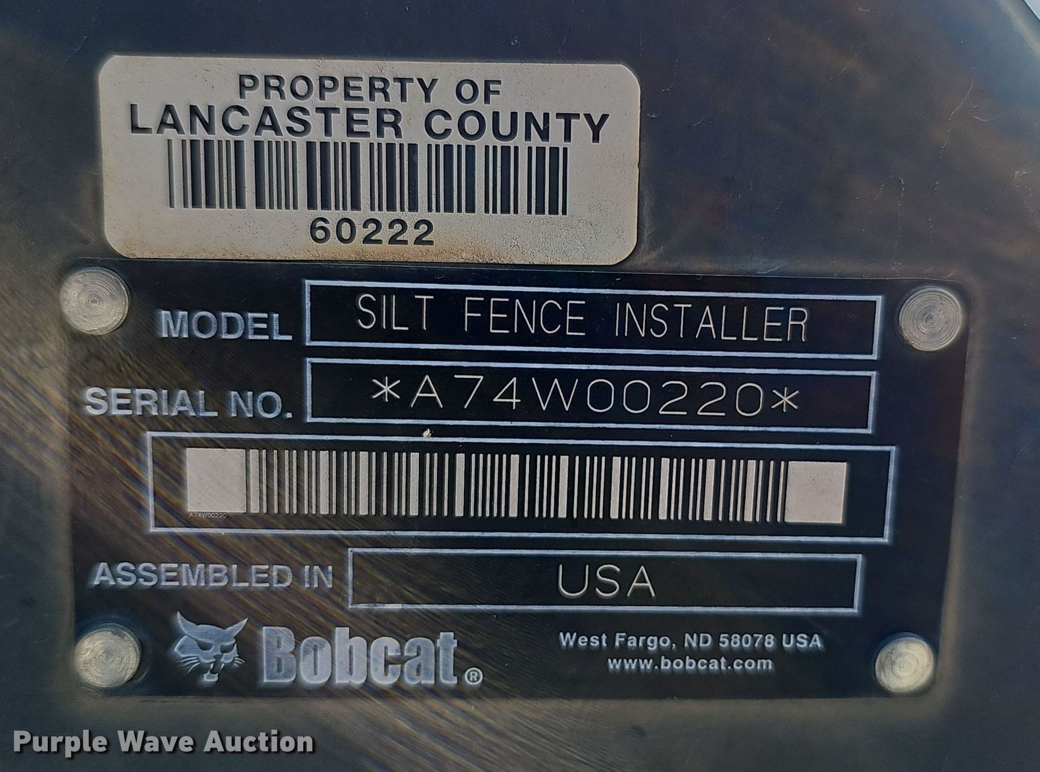 Bobcat skid steer fence installer. Serial: A74W00220, Roll capacity: 43" W. Notes (8) unused rolls of silt fence included, Unknown operating condition. Lancaster County Engineers Office. Lincoln, NE 68528