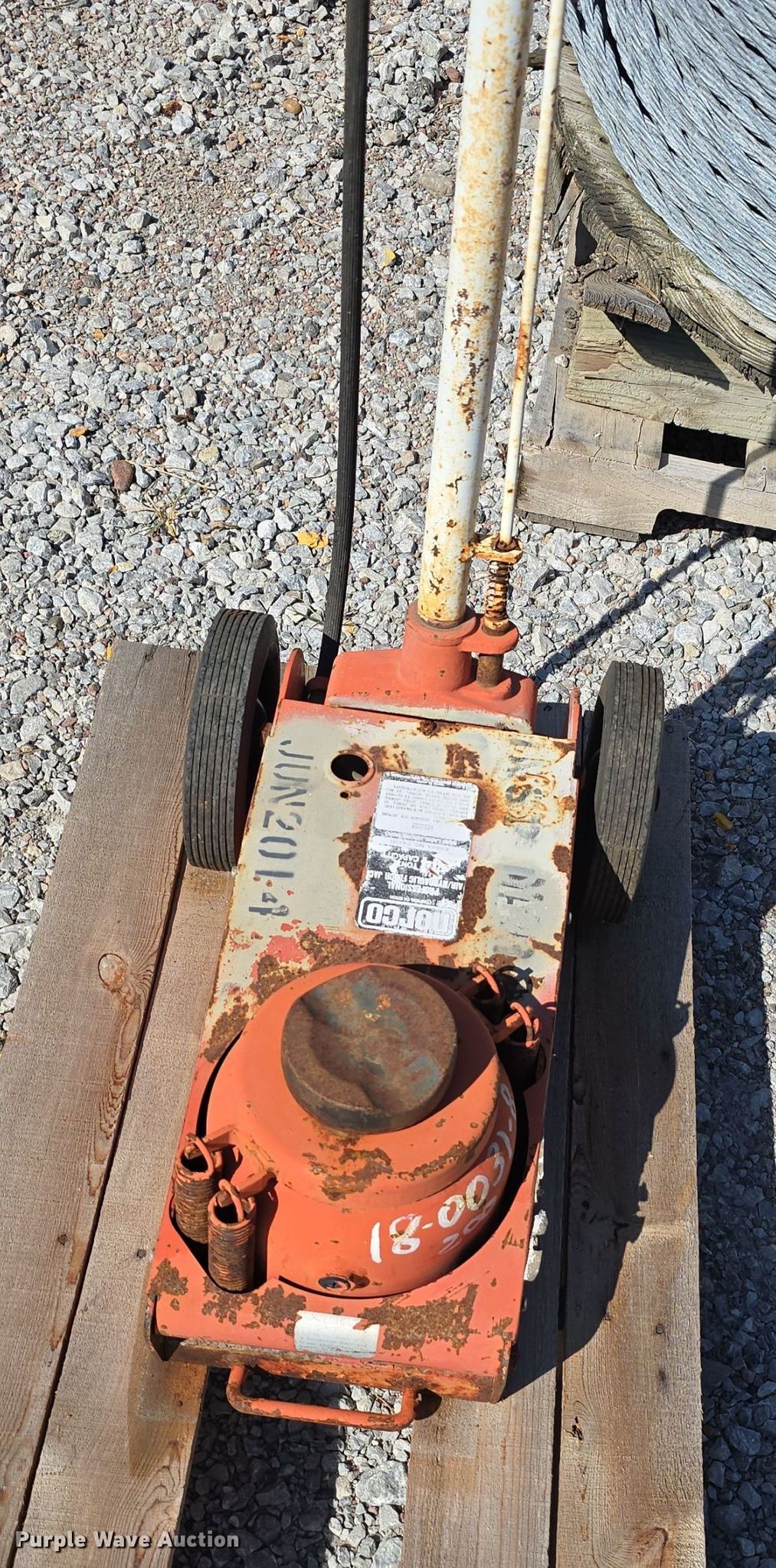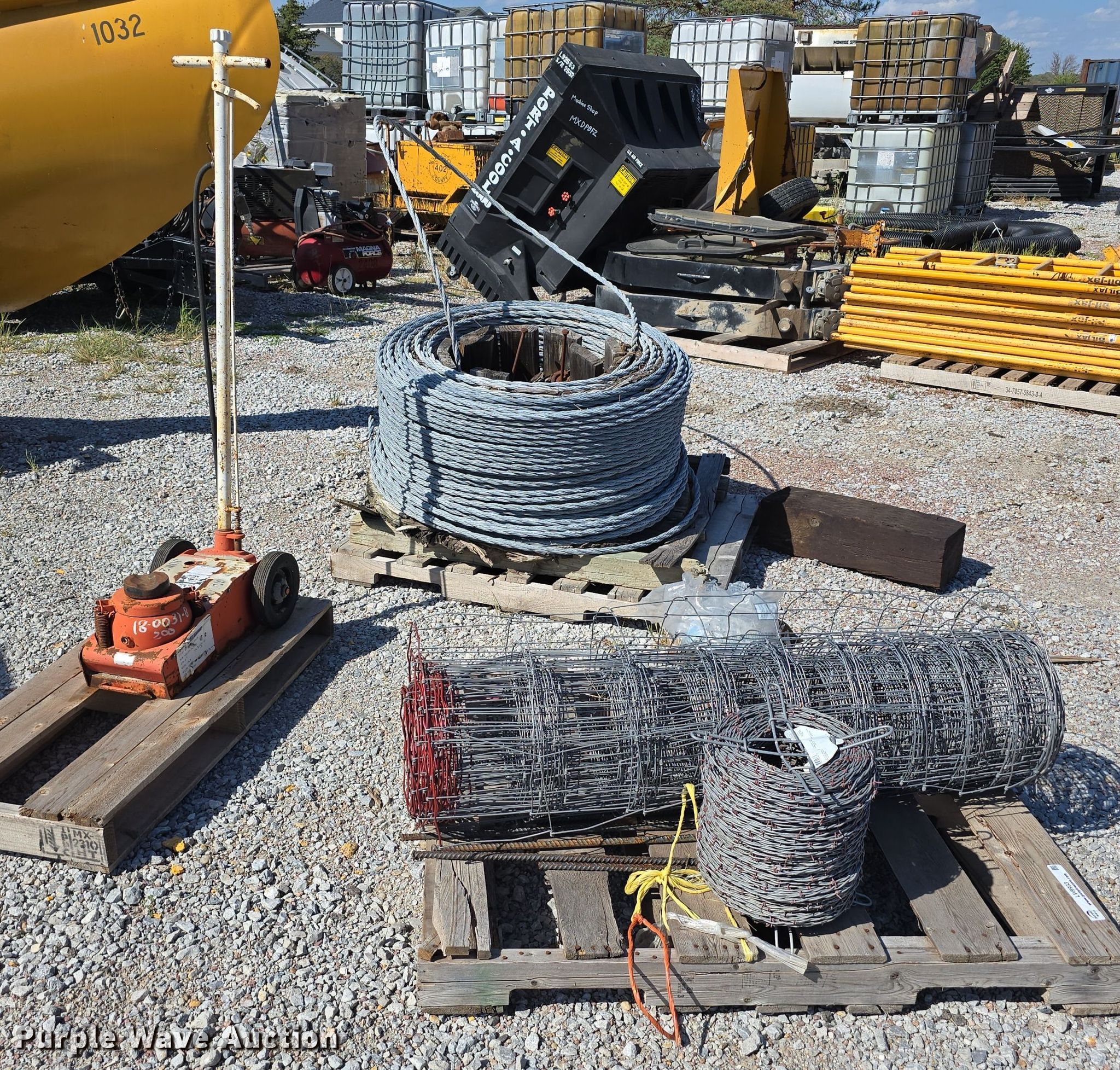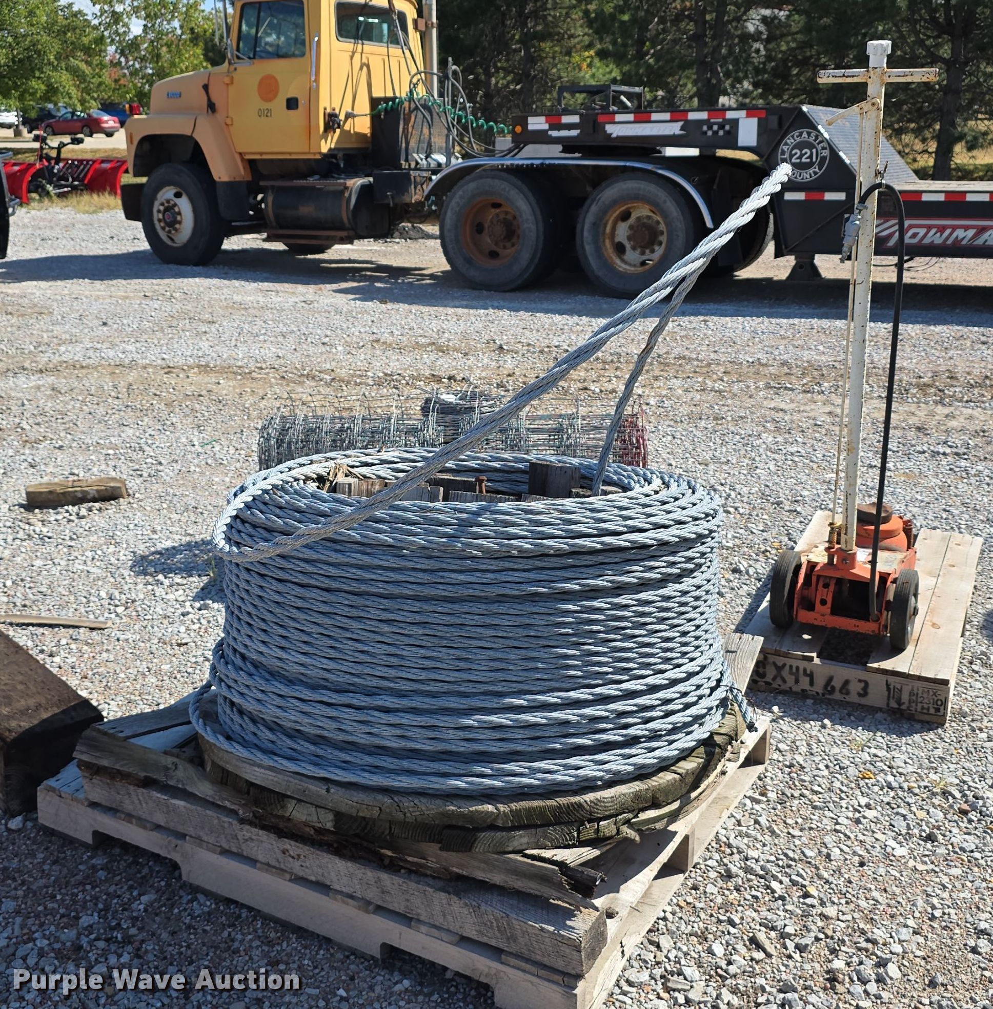 Fencing materials. Unit #: 3. Features Barb wire, Woven wire Height: 46", Fencing clips, Cable spool, Jack Norco 74400, Capacity: 44 tons. Notes Unknown operating condition. Lancaster County Engineers Office. Lincoln, NE 68528