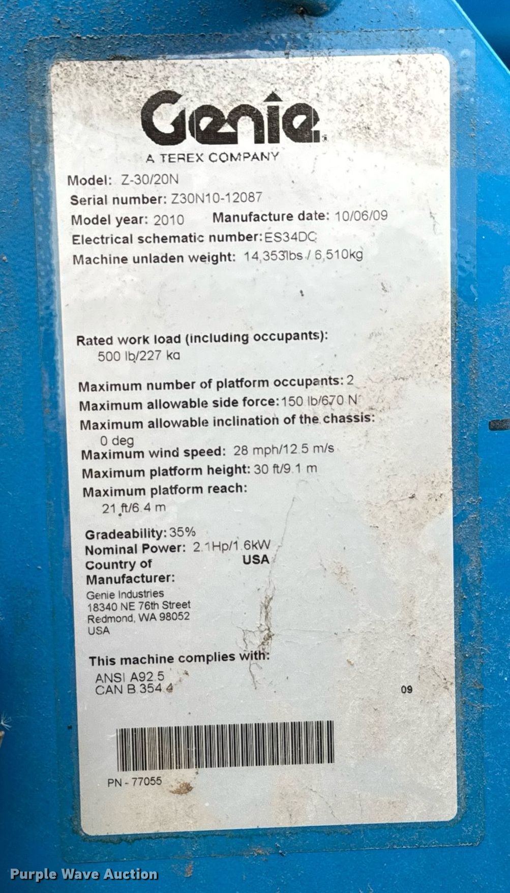 Purple Wave is selling a used Boom Lift in Kansas. This item is a 2010 Genie Z-30/20N boom lift with the following: Hours: 239 on meter, Serial: Z30N10-12087