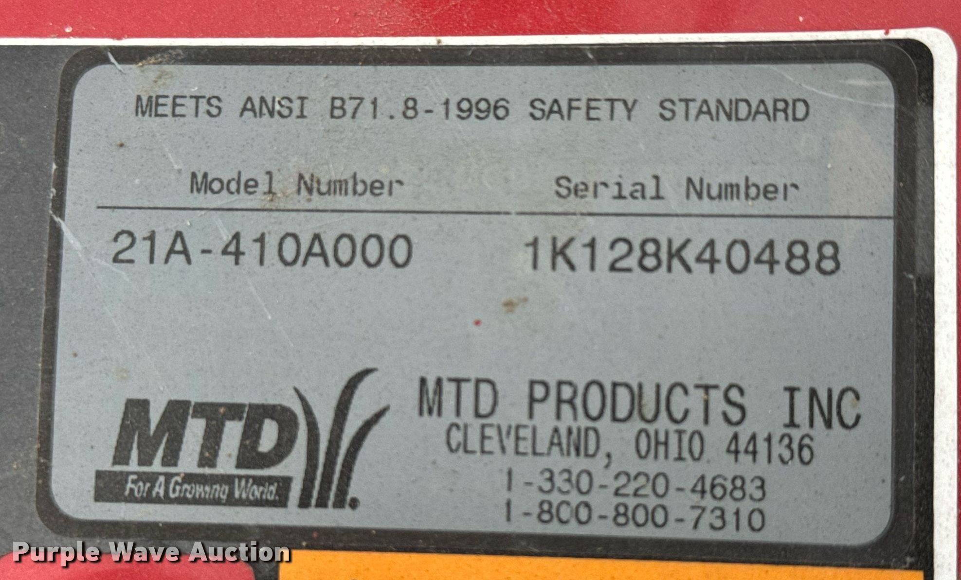 Purple Wave is selling a used Rotary Tillage in Kansas. This item is a MTD 21A-410A000 rototiller with the following: Overall width: 20", Serial: 1K128K40488