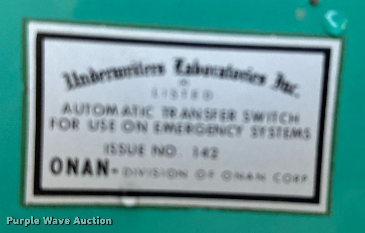 Onan 12.5JC-18R/16932AA generator. Serial: D760121390. Engine Onan JC, Cylinders: 4, Fuel type: Natural gas. Features Generator kVA: 15.6, kW: 12.5, Phase: Single, Three, Transfer switch Onan LTEU60-4/34E. Notes Unknown operating condition. Wichita Public Schools - USD 259. Wichita, KS 67219