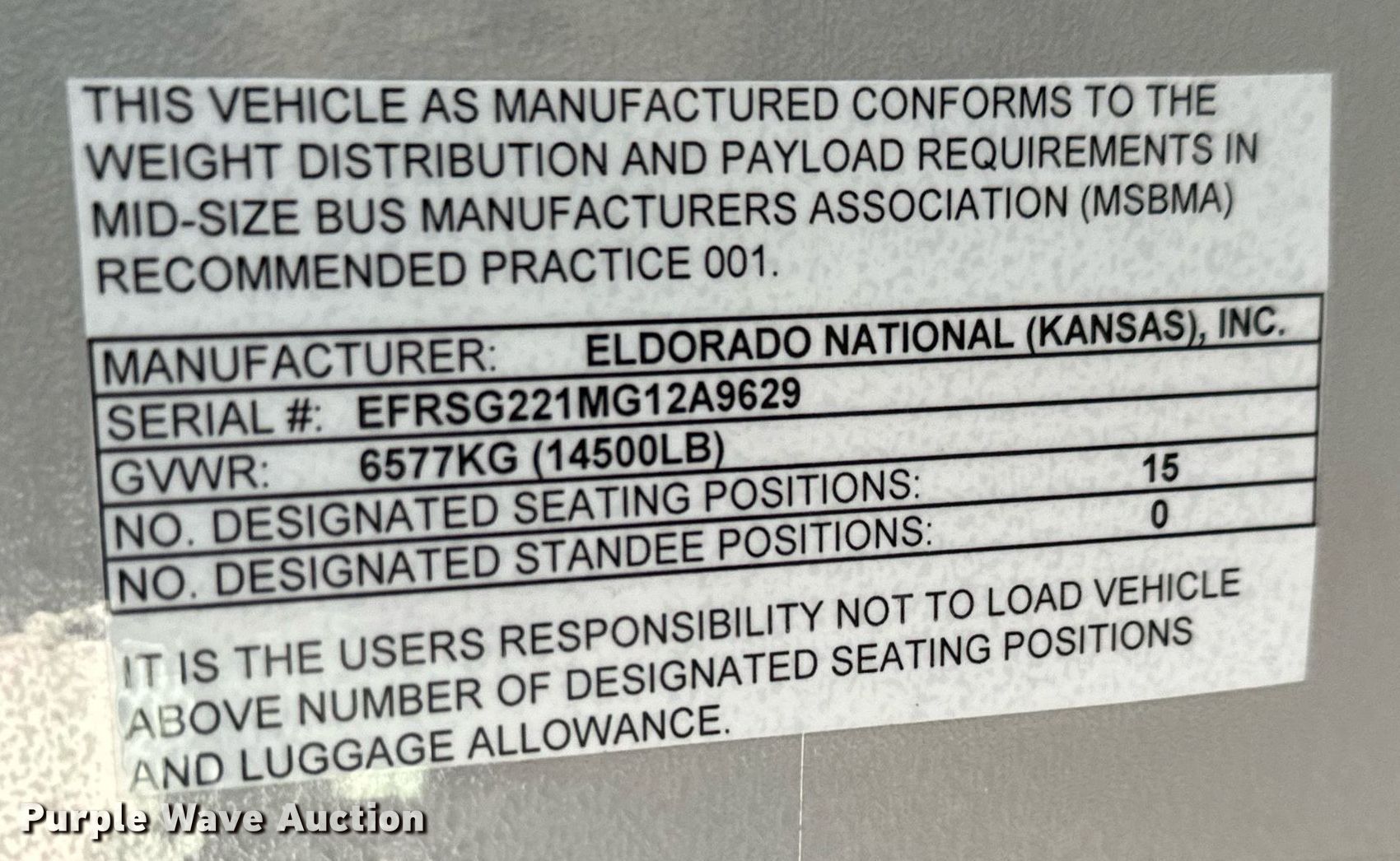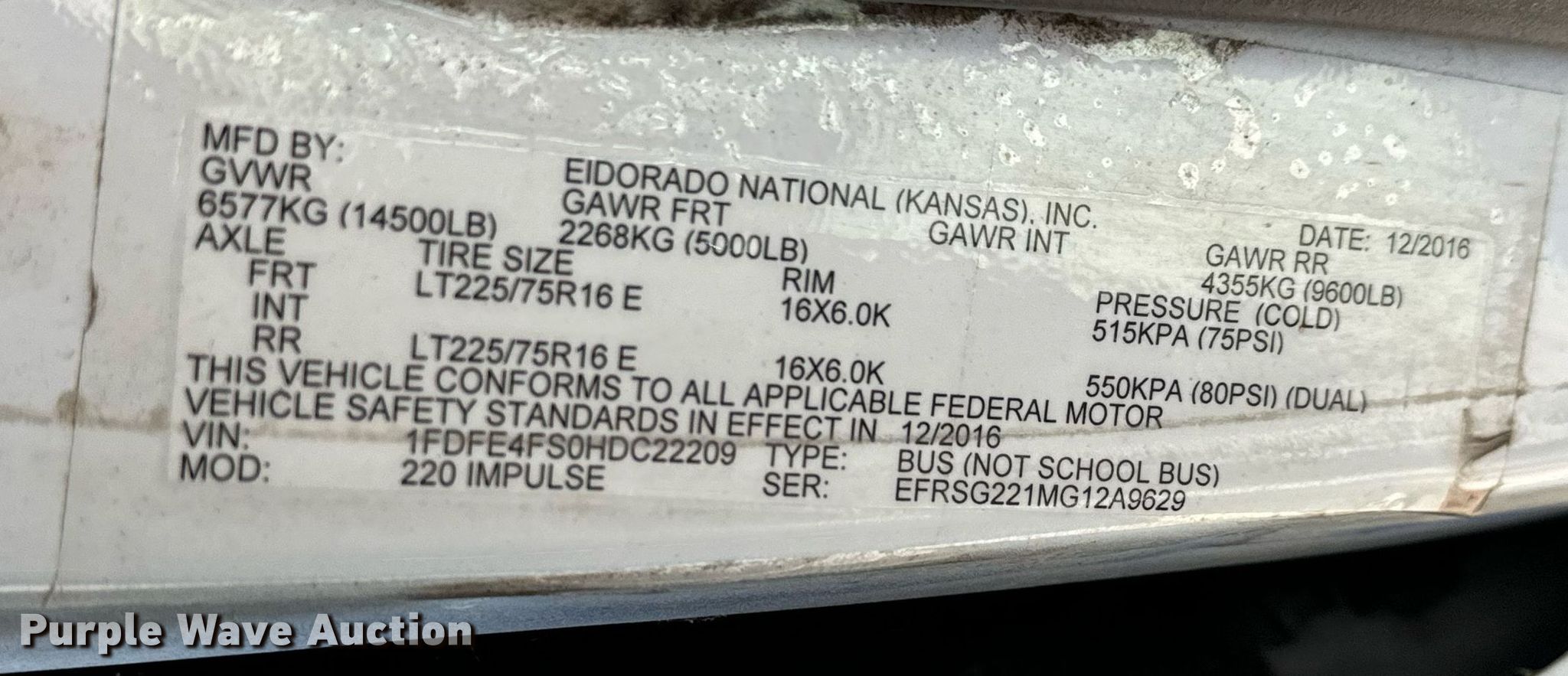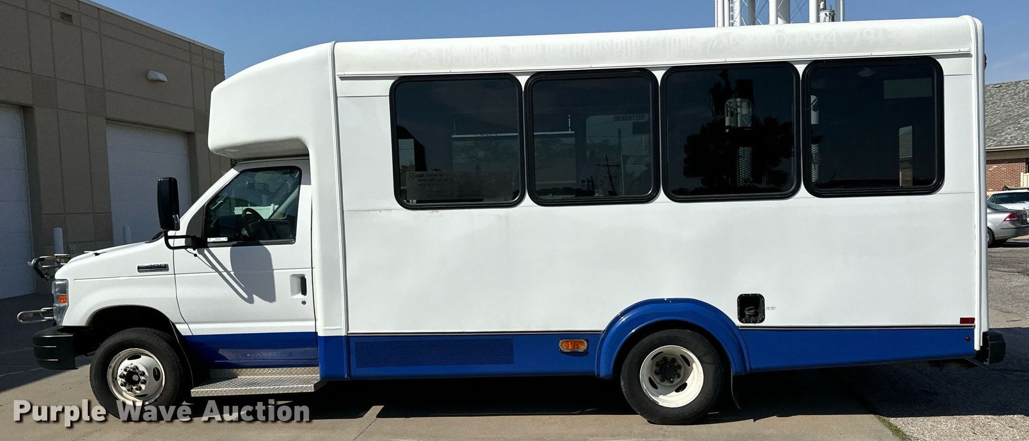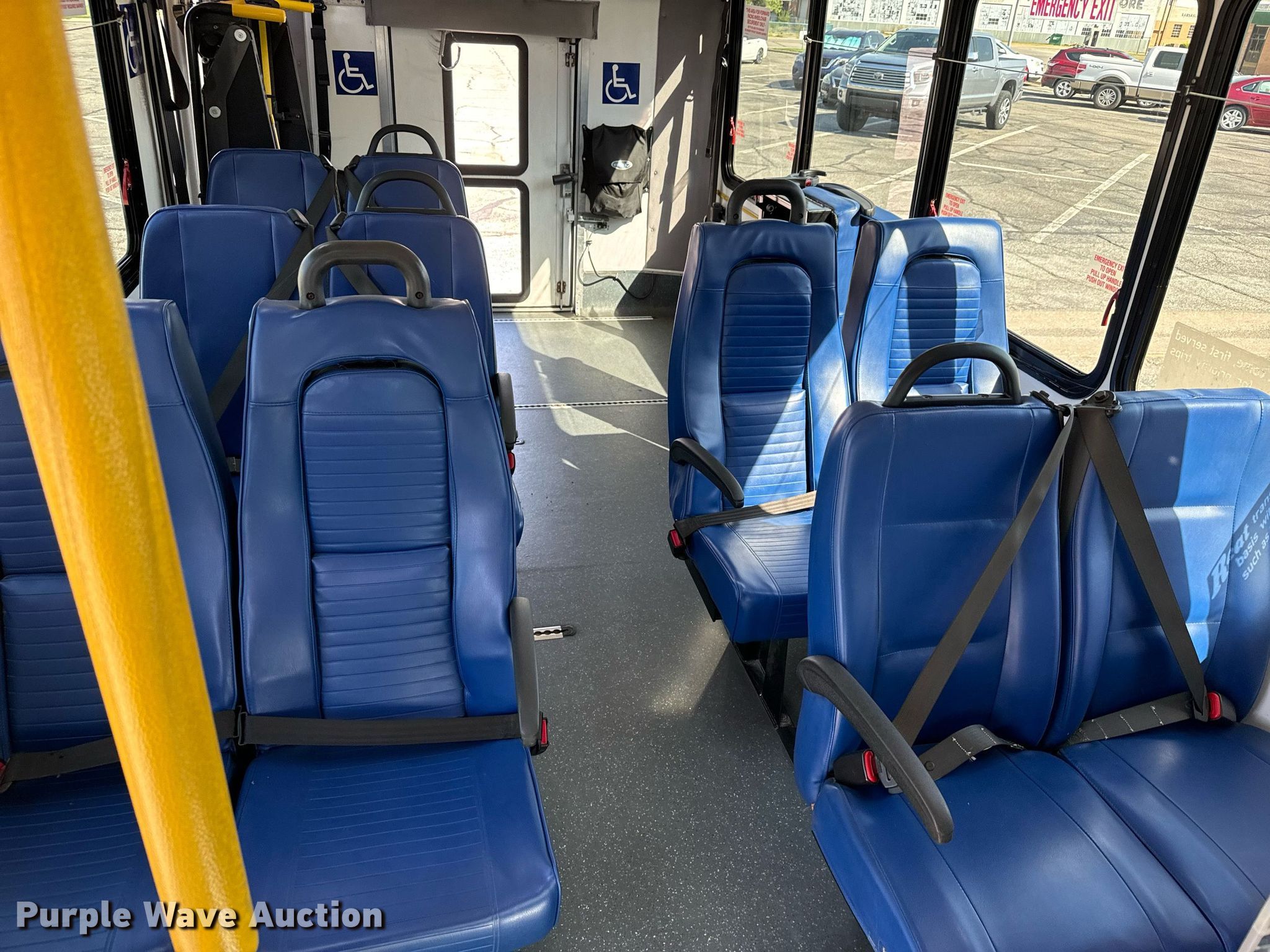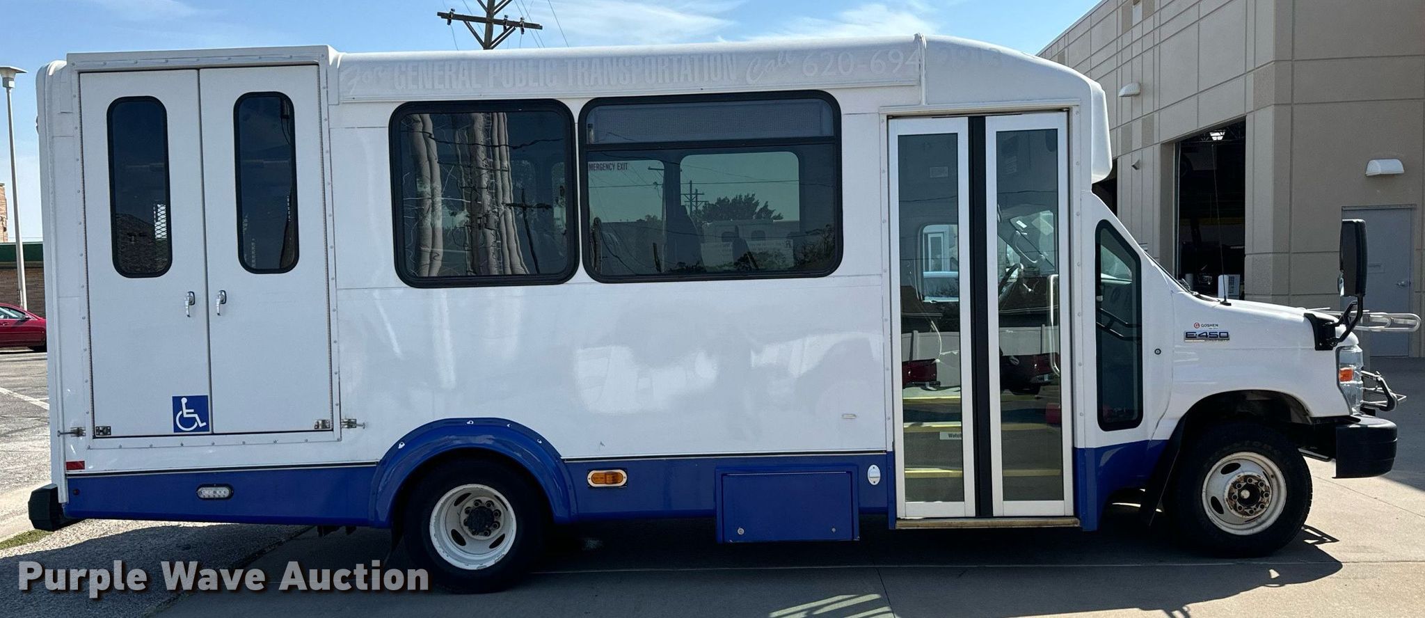 2017 Goshen Impulse Ford 220 shuttle bus. Miles: 222,693 on odometer, VIN: 1FDFE4FS0HDC22209. Engine Displacement: 6.8L, Cylinders: 10, Fuel type: Gas. Transmission Automatic. Chassis Axles: Single, Suspension: Spring, Brakes: Hydraulic, GVWR: 14,500 lbs, Wheelbase: 158". Interior AC, Heat, Heated mirrors, Cruise control, Auxiliary controls, Electric passenger sliding door, Passengers: 15, Wheelchair lift. Tires Size: 225/75R16. Notes Maintenance records available upon request at [email protected]. Kansas title. Title distribution may be delayed up to 14 days from verification of funds. Reno County Public Works. Hutchinson, KS 67501