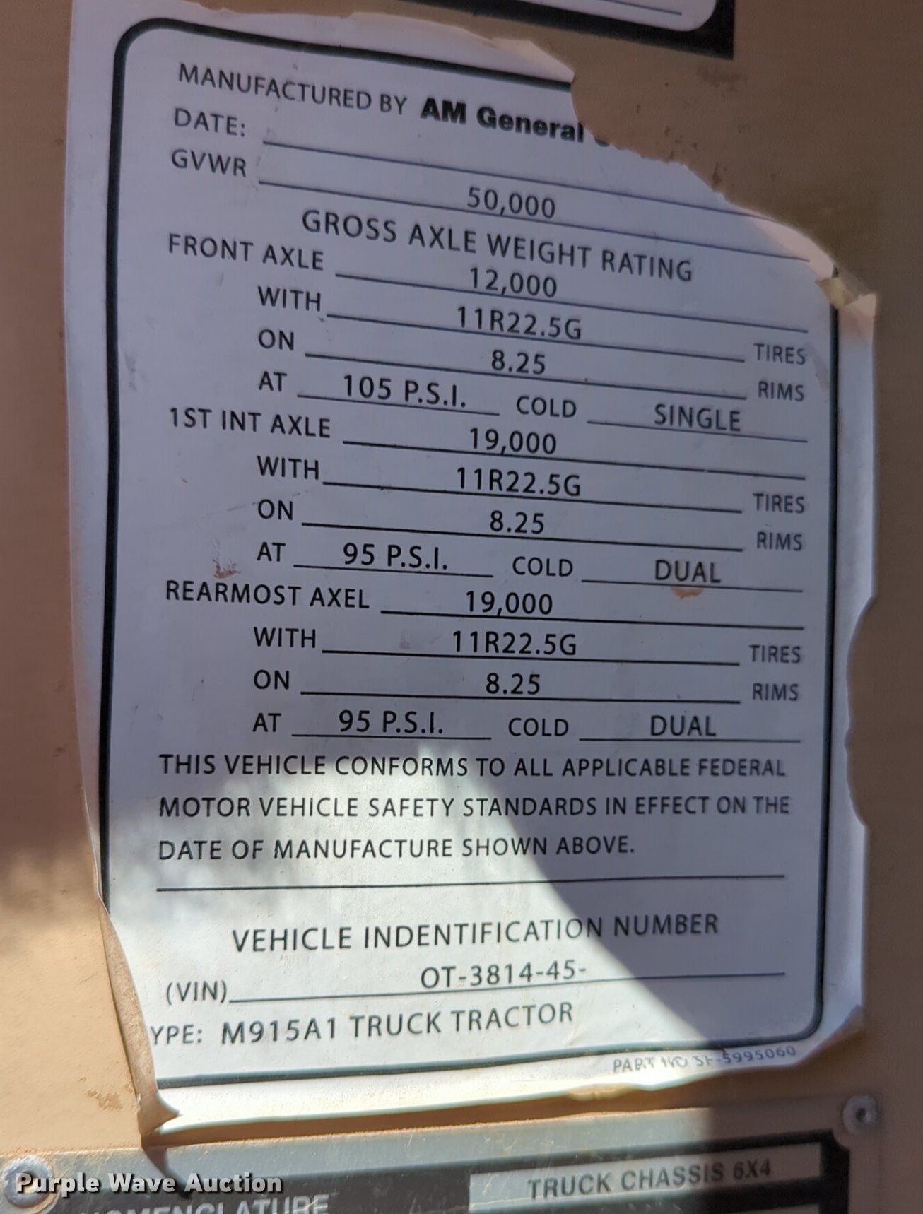 1984 AM General M-915-A1 truck cab and chassis. Miles: 131,036 on odometer, VIN: 1UTSH6685ES001570. Engine Cylinders: 6, Fuel type: Diesel. Transmission Automatic. Chassis Axles: Tandem, Differential lock: Inter-axle, Suspension: Spring, Brakes: Air, GVWR: 50,000 lbs. Features Fuel tank: Single. Tires Front: 11R24.5, Rear: 11R22.5. Oklahoma title. Title distribution may be delayed up to 30 days from verification of funds. Cleveland County. 14701 South Westminster Road. Oklahoma City, OK 73165