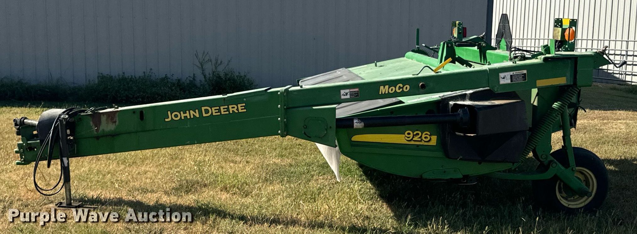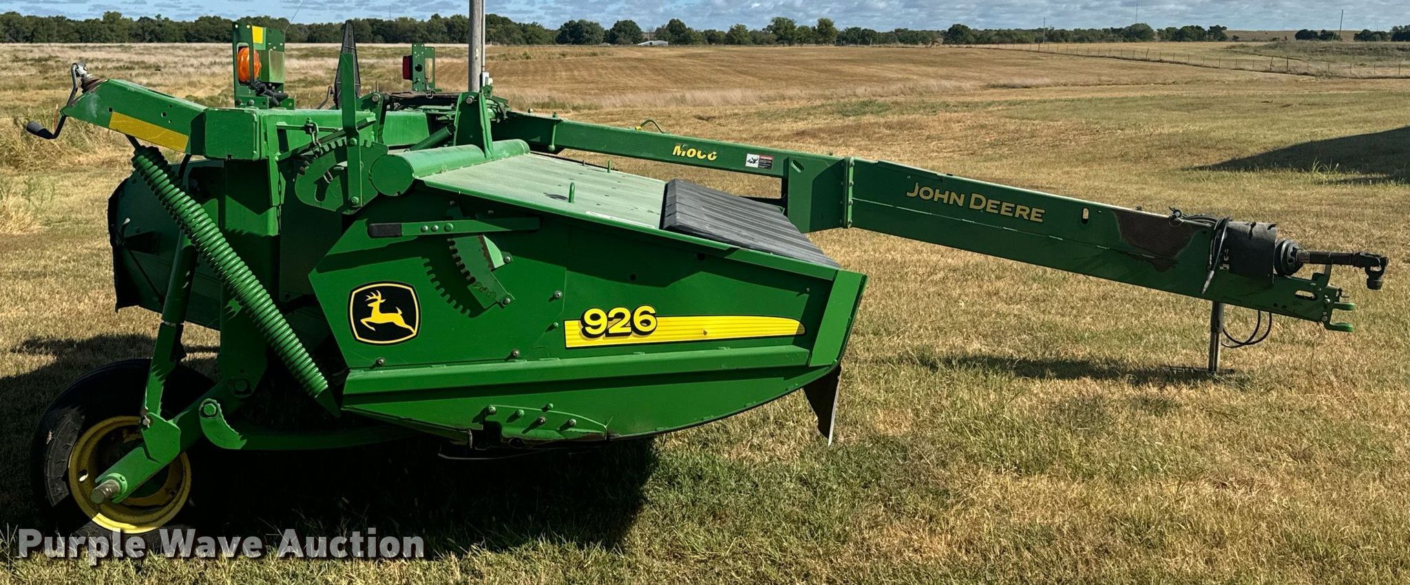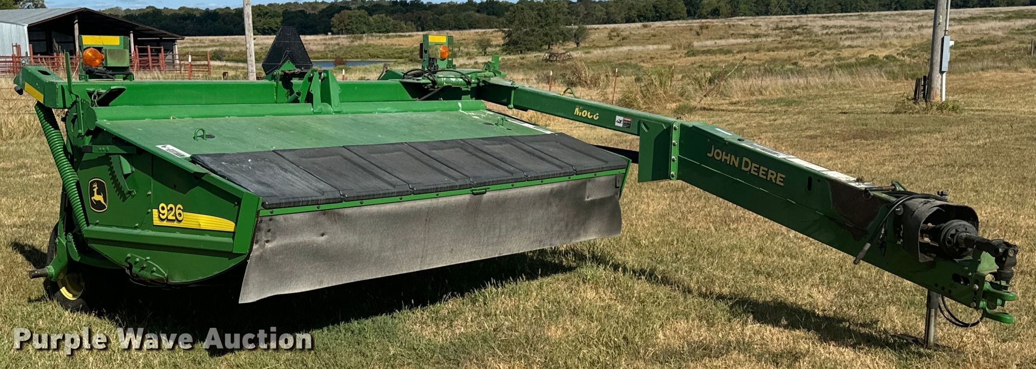 Purple Wave is selling a used Disc or Sickle Mower in Oklahoma. This item is a 2001 John Deere 926 disc mower with the following: Serial: E00926T171383