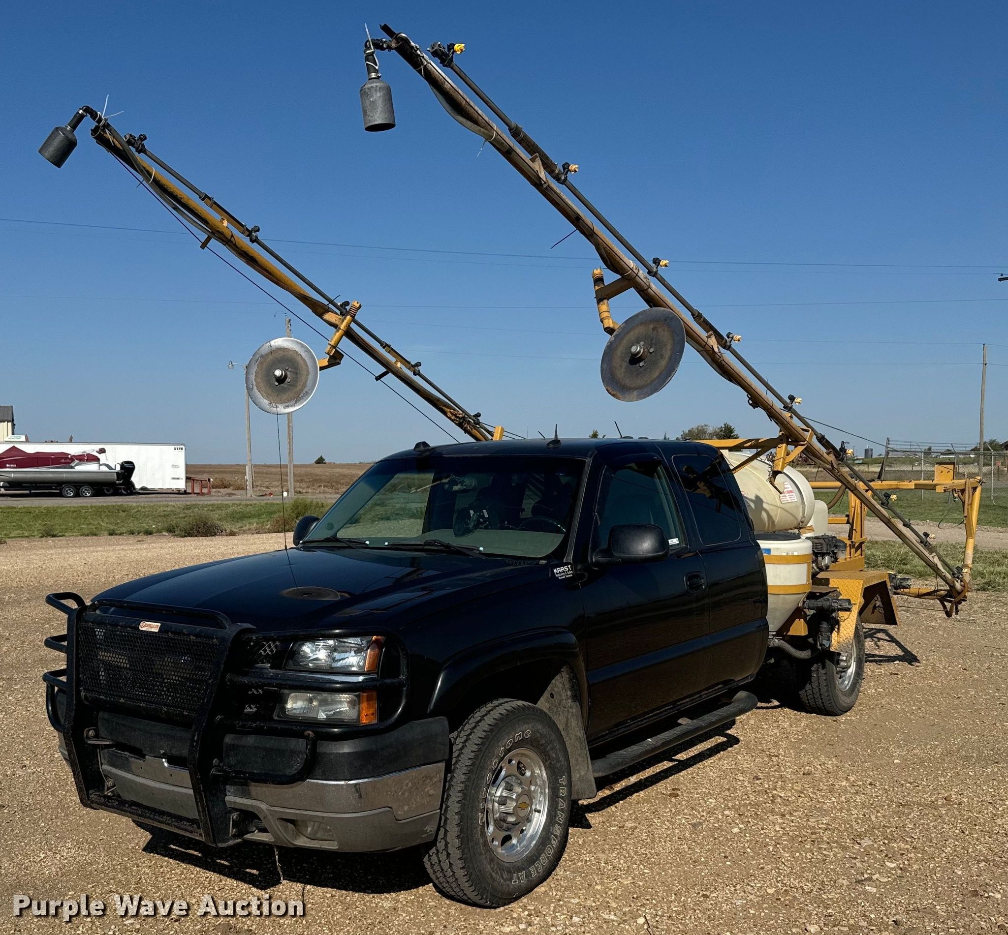 2004 Chevrolet Silverado 2500 LT Ext. Cab sprayer bed pickup truck. Miles: 154,931 on odometer, VIN: 1GCHK291X4E148282. Engine Displacement: 6.6L V8 OHV, Cylinders: 8, Fuel type: Diesel. Transmission Automatic. Chassis Four wheel drive. Operators station AC, Heat, Power windows, Power locks, Seats: Power driver, Power passenger, Heated. Features Solution tank Capacity: 300 gallons, Type: Poly, Chemical eductor Capacity: 16 gallons, Foam marker, Rinse tank Capacity: 45 gallons, Boom Width: 47', Sections: 3, Boom breakaway, Nozzle Spacing: 30", Nozzle bodies: Single, Fence row nozzles, Electronics GPS monitor Ravon Cruizer II, GPS receiver, Spray controls Raven SCS440.. Tires Size: 265/75R16. Notes Windshield chipped or cracked, Non-operational AC. Kansas non-highway title. Russell, KS 67665