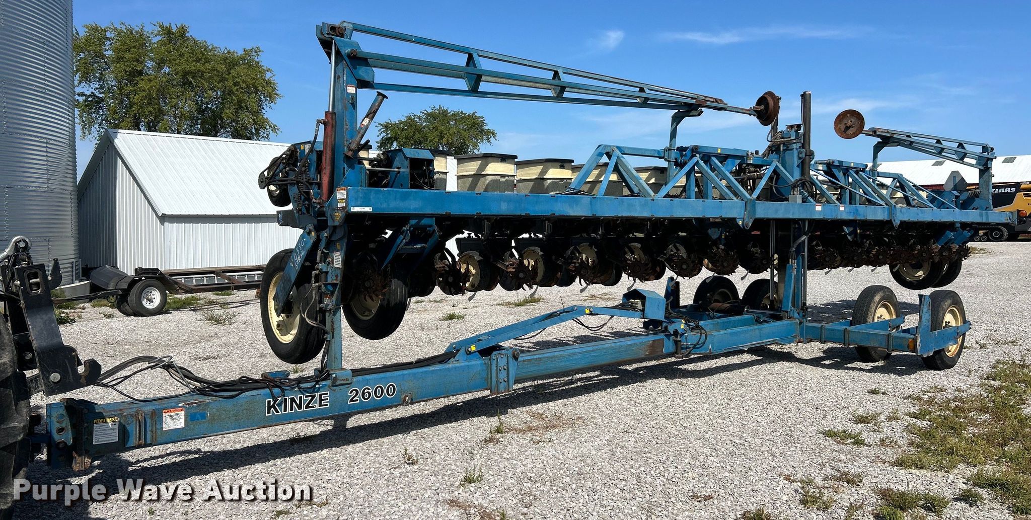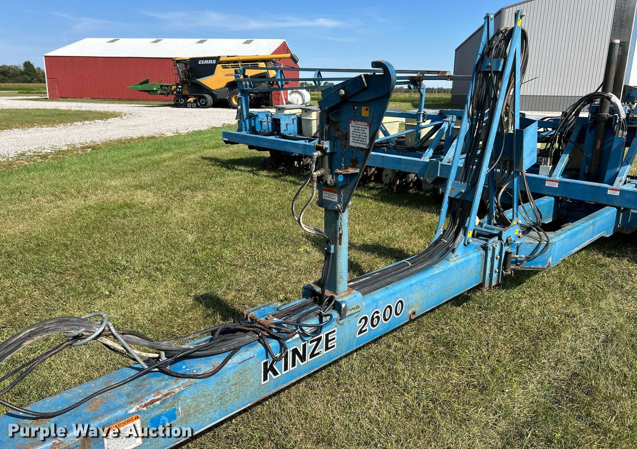 1995 Kinze 2600 planter. Row units: 16, Row spacing: 30", Serial: 610380. Features Frame Marker arm, Fold type: Pivot, Seed delivery Individual seed hoppers, Row units Meter drive: Ground, Seed meters: Corn, Soybeans, Down pressure: Spring, Row cleaners, Seed firmers, Disk openers: Double, Gauge wheels: Double, Closing system: Double Type: Rubber, Hopper extensions. Tires Transport tire size: 7.50-20 Quantity: 4, Drive/ outside tire size: 7.50-20. Richardson Farms. Centralia, IL 62801