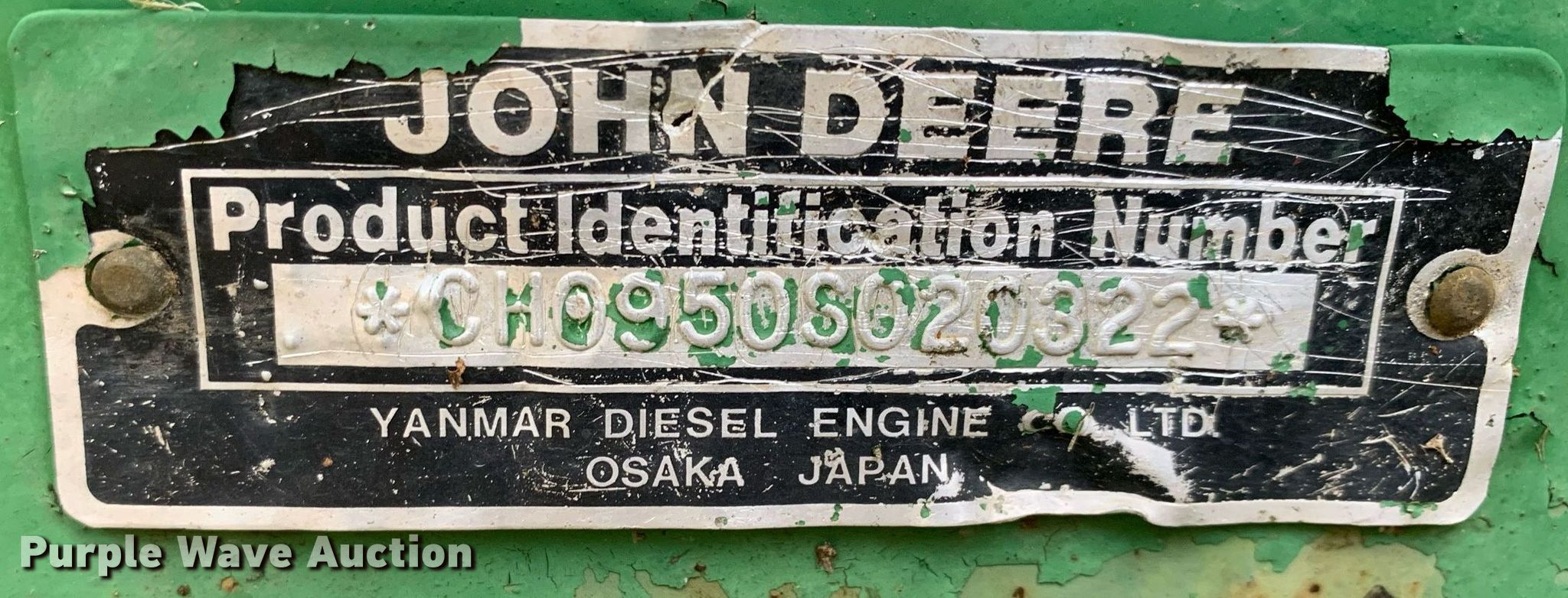 1984 John Deere 950 MFWD tractor. Hours: 1,650 on meter, Serial: CH0950S020322. Engine Yanmar 3T90J, Serial: CH3057D207605, Displacement: 1.7L, Cylinders: 3, Fuel type: Diesel. Transmission Manual, 8F - 2R, Differential lock. Features PTO: 540, Three point, Loader Bush Hog 2246QT, Controls: Joystick, Bucket Width: 62".. Tires Front: 7-16, Rear: 12.4-28. HeavyRig Equipment Sales & Rental. Hot Springs, AR 71913