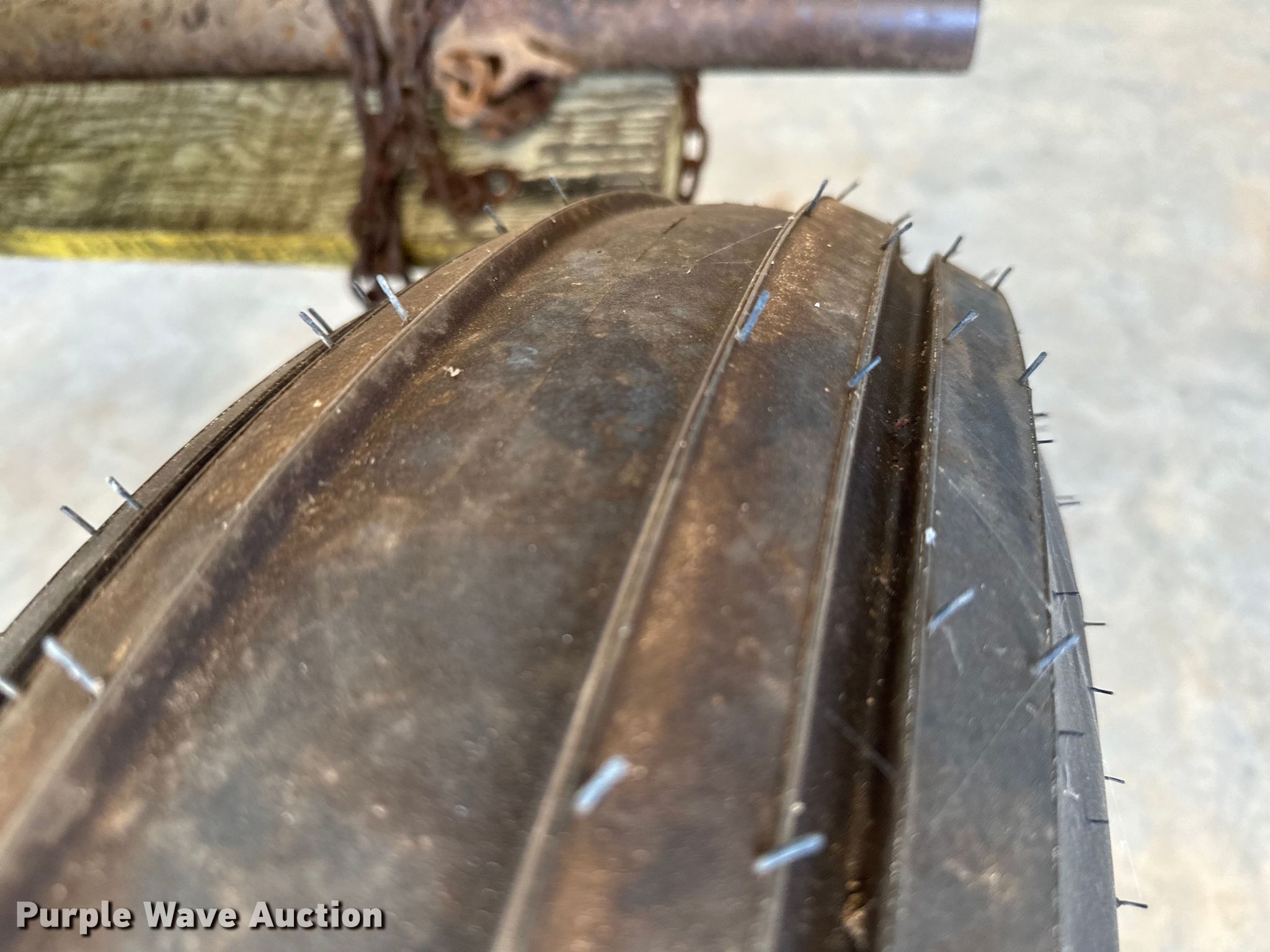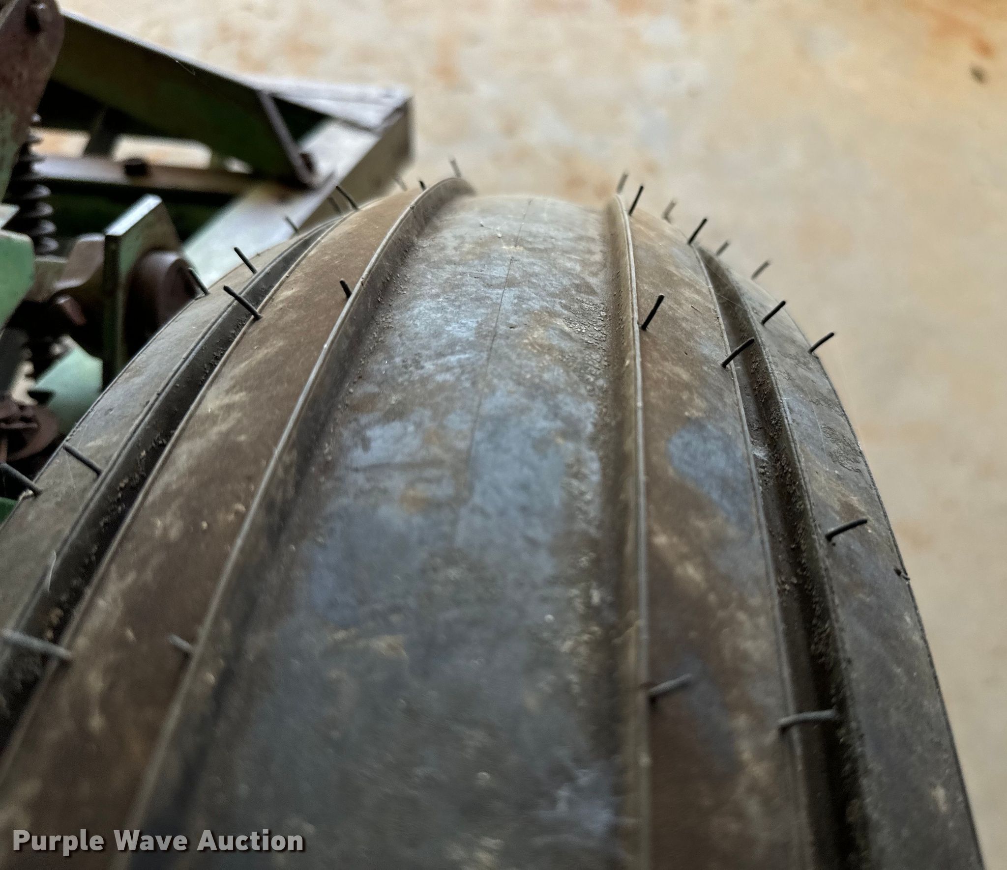 John Deere E0DRB grain drill. Width: 13', Row units: 16, Row spacing: 10", Serial: 066100M. Features Seed delivery Bulk fill system, Row units Meter drive: Ground, Down pressure: Spring, Disk openers: Single, Gauge wheels: Single. Tires Transport tire size: 7.50-20. Trillium Construction Co.. Loving, TX 76460