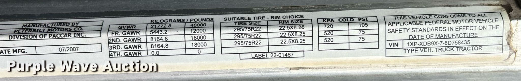 Purple Wave is selling a used Truck Tractor in California. This item is a 2008 Peterbilt 389 semi truck with the following: Miles: 1,417,378 on odometer, Hours: 44,899 on meter, VIN: 1XPXDB9X78D758435, Unit #: 32