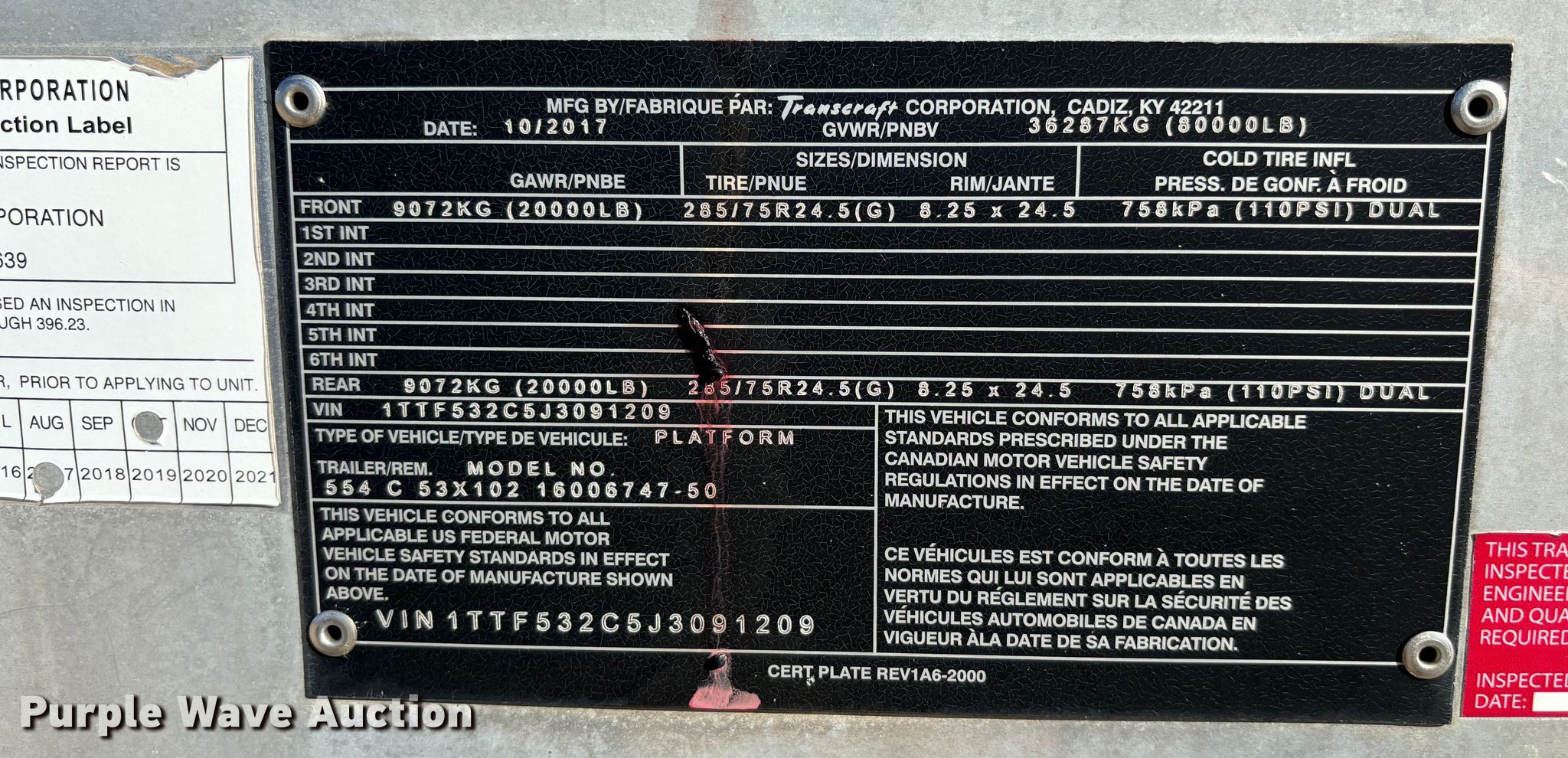 2018 Transcraft flatbed trailer. VIN: 1TTF532C5J3091209. Dimensions Overall: 53' L x 102" W. Features Deck type: Aluminum. Chassis Landing gear: Dual, Suspension: Air, Brakes: Air, Axles: Spread. Tires Aluminum wheels, Size: 285/75R24.5. Texas title. Title distribution may be delayed up to 14 days from verification of funds. Decatur, TX 76234