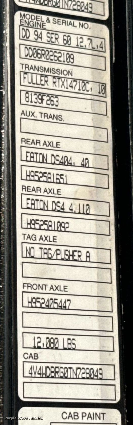 1996 Volvo WIA semi truck. Miles: 22,366 on odometer Actual milage unknown, VIN: 4V4WDBRG0TN728049. Engine Detroit Diesel Series 60, Displacement: 12.7L, Cylinders: 6, Fuel type: Diesel, Engine brake. Transmission Eaton Fuller, Manual, Speed: 10. Chassis Axles: Tandem, Differential lock: Inter-axle, Suspension: Air, Brakes: Air, GVWR: 50,080 lbs. Interior AC, Heat, Heated mirrors, Cruise control, Air ride cab, Sleeper Sleeper length: 5', Beds: Single. Features Deck plate: Steel, Fifth wheel type: Sliding, Fuel tank: Dual. Tires Size: 11R22.5. Missouri title. Mileage has not been verified. Exempt will be written in the odometer disclosure on the title. Title distribution may be delayed up to 14 days from verification of funds. Rea Trucking Co. Neosho, MO 64850