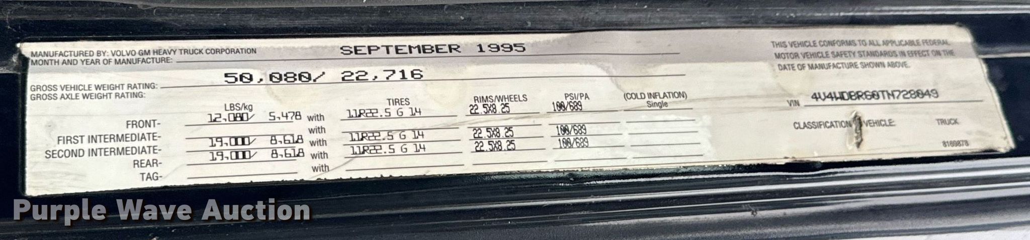 Purple Wave is selling a used Truck Tractor in Missouri. This item is a 1996 Volvo WIA semi truck with the following: Miles: 22,366 on odometer, Actual milage unknown, VIN: 4V4WDBRG0TN728049