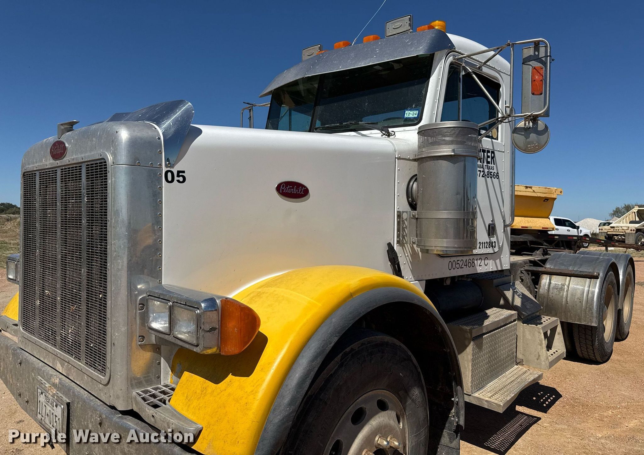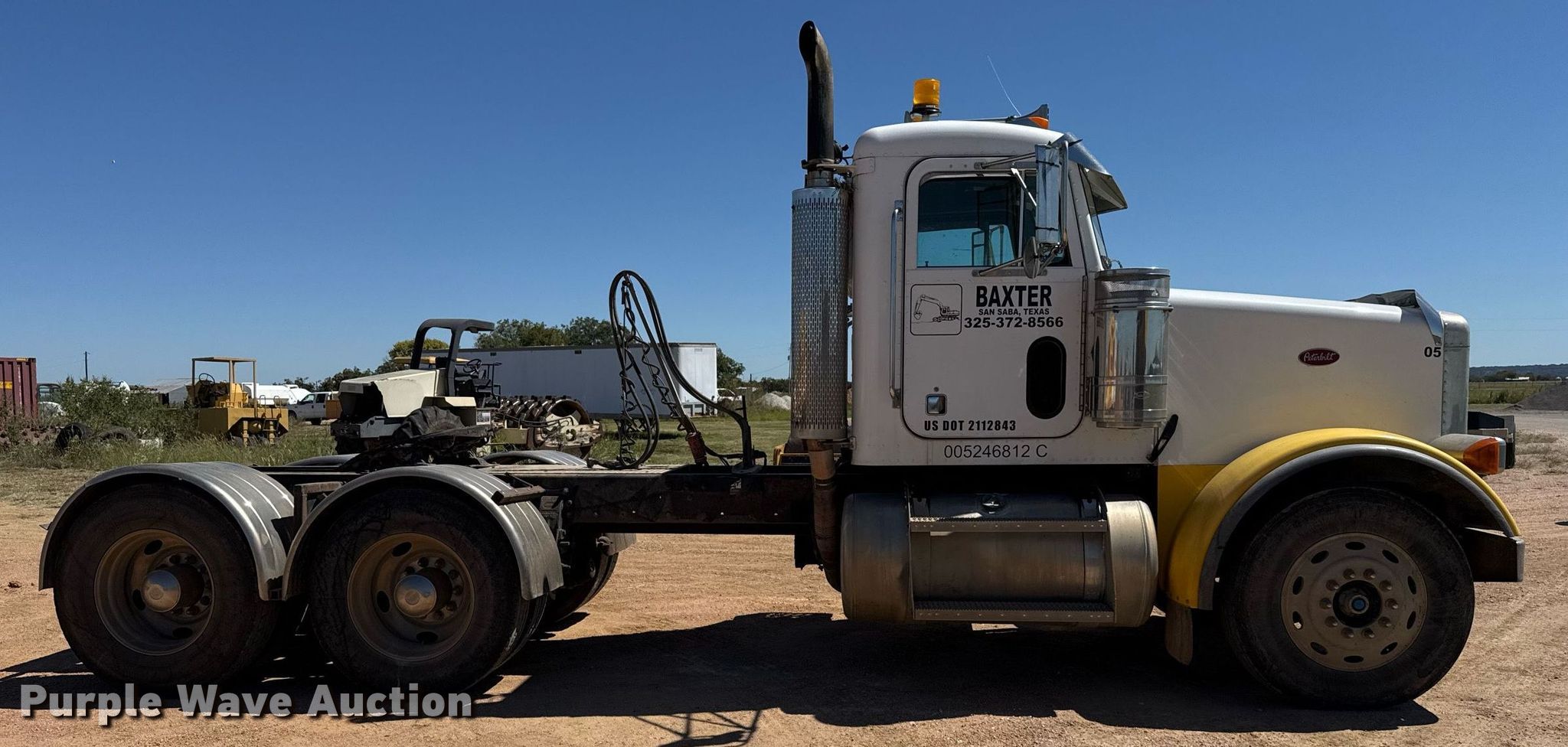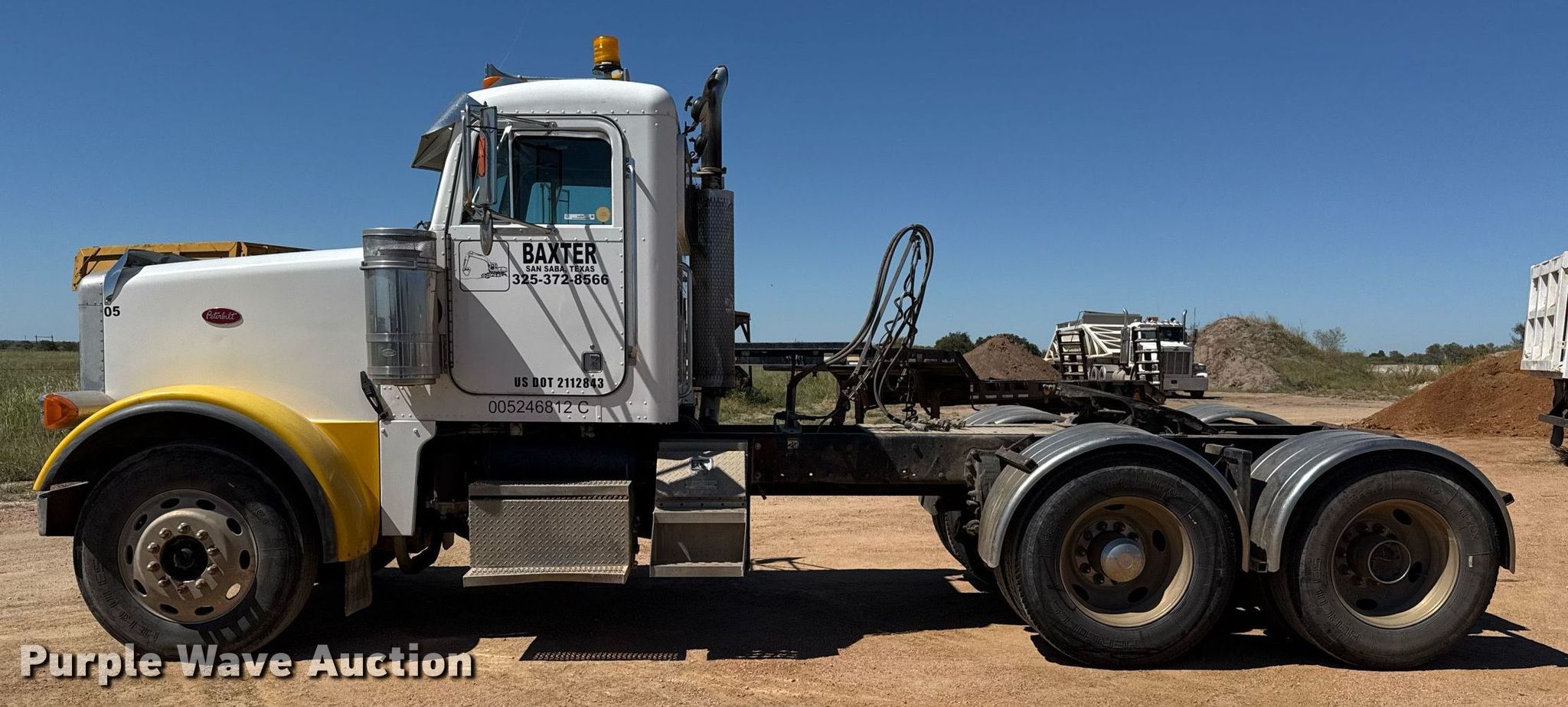 1999 Peterbilt 378 semi truck. Miles: 628,524 on odometer, VIN: 1XPFDB9X6XD466897, Unit #: 05. Engine Caterpillar 3406, Serial: 2WS11448, Displacement: 14.6L, Cylinders: 6, Fuel type: Diesel, HP: 475, kW: 354, Engine brake. Transmission Manual, Speed: 10. Chassis Axles: Tandem, Differential lock: Inter-axle, Suspension: Air Dump valves, Brakes: Air, PTO, GVWR: 56,000 lbs FAWR: 12,000 lbs, IAWR: 22,000 lbs, RAWR: 22,000 lbs. Interior AC, Heat, Heated mirrors, Cruise control, Air ride cab. Features Deck plate: Aluminum, Fifth wheel type: Fixed, Fuel tank: Dual. Tires Size: 11R24.5. Notes Windshield chipped or cracked. Texas title. Title distribution may be delayed up to 14 days from verification of funds. Baxter Sand and Gravel. San Saba, TX 76877