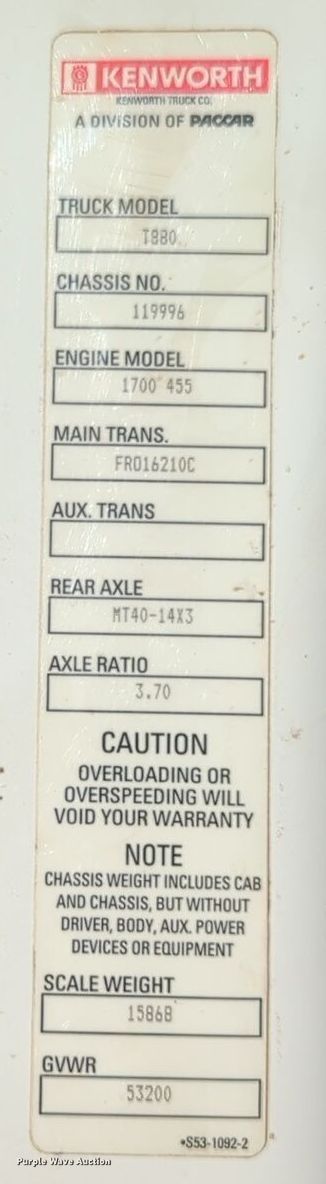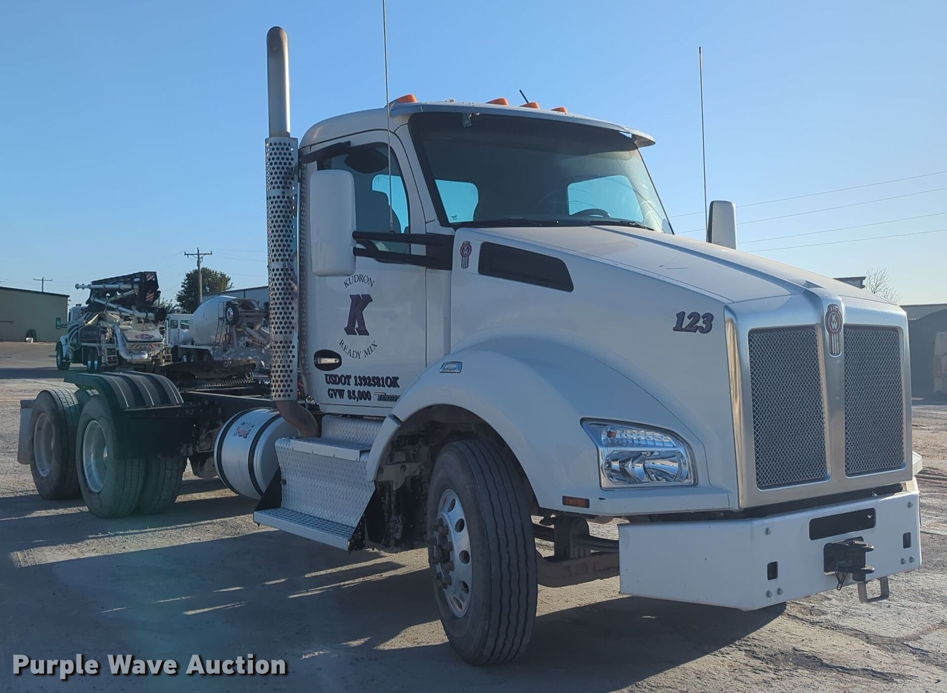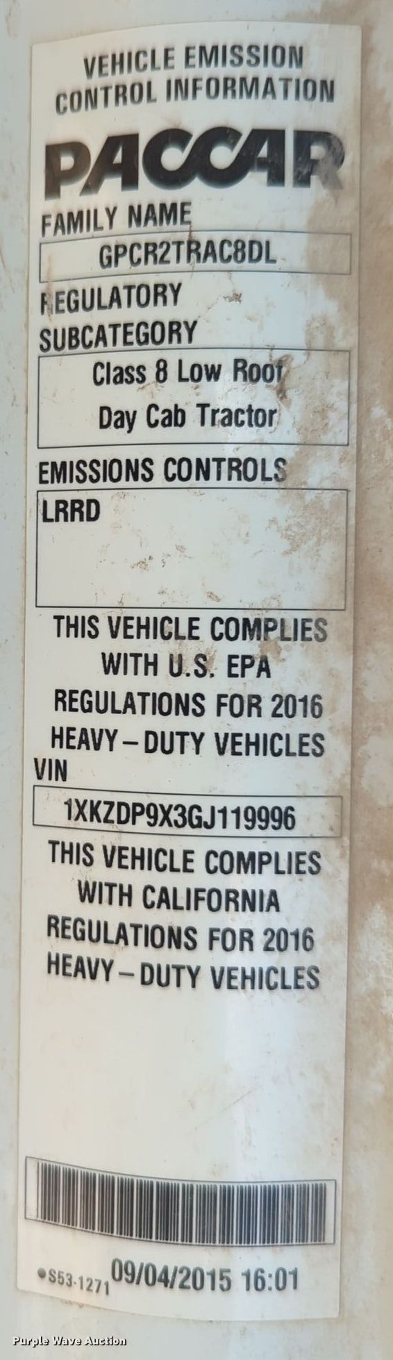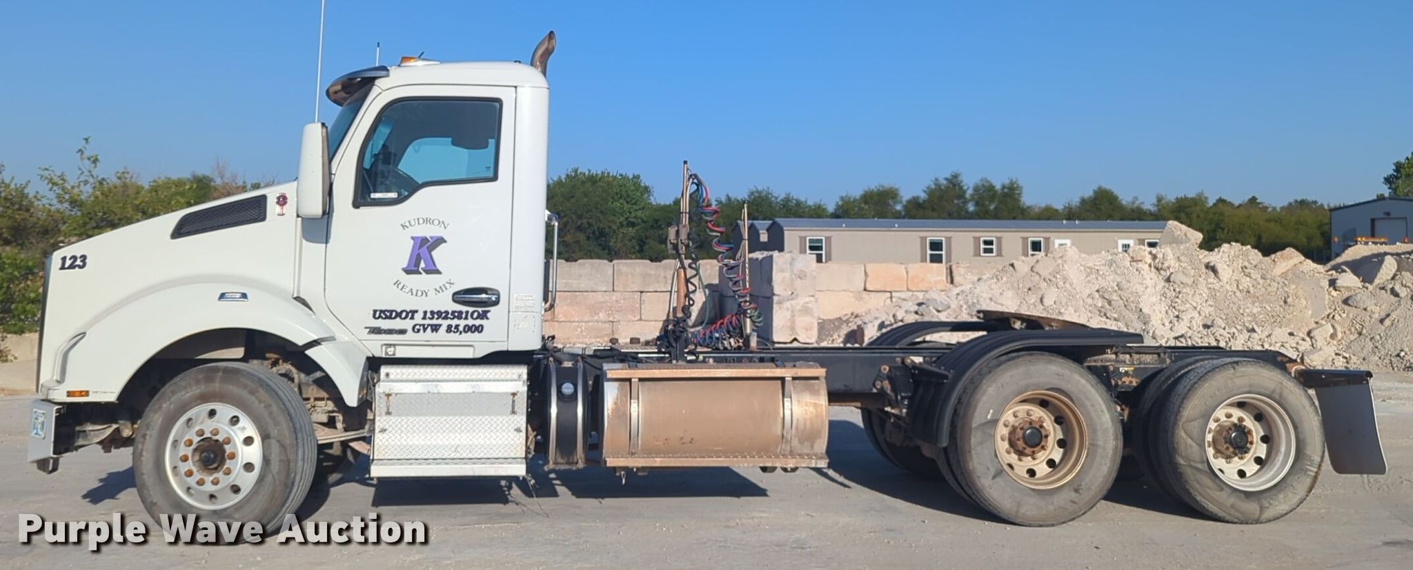 2016 Kenworth T880 semi truck. Miles: 707,790 on odometer, VIN: 1XKZDP9X3GJ119996. Engine Paccar MX-13, Serial: Y091565, Displacement: 12.9L, Cylinders: 6, Fuel type: Diesel, Engine brake. Transmission Eaton Fuller, Manual, Speed: 10. Chassis Axles: Tandem, Differential lock: Inter-axle, Suspension: Air Dump valves, Brakes: Air, PTO, Wet kit, GVWR: 53,200 lbs FAWR: 12,300 lbs, IAWR: 20,000 lbs, RAWR: 20,000 lbs. Interior AC, Heat, Heated mirrors, Power windows, Power locks, Cruise control, Air ride cab. Features Deck plate: Aluminum, Fifth wheel type: Air operated, Sliding, Fuel tank: Single. Tires Size: 11R22.5. Notes Dash warning indicator: Check engine, Regen. Oklahoma title. Title distribution may be delayed up to 30 days from verification of funds. Kudron Ready Mix. 15244 Northwest Expressway. Piedmont, OK 73078