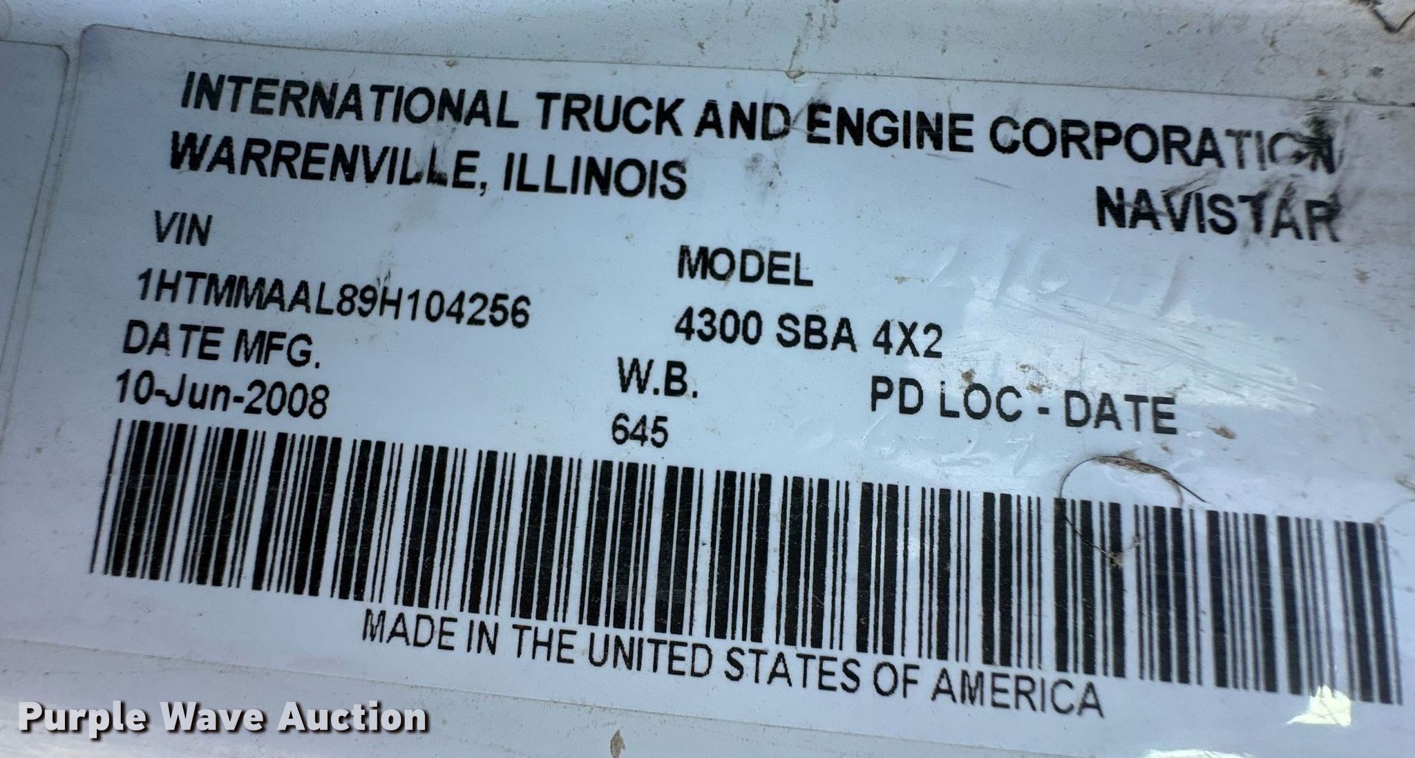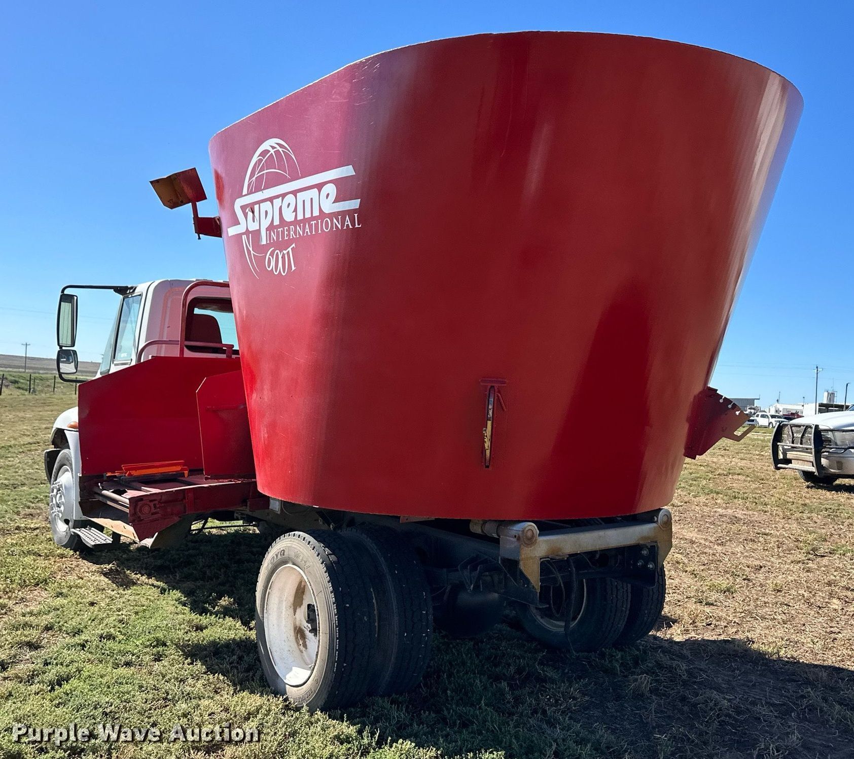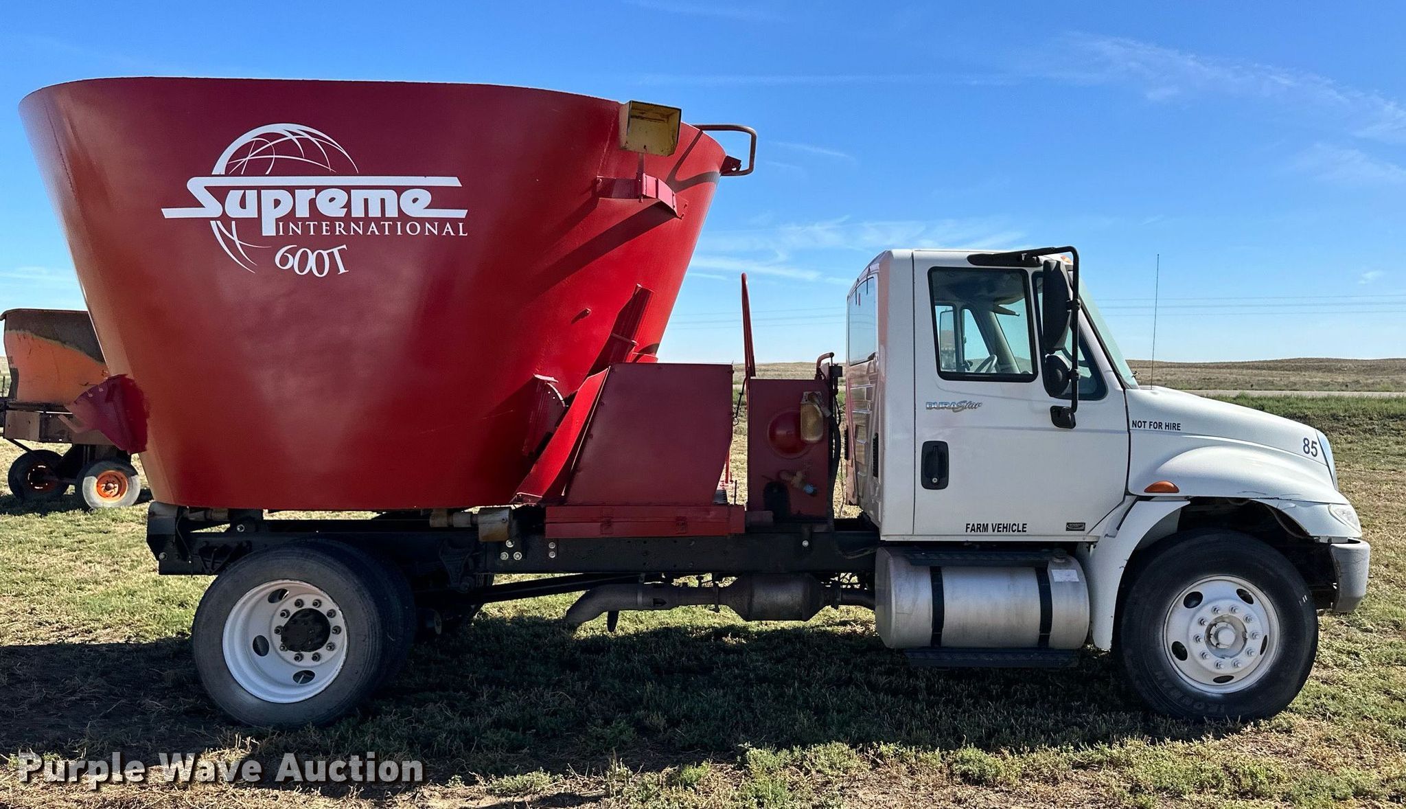 2009 International DuraStar 4300 feed mixer truck. Miles: 291,032 on odometer Actual mileage unknown, VIN: 1HTMMAAL89H104256. Engine International HT466, Displacement: 7.6L, Cylinders: 6, Fuel type: Diesel. Transmission Automatic. Chassis Axles: Single, Suspension: Spring, Brakes: Air, PTO. Interior AC, Heat, Cruise control. Features Feed mixer bed Supreme 600T, Auger Quantity: 1, Discharge: Side Width: 32", Door: Hydraulic. Tires Size: 11R22.5. Notes Non-operational mixer bed, Mixer bed door hydraulic cylinder missing. Kansas title. Mileage has not been verified. Odometer discrepancy will be marked on the title. Fullmer Cattle. Syracuse, KS 67878