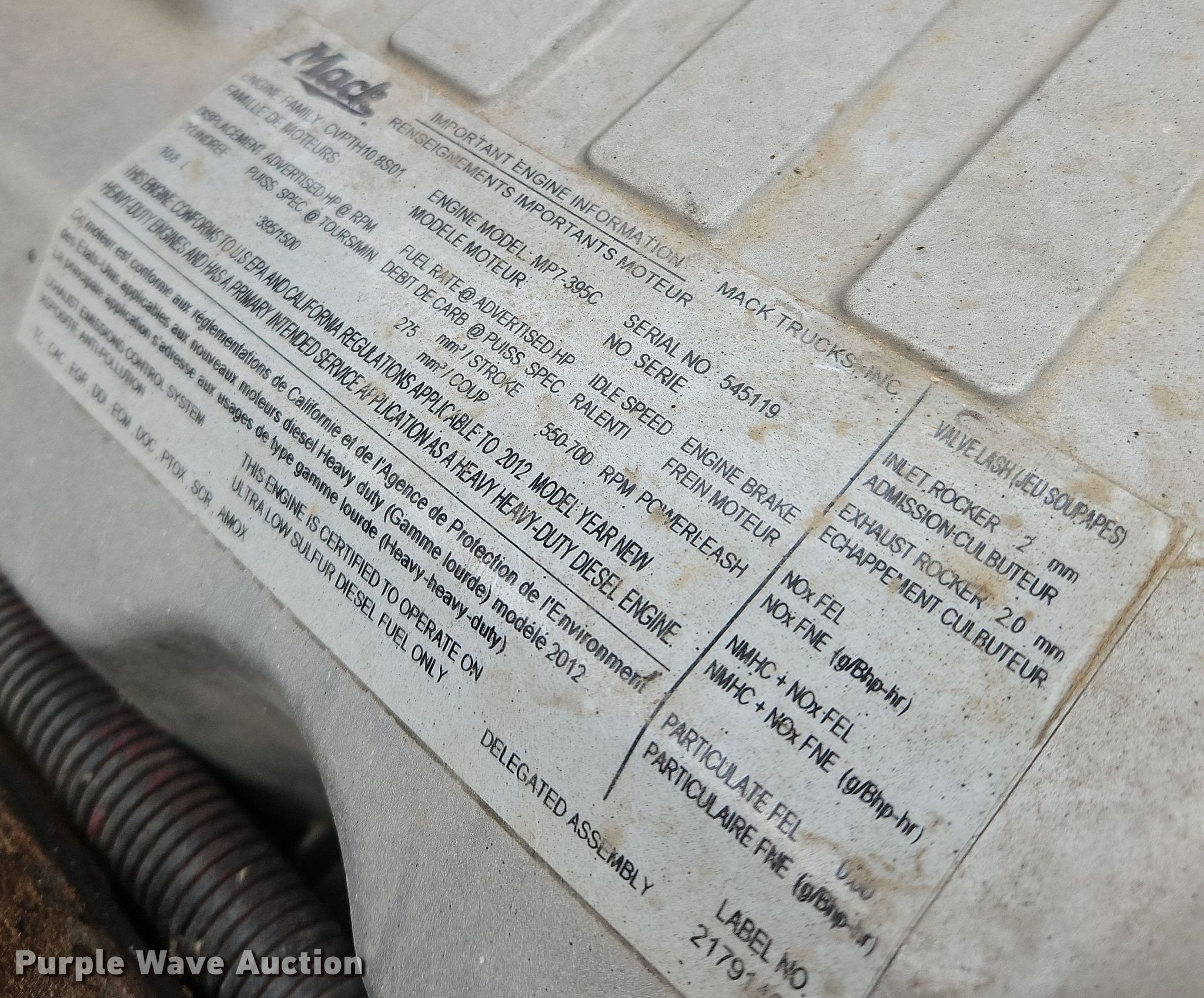 2013 Mack CXU semi truck. Miles: 704,696 on odometer, VIN: 1M1AW02Y1DM028989. Engine Mack MP7, Displacement: 10.8L, Cylinders: 6, Fuel type: Diesel. Transmission Eaton Fuller, Manual, Speed: 10. Chassis Axles: Tandem, Differential lock: Inter-axle, Suspension: Air Dump valves, Brakes: Air, GVWR: 52,000 lbs FAWR: 12,000 lbs, IAWR: 20,000 lbs, RAWR: 20,000 lbs. Interior AC, Heat, Power windows, Power locks, Cruise control. Features Deck plate: Aluminum, Fuel tank: Single. Tires Front: 295/75R22.5, Rear: 445/50R22.5. Notes Dash warning indicator: Check engine, Low coolant. Indiana title. Scott Dehart Farms. Trafalgar, IN 46181