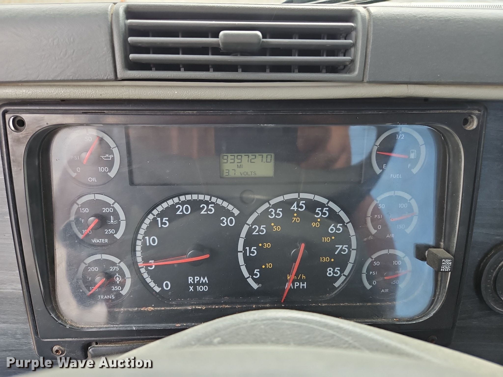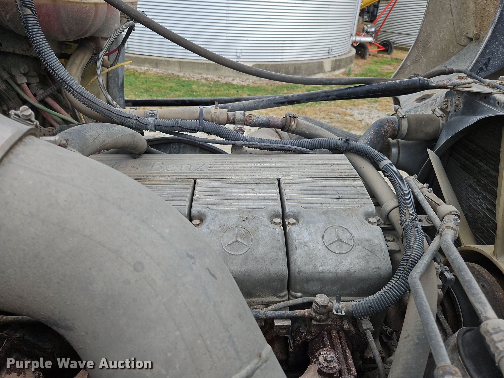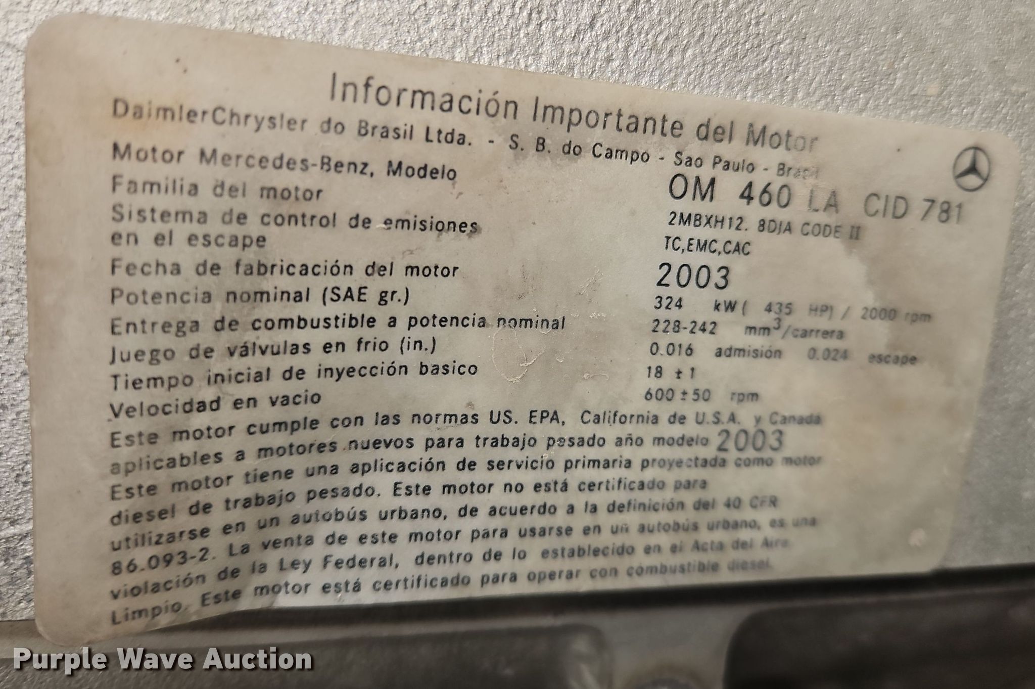 2004 Freightliner Columbia semi truck. Miles: 939,727 on odometer, VIN: 1FUJA6CV84LN03459. Engine Mercedes Benz, Displacement: 12.8L, Cylinders: 6, Fuel type: Diesel, Engine brake. Transmission Eaton Fuller, Manual, Speed: 10. Chassis Axles: Tandem, Differential lock: Inter-axle, Suspension: Air Dump valves, Brakes: Air, PTO. Interior AC, Heat, Power windows, Cruise control, Air ride cab. Features Deck plate: Aluminum, Fifth wheel type: Air operated, Sliding, Fuel tank: Dual. Tires Front: 11R22.5, Rear: 295/75R22.5. Notes Windshield chipped or cracked. Indiana title. Scott Dehart Farms. Trafalgar, IN 46181