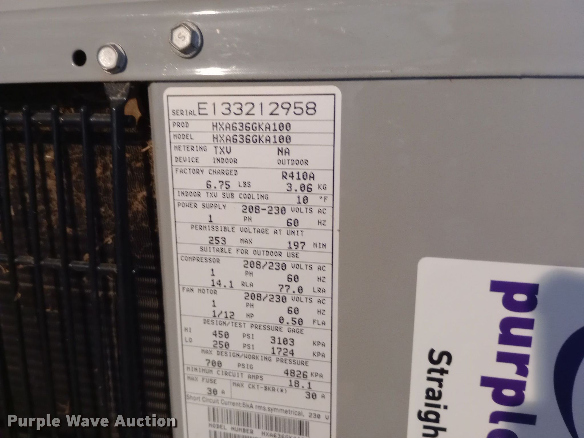 Purple Wave is selling a used Appliances in Kansas. This item is a AC / heat unit with the following: Arcoaire HXA636GKA100 AC, Serial: E133212958, Arcoaire N9MSE0801716A heater, Serial: A131849970, BTU: 80,000, Natural gas fired, Phase: Single, KDOT ID: 50631