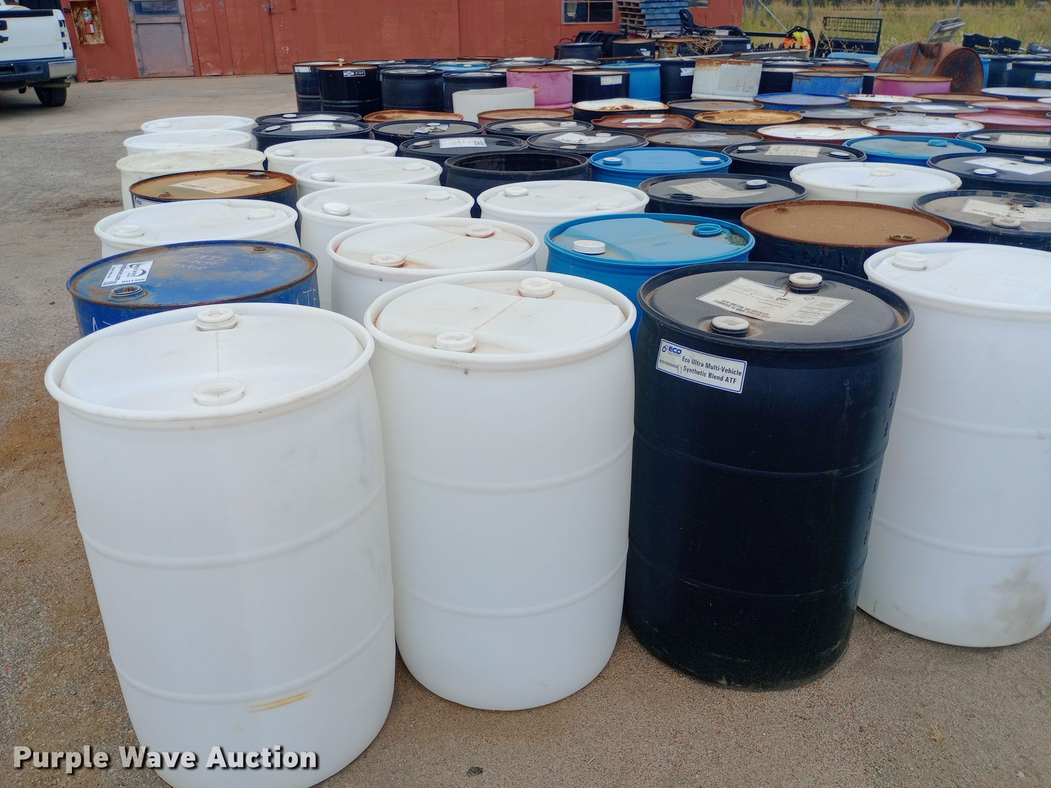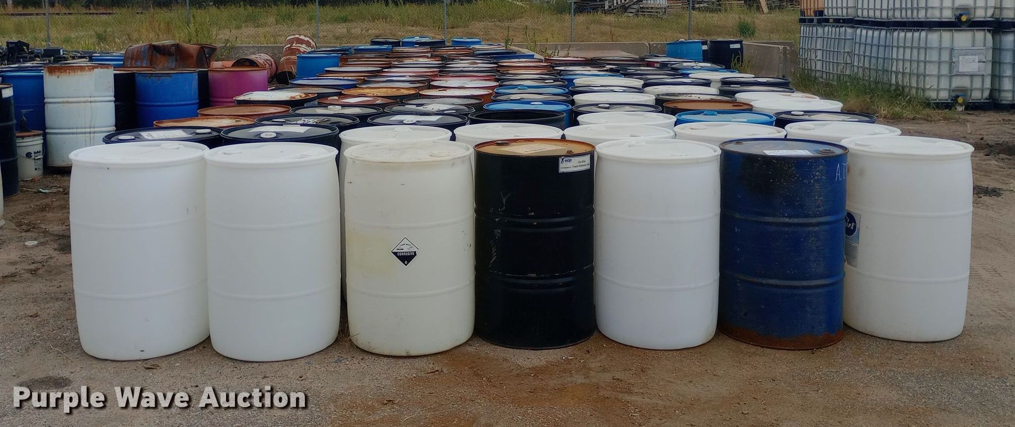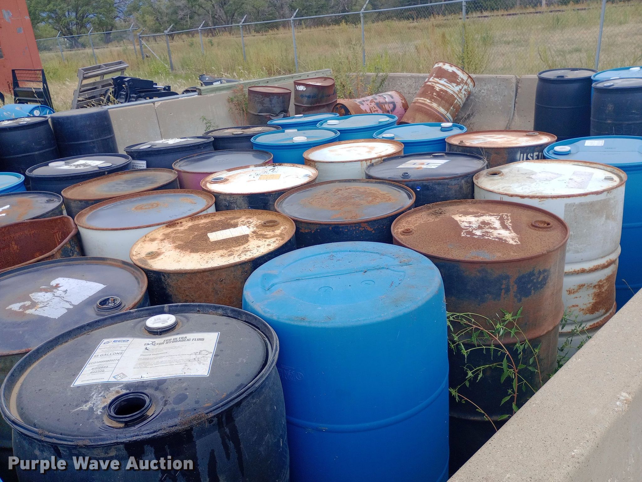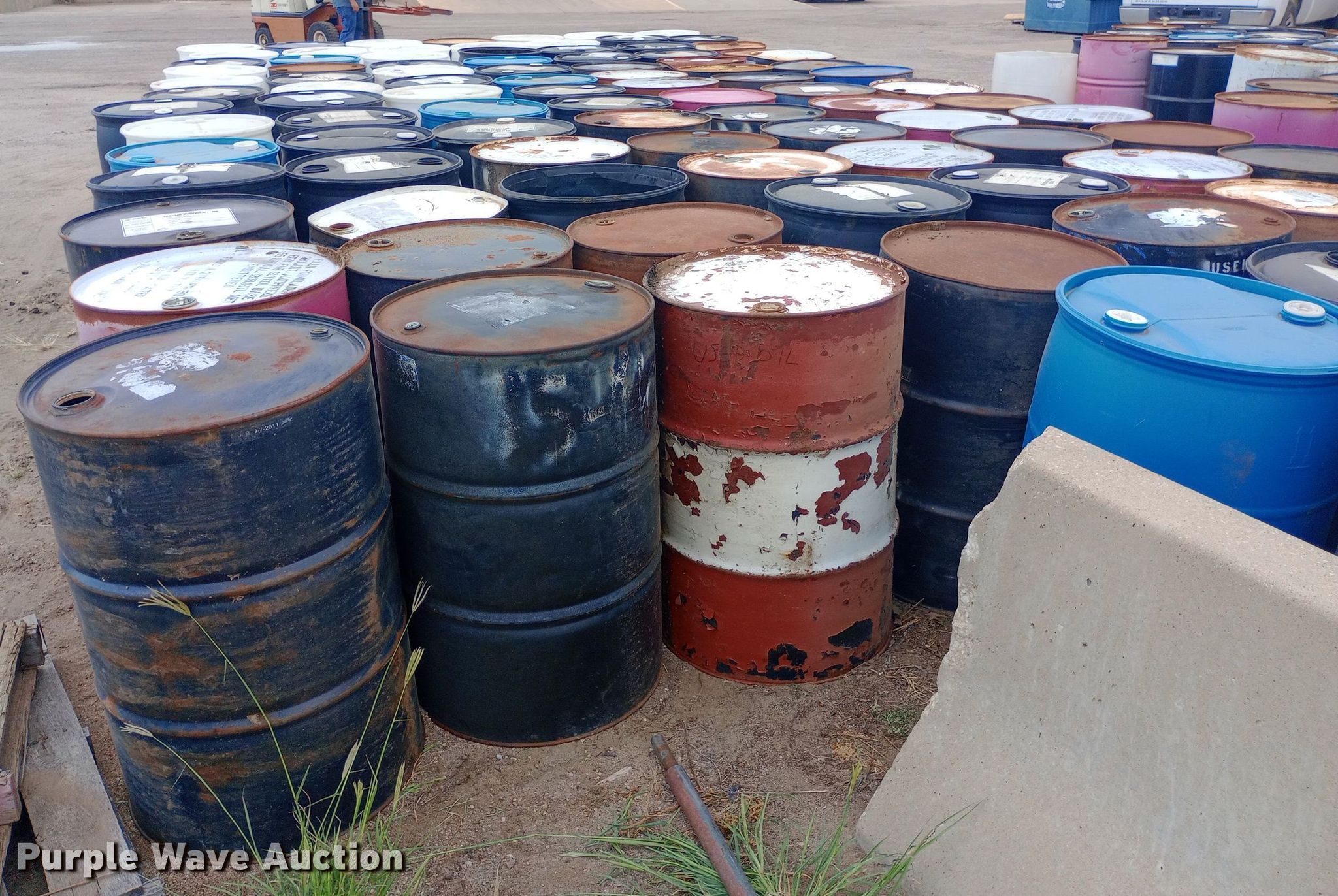 Purple Wave is selling a used Tools in Kansas. This item is a Approximately 120 barrels with the following: Capacity: 50 gallon, Poly and metal, KDOT ID: 50626