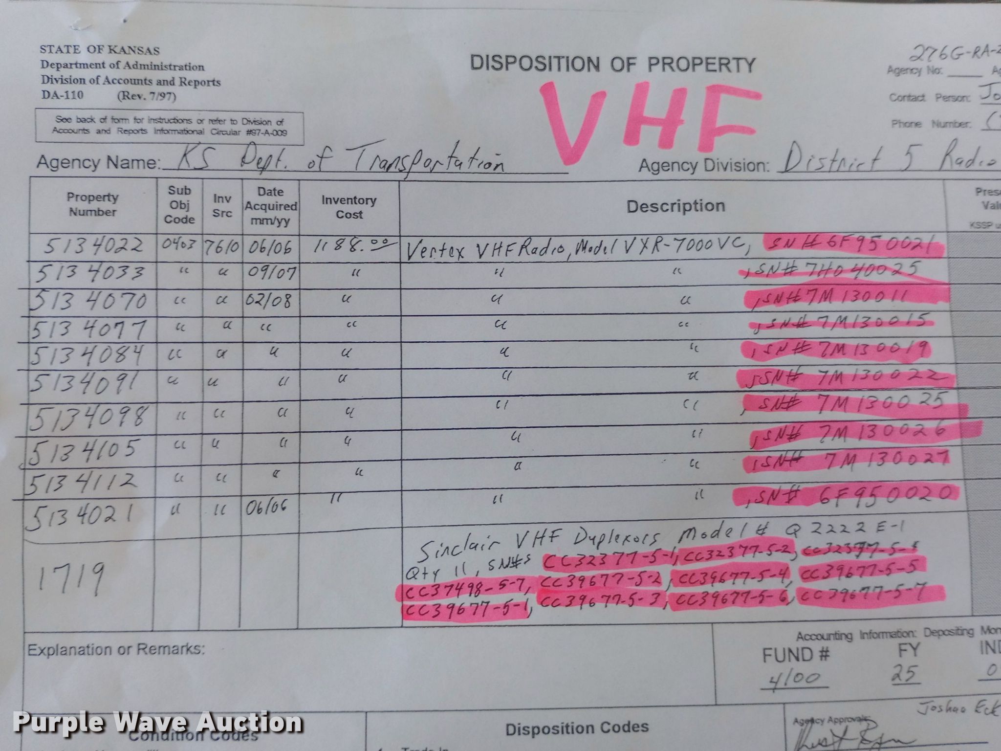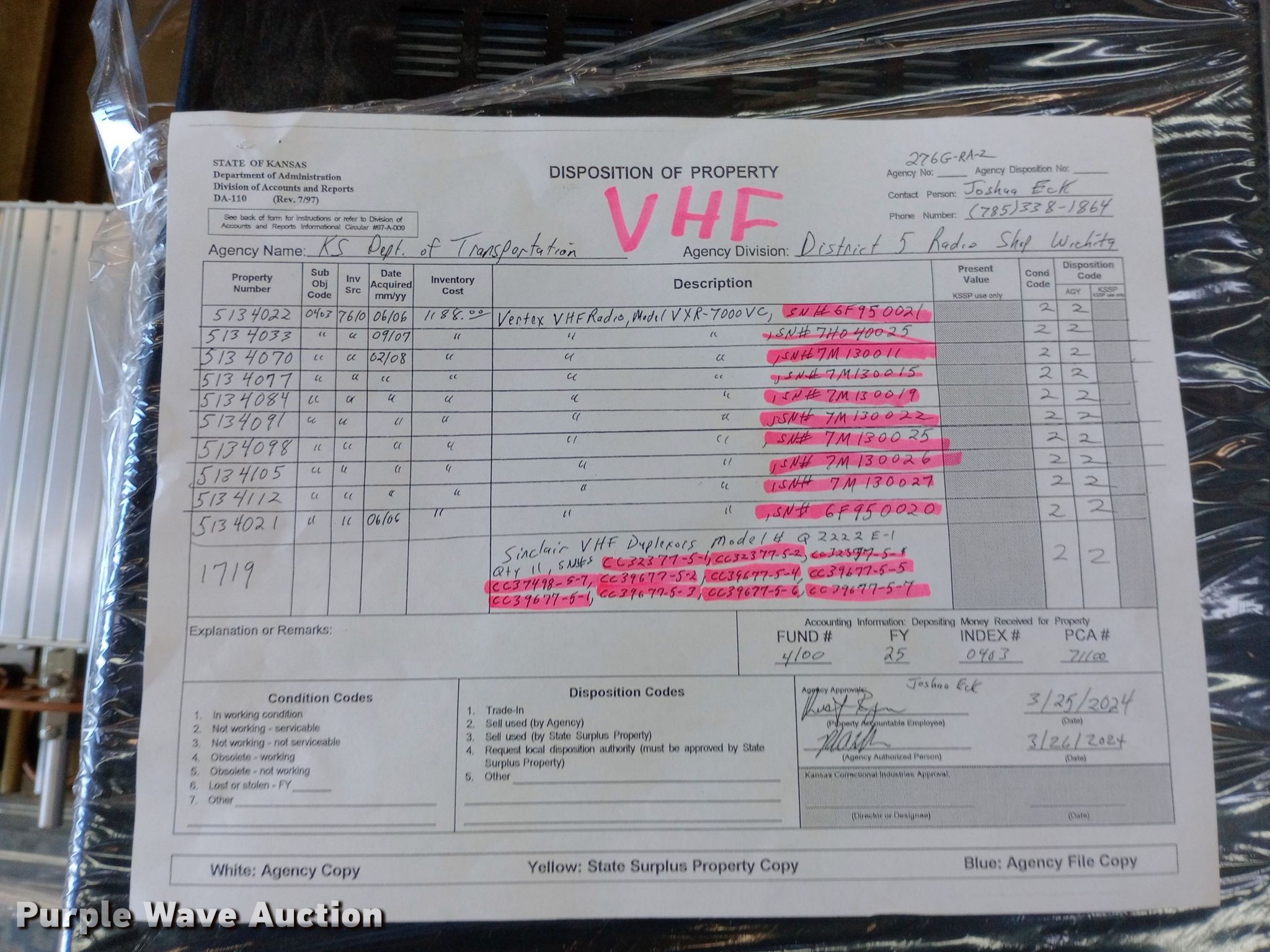 Purple Wave is selling a used Electronics in Kansas. This item is a Electronics with the following: (10) Vertex VRX-7000VC radios, (11) Sinclair Q222E-1 duplexors, KDOT ID: 1719, 5134021, 5134022, 5134033, 5134070, 5134077, 5134084, 5134091, 5134098, 5134105, 5134112