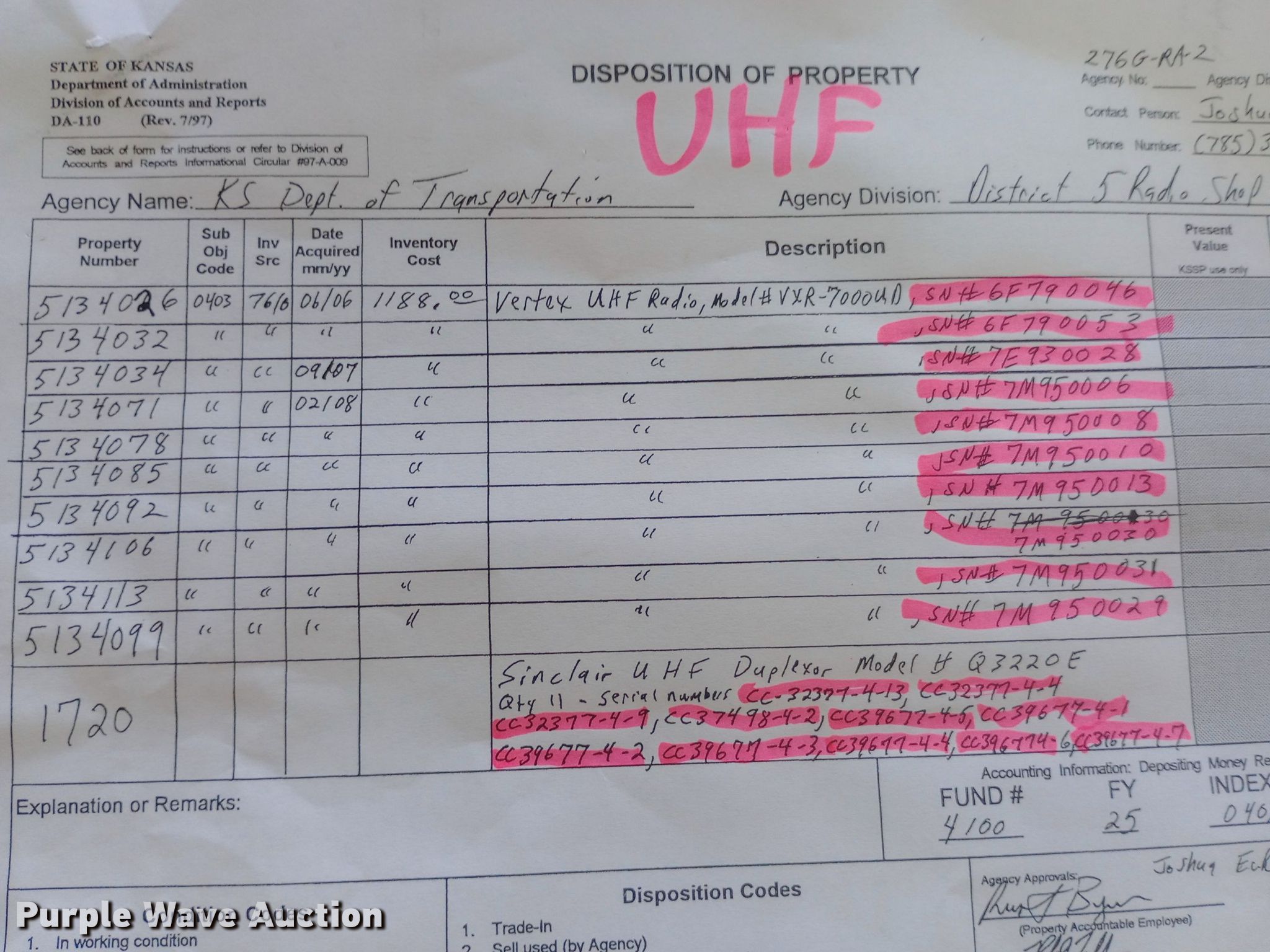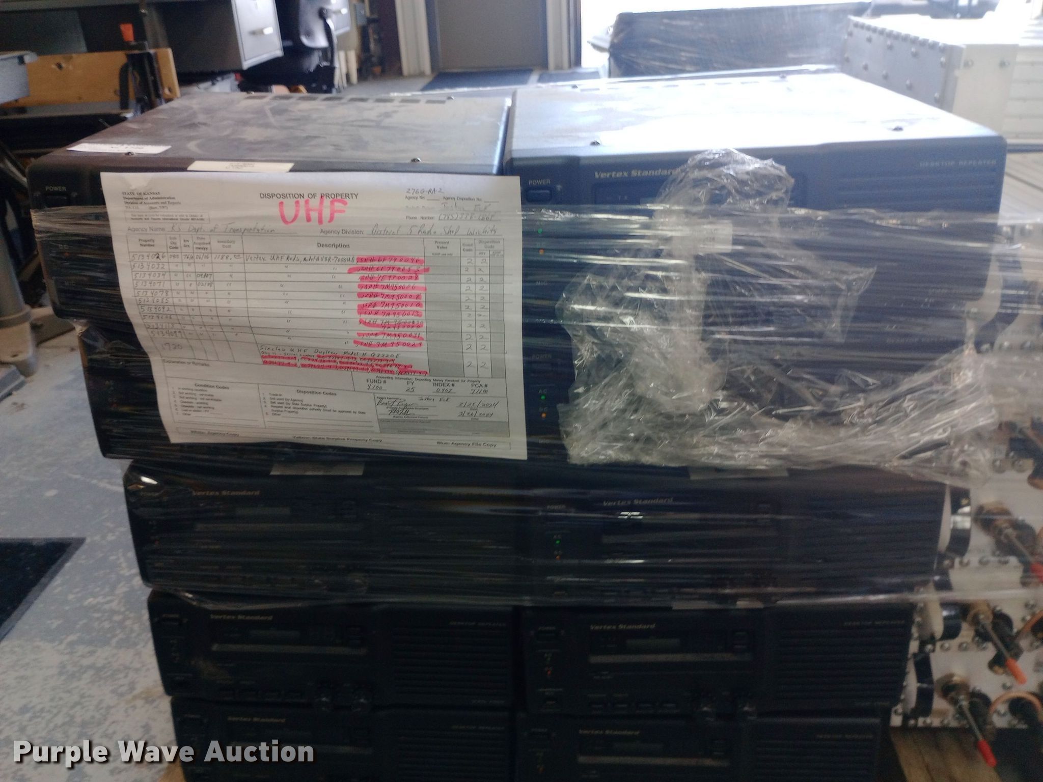 Purple Wave is selling a used Electronics in Kansas. This item is a Electronics with the following: (10) Vertex VXR-7000UD radios, (11) Sinclair Q3220E duplexors, KDOT ID: 1720, 5134026, 5134032, 5134034, 5134071, 5134078, 5134085, 5134092, 5134099, 5134106, 5134113