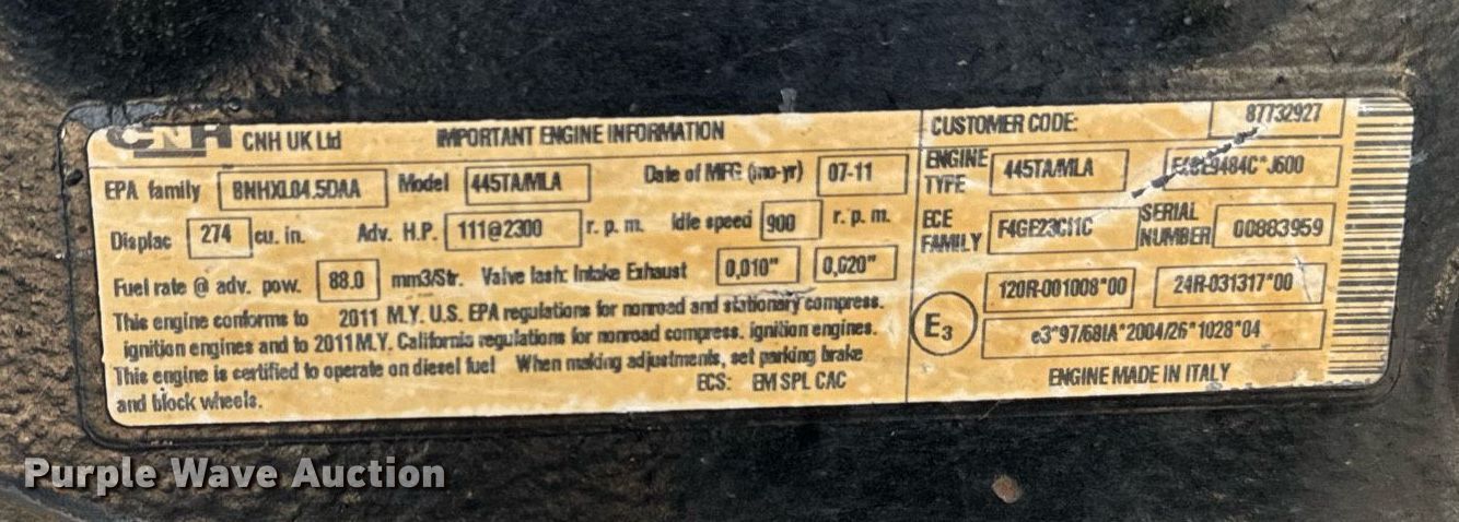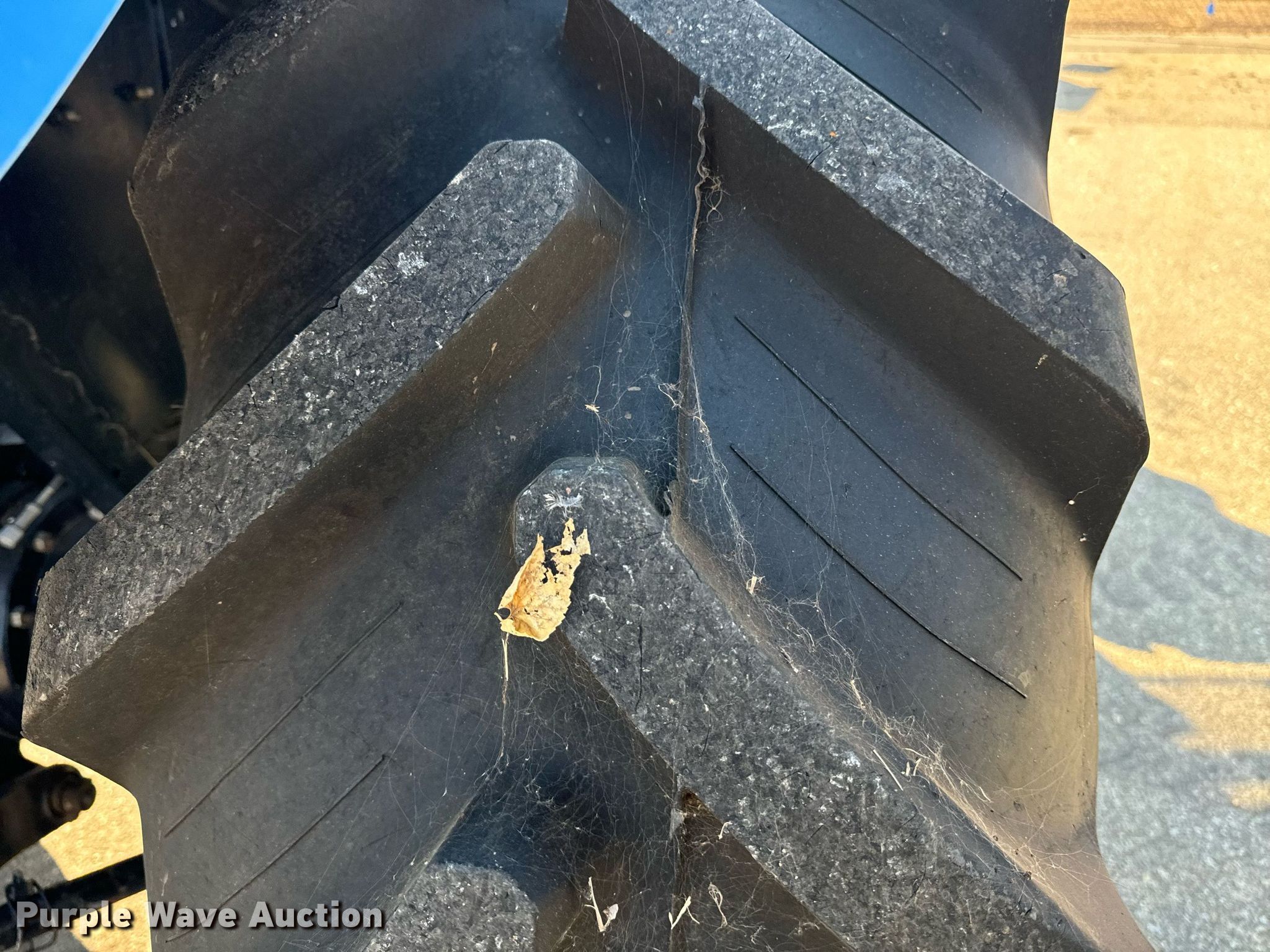 2011 New Holland T-5070 MFWD tractor. Hours: 3,213 on meter, Serial: ZBJH15104, KDOT ID: 352-2031. Engine CNH, Displacement: 4.5L, Cylinders: 4, Fuel type: Diesel. Transmission Synchro, 12F - 12R, Differential lock. Operators station AC, Heat. Features PTO: 540, 1000, Three point Top link, Seven pin outlet, Hydraulic remote sets Rear: 3, Suitcase weights: 10. Tires Front: 380/85R24, Rear: 460/85R34. Notes Unit overheats under load, Dead battery. Kansas Dept. of Transportation. Salina, KS 67401