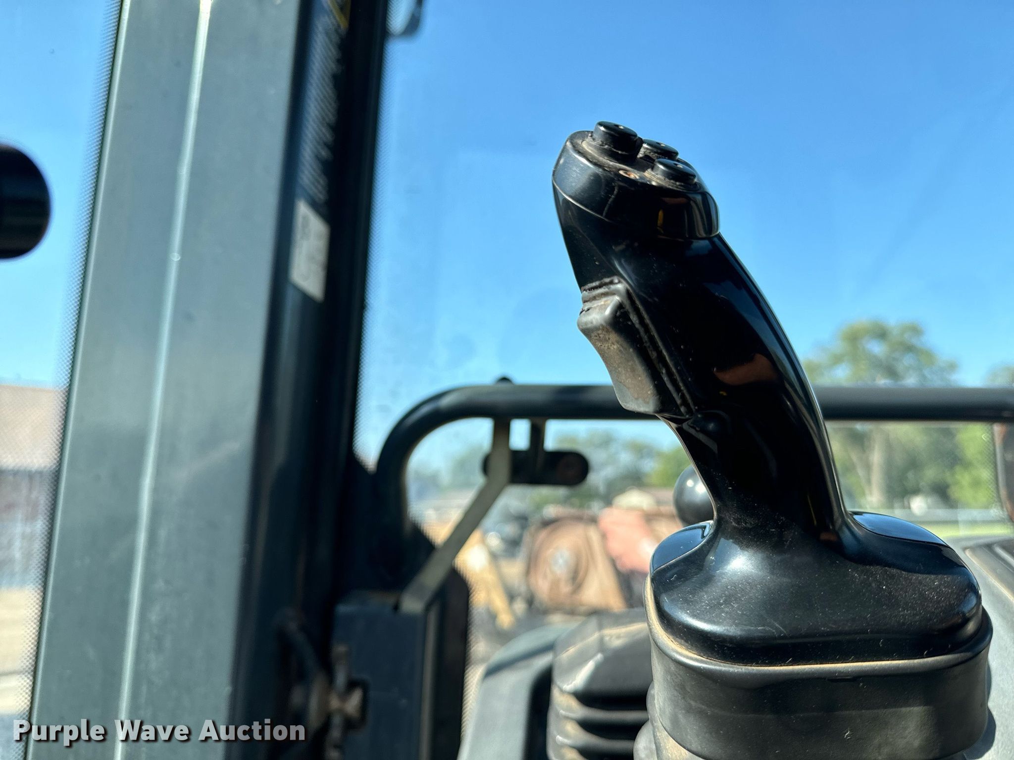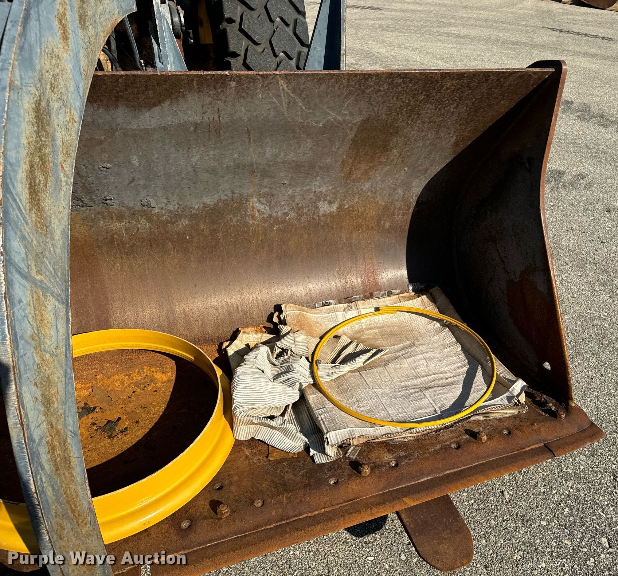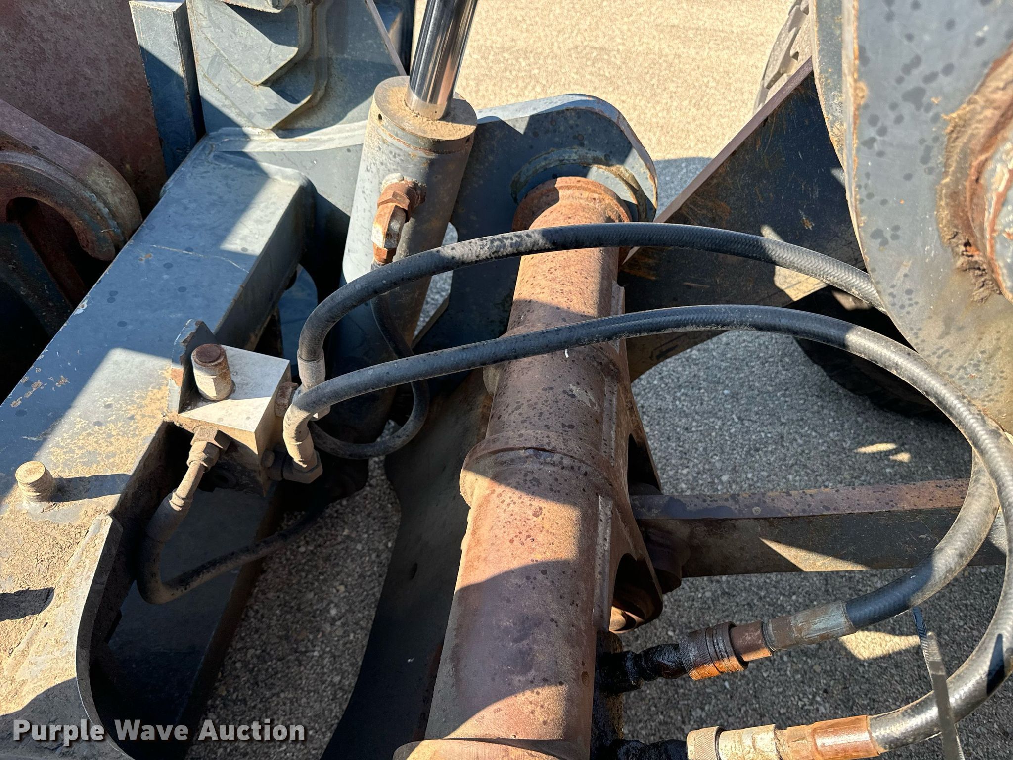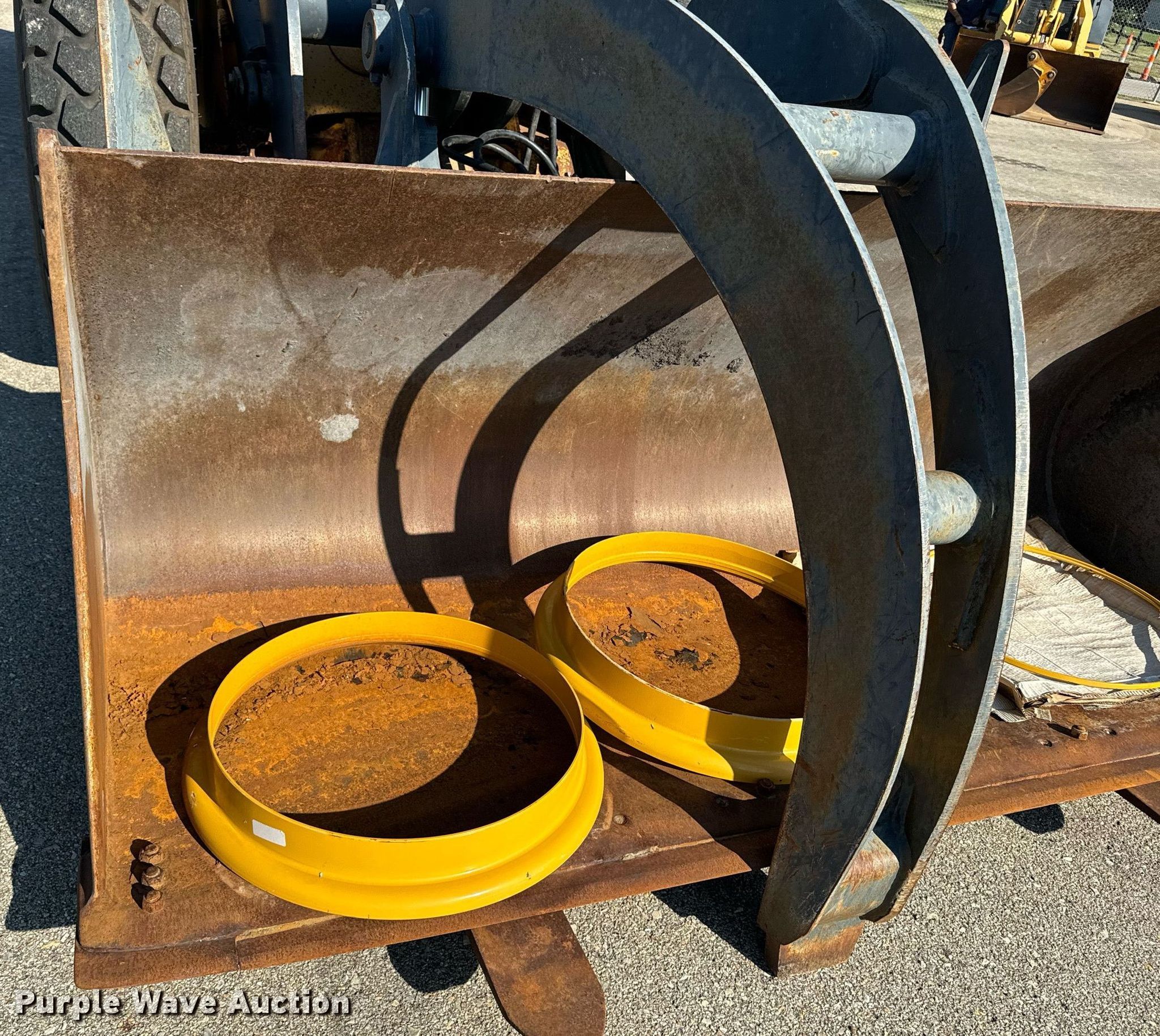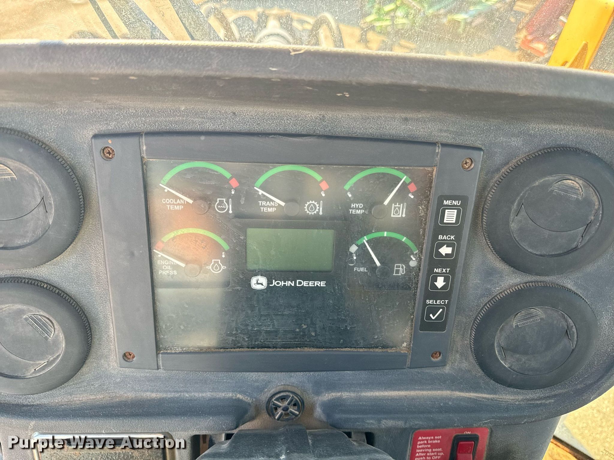 2005 John Deere 444J wheel loader. Hours: Unknown, Last recorded hours: 5,527, Serial: DW444JZ595168, KDOT ID: 365-2055. Engine Cylinders: 4, Fuel type: Diesel. Transmission Powershift, 4F - 3R. Chassis Differential lock. Operators station Enclosed cab, AC, Heat, Bucket controls: Joystick, Ride control. Features Auxiliary hydraulics: Front, Quick coupler: Hydraulic, Grapple bucket Capacity: 2 cu.yd., Width: 98", Cutting edge: Bolt-on, Forks. Tires Size: 17.5R25. Notes Dead battery, Tires leak air, Steering column issues, does not lock, Gauge display issues, Quick coupler hydraulic hose bad, needs replaced. Kansas Dept. of Transportation. Salina, KS 67401