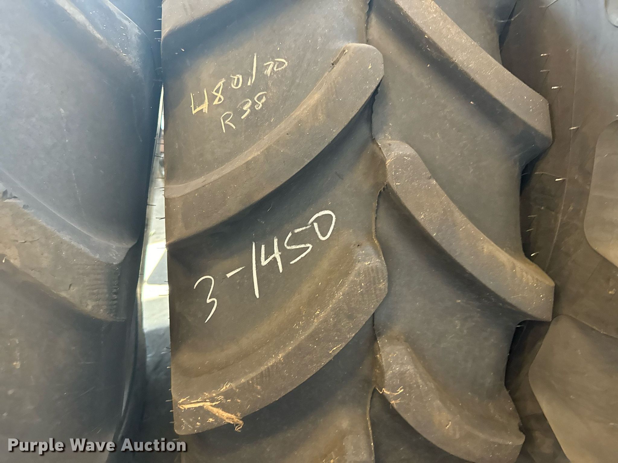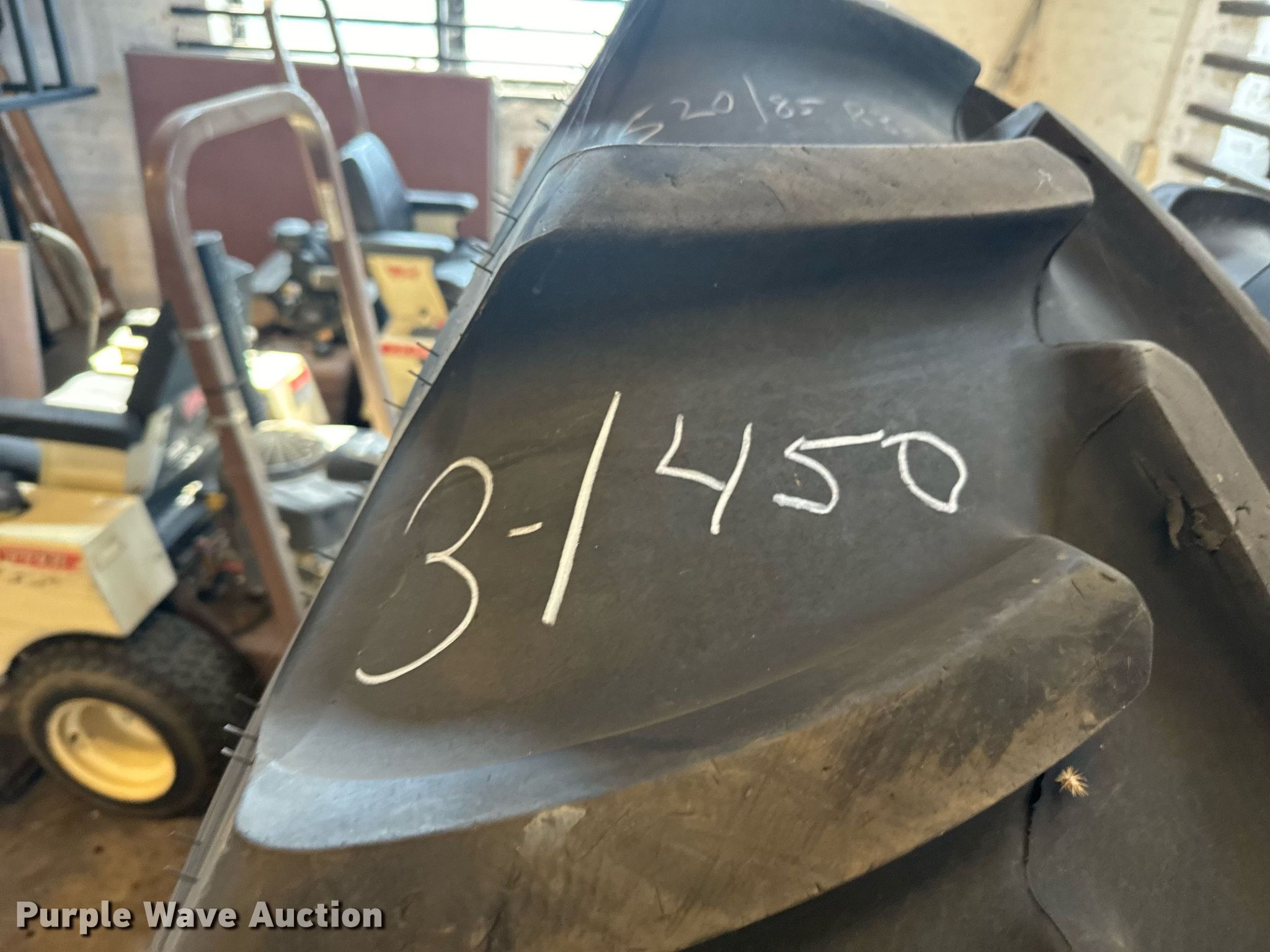 Purple Wave is selling a used Industrial Tires or Tracks in Kansas. This item is a (3) Firestone tires with the following: (2) Performer 85 Extra 520/85R38, One has hole in sidewall, Needs tube, One has gash in tread but holds air, Performer 70 Extra 480/70R38, Hole in sidewall, Needs tube,, KDOT ID: 3-1450