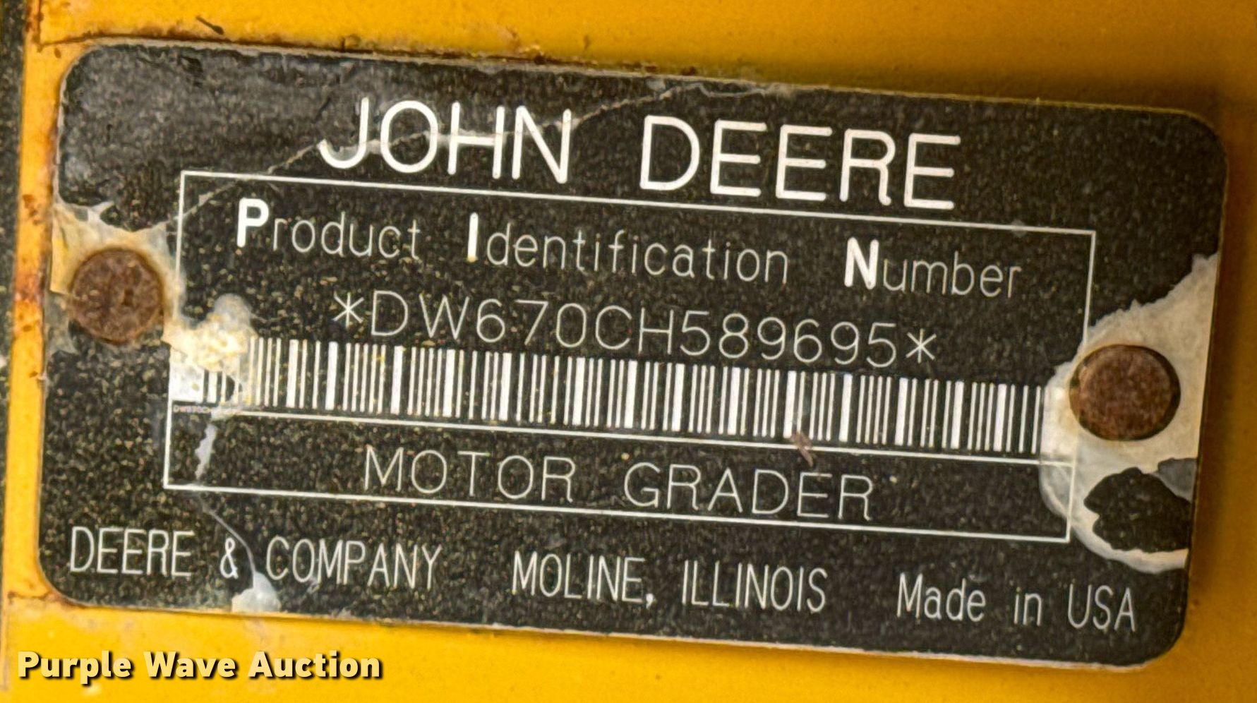 Purple Wave is selling a used Motor Grader in Kansas. This item is a 2004 John Deere 670CH motor grader with the following: Hours: 7,266 on meter, Serial: DW670CH589695, KDOT ID: 311-1093