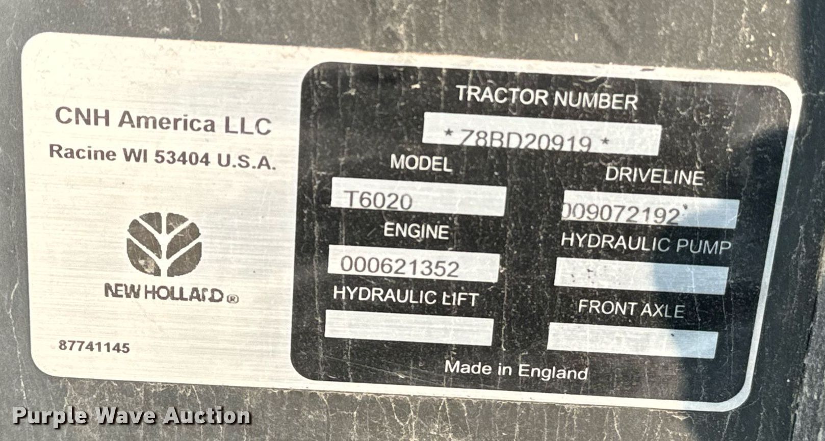 Purple Wave is selling a used Tractor in Kansas. This item is a 2009 New Holland T6020 tractor with the following: Hours: 5,154 on meter, Serial: Z8BD20919, KDOT ID: 352-1039