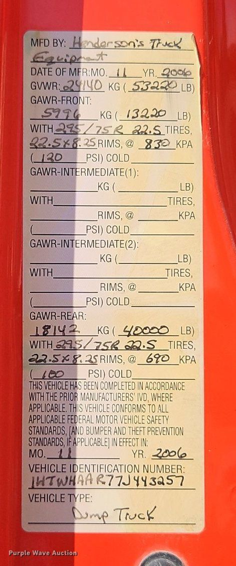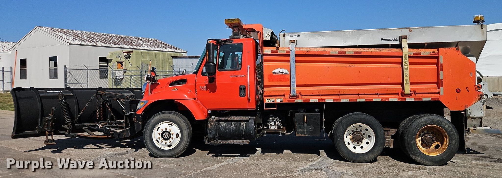 2007 International 7400 dump truck. Miles: 214,210 on odometer, Hours: 10,580 on meter, VIN: 1HTWHAAR77J443257, KDOT ID: 264-4057. Engine International DT466, Displacement: 7.6L, Cylinders: 6, Fuel type: Diesel. Transmission Allison, Automatic. Chassis Axles: Tandem, Differential lock: Inter-axle, Suspension: Spring over walking beam, Brakes: Air, PTO, Front mount PTO, GVWR: 53,220 lbs. Interior AC, Heat, Heated mirrors, Cruise control, Brake controller. Features Dump bed Henderson, 13'L x 96" W, Side height: 38", Bed type: Steel, Ram: Single, End gate: Air operated, Spreader Henderson, Plow Henderson, Width: 132". Tires Size: 295/75R22.5. Notes Dead battery, Controller electrical issues. Titles will be distributed after confirmation of payment and removal. Kansas title. Kansas Dept. of Transportation - Chanute. Chanute, KS 66720
