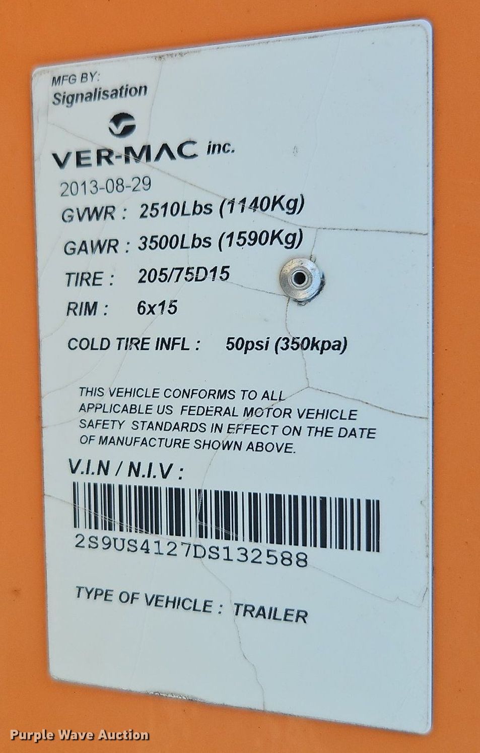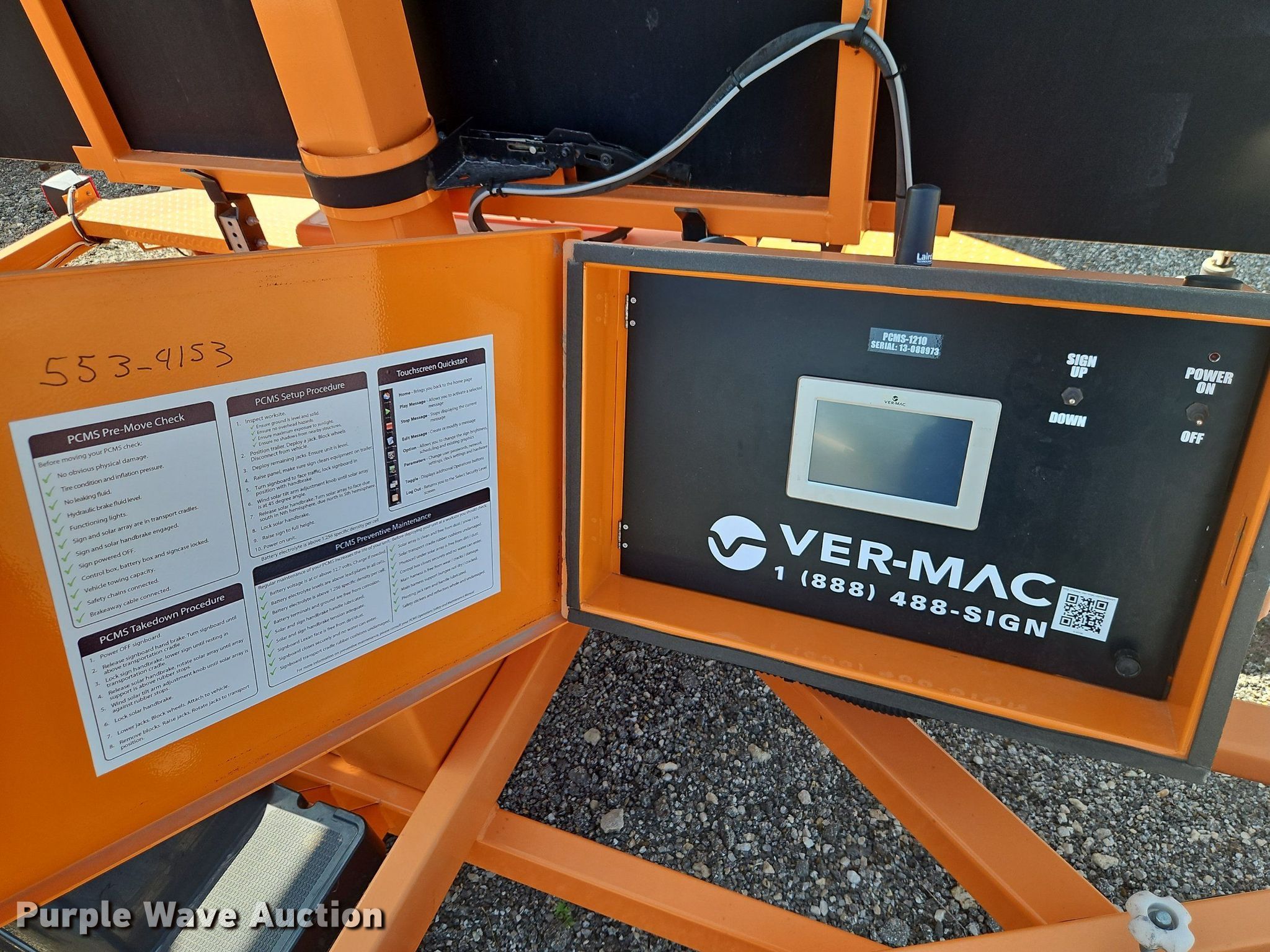 Purple Wave is selling a used Road Safety Equip. in Kansas. This item is a 2013 Ver-Mac PCMS1210 message board trailer with the following: VIN: 2S9US4127DS132588, KDOT ID: 553-4153