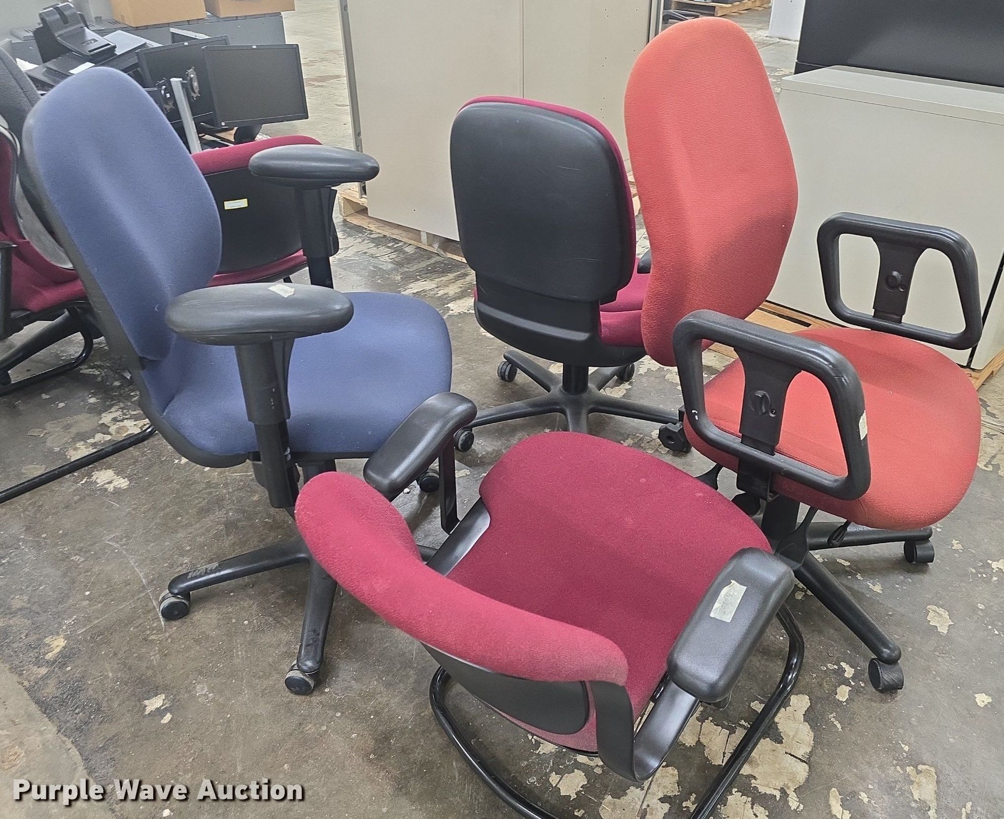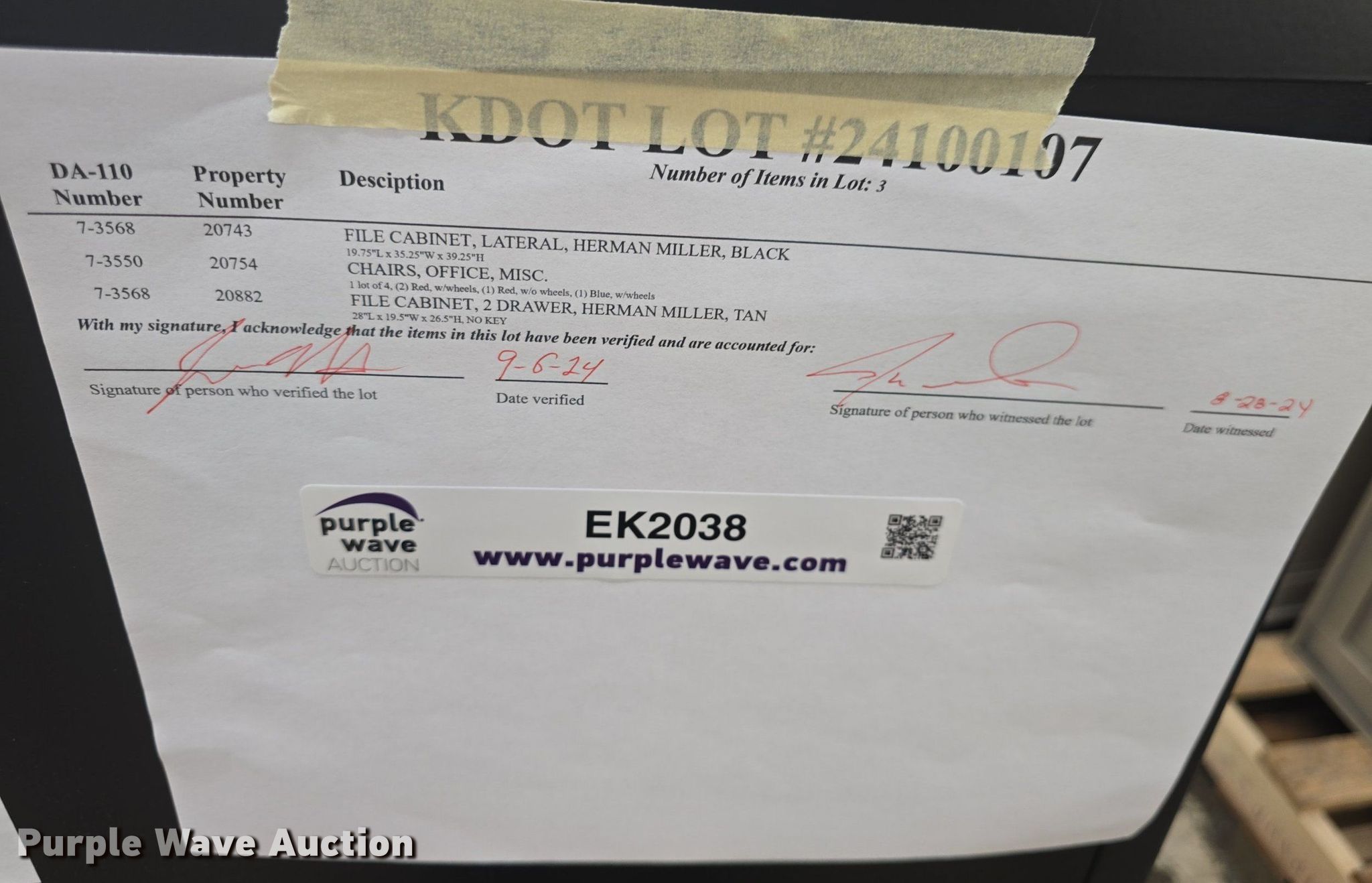 Purple Wave is selling a used Furniture in Kansas. This item is a Furniture with the following: (4) chairs, (2) file cabinets, KDOT ID: 24100107