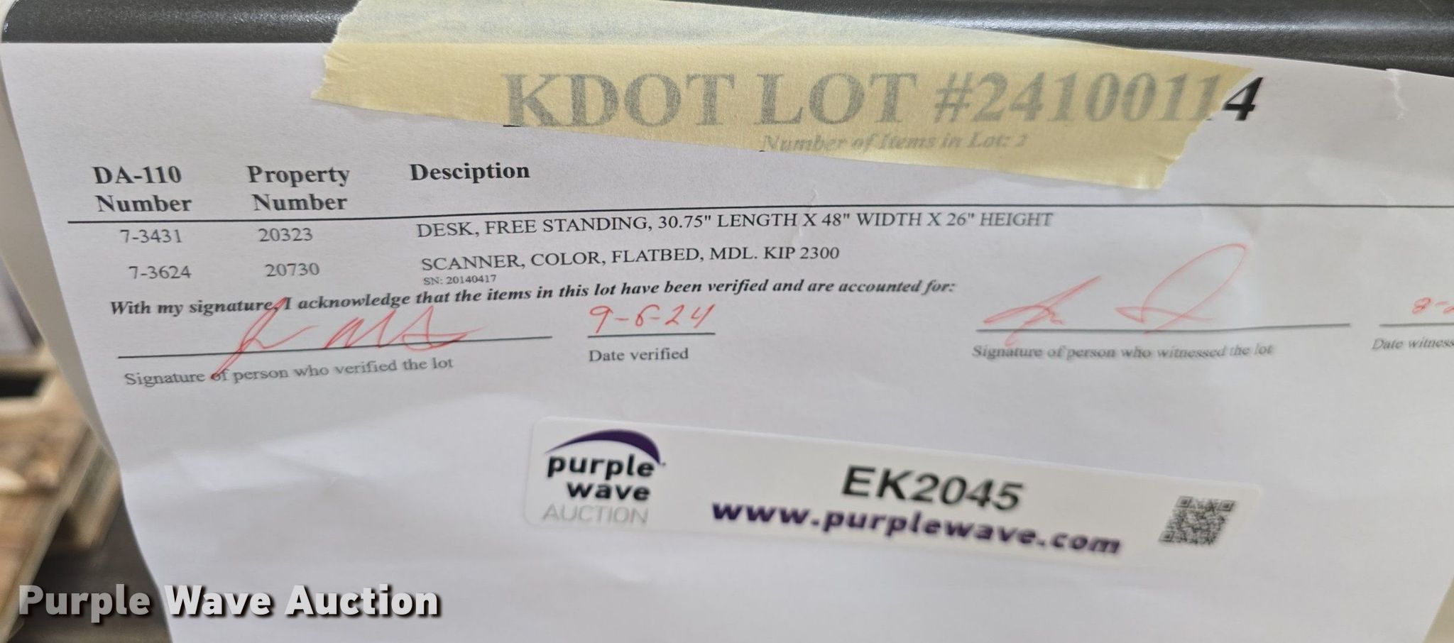 Purple Wave is selling a used Office Supplies and Equip. in Kansas. This item is a Office supplies with the following: Desk, Scanner, KDOT ID: 24100114