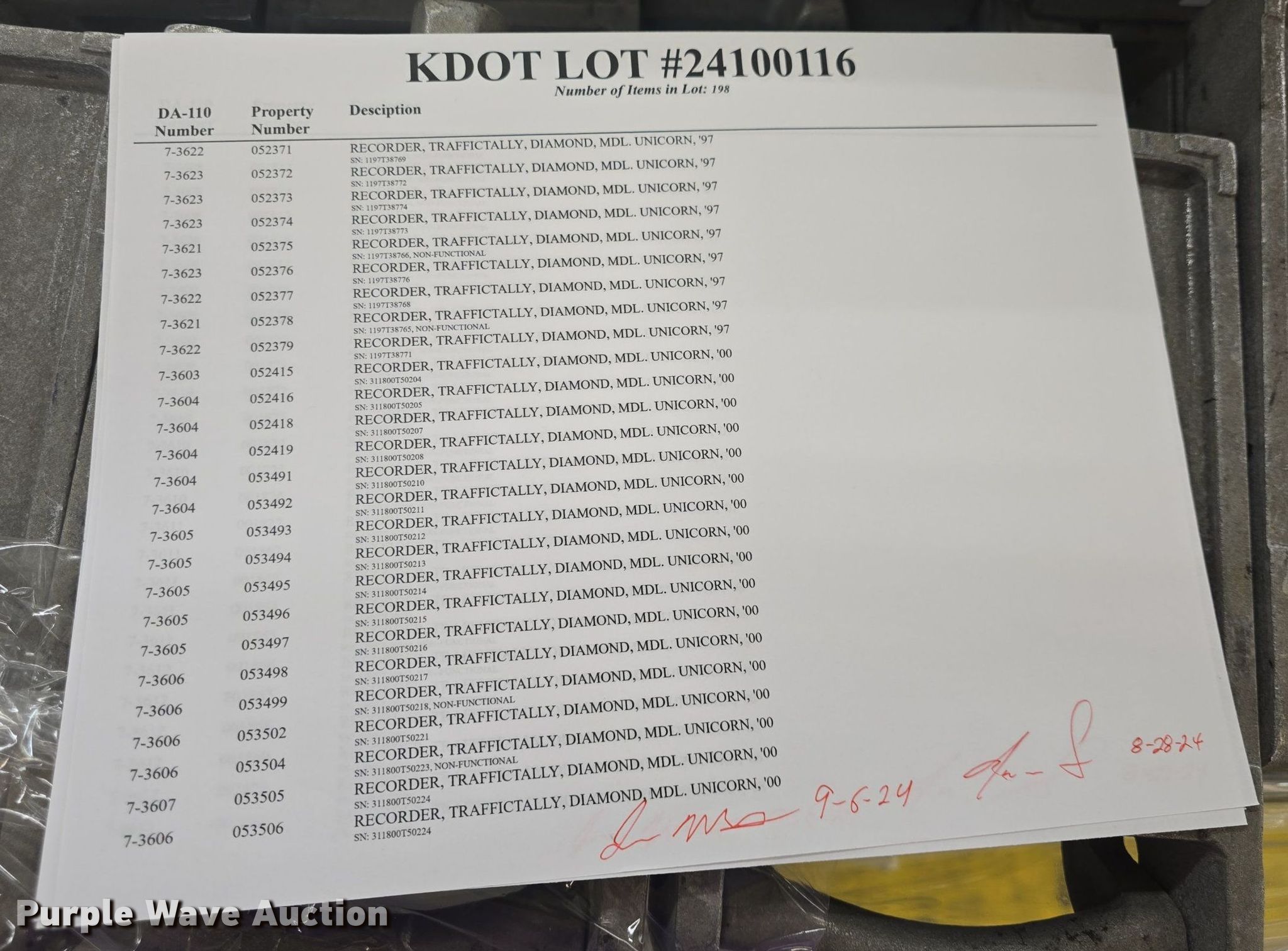 Purple Wave is selling a used Electronics in Kansas. This item is a Electronics with the following: (4) EISR traffic loop detectors, (22) Jamar velocity classifiers, (2) GK Instruments recorders, (3) K-Hill impulse counters, ITC Trafficace recorder, (5) Streeter Amet recorders, (151) Traffictally Diamond recorders, (8) Nu-Metrics traffic analyzers, (8) Vaisala traffic analyzers, (2) Mikros Systems weigh-in motion systems, KDOT ID: 24100116