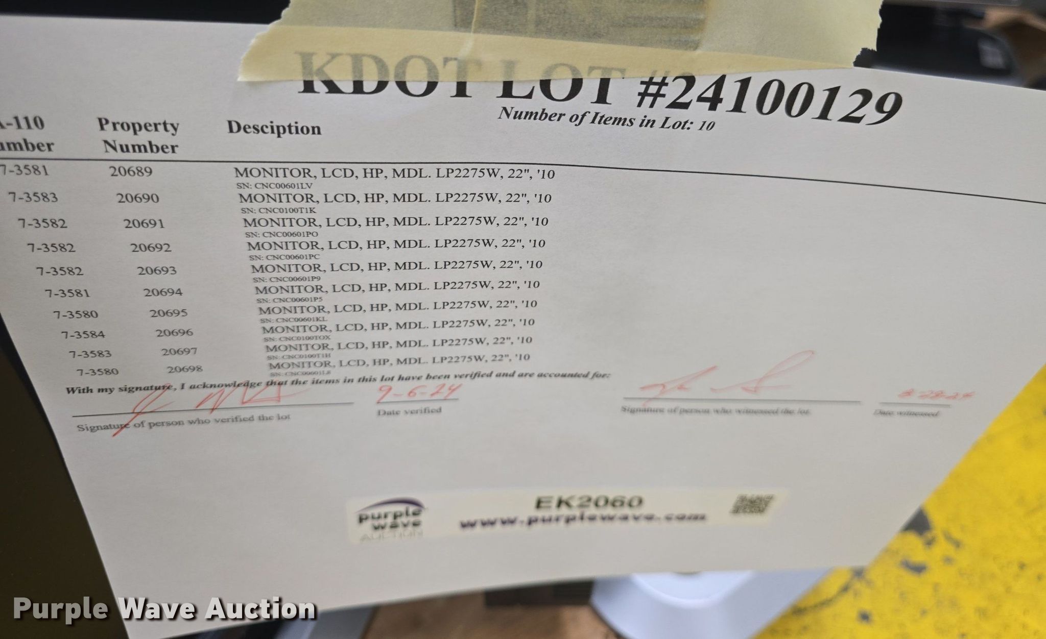 Purple Wave is selling a used Electronics in Kansas. This item is a (10) HP monitors with the following: KDOT ID: 24100129