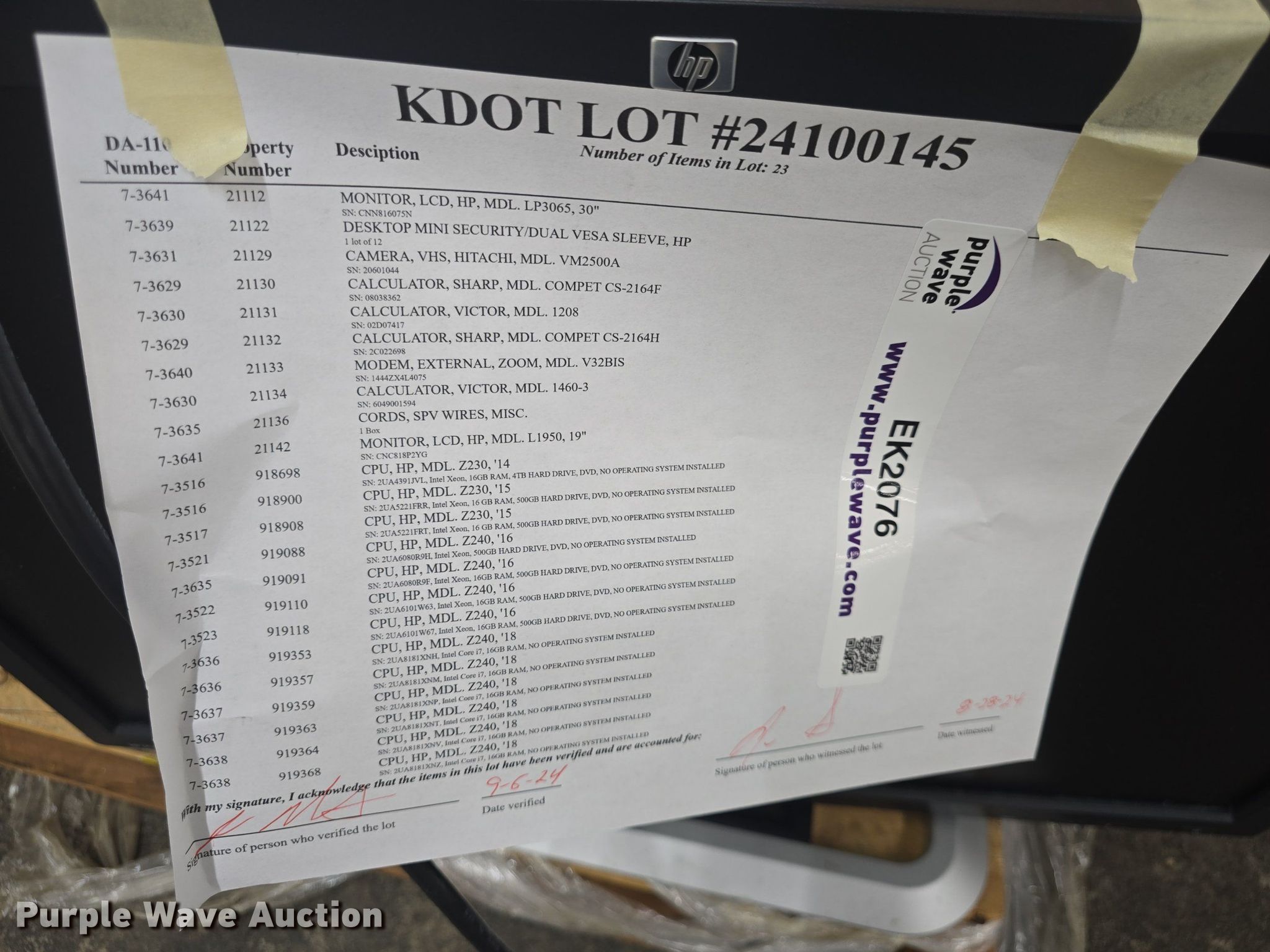 Purple Wave is selling a used Electronics in Kansas. This item is a Electronics with the following: (13) HP CPUs, Hard drives have been reformatted and no operating system installed, (2) Sharp calculators, (2) Victor calculators, Hitachi VHS camera, (12) HP Dual Vesa sleeves, Zoom modem, (2) HP monitors, Cords, KDOT ID: 24100145