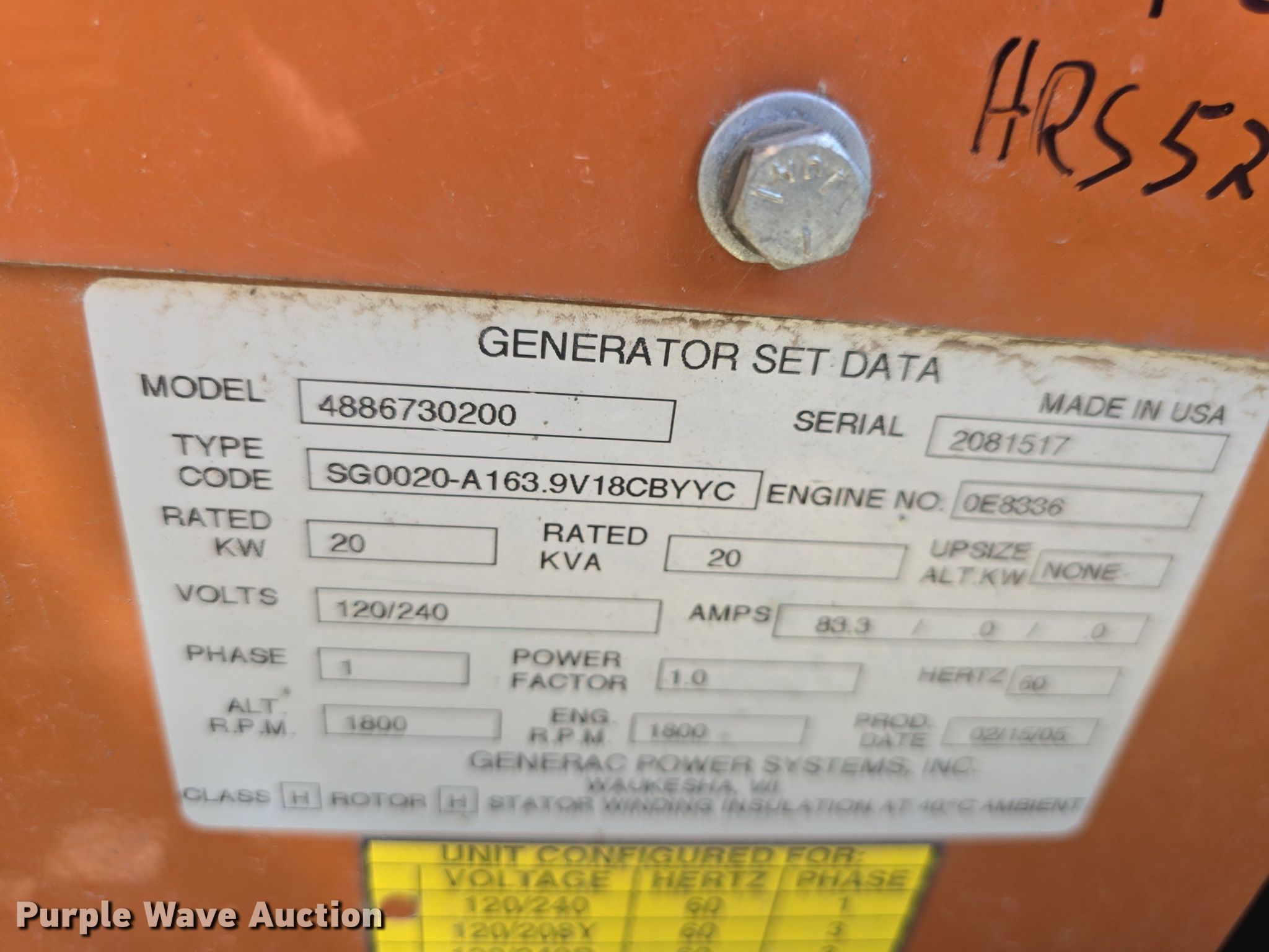 Generac 4886730200 generator. Hours: 521 on meter, Serial: 2081517, KDOT ID: 1693. Engine Fuel type: LPG. Features Generator Generac, kVA: 20, Phase: Single, Transfer switch Generac 4308830100, Serial: 86104, Amps: 100, Phase: Single, Unknown operating condition. Notes Non-operational utility sensor module, Unknown operating condition. Kansas Dept. of Transportation. Topeka, KS 66614
