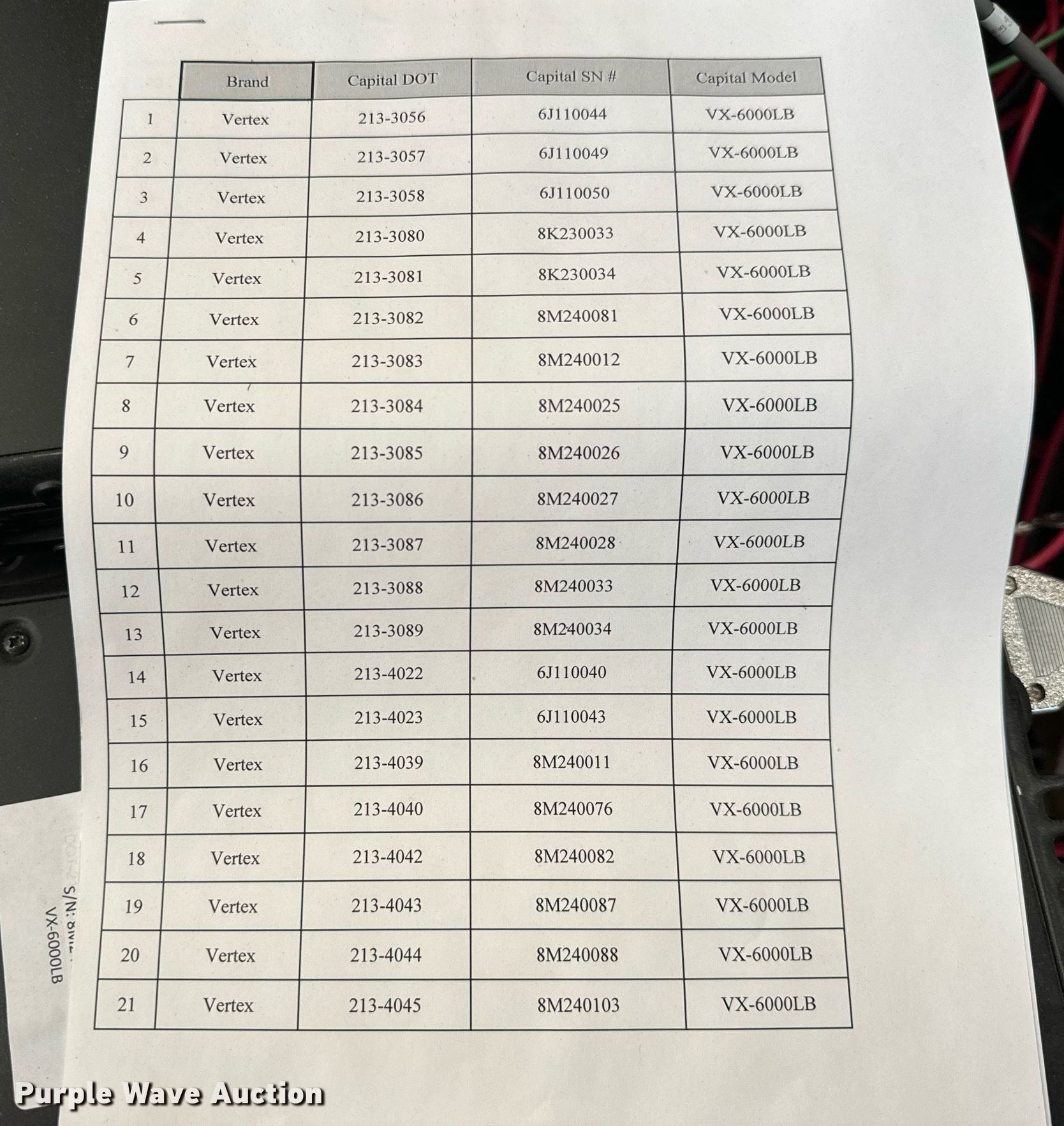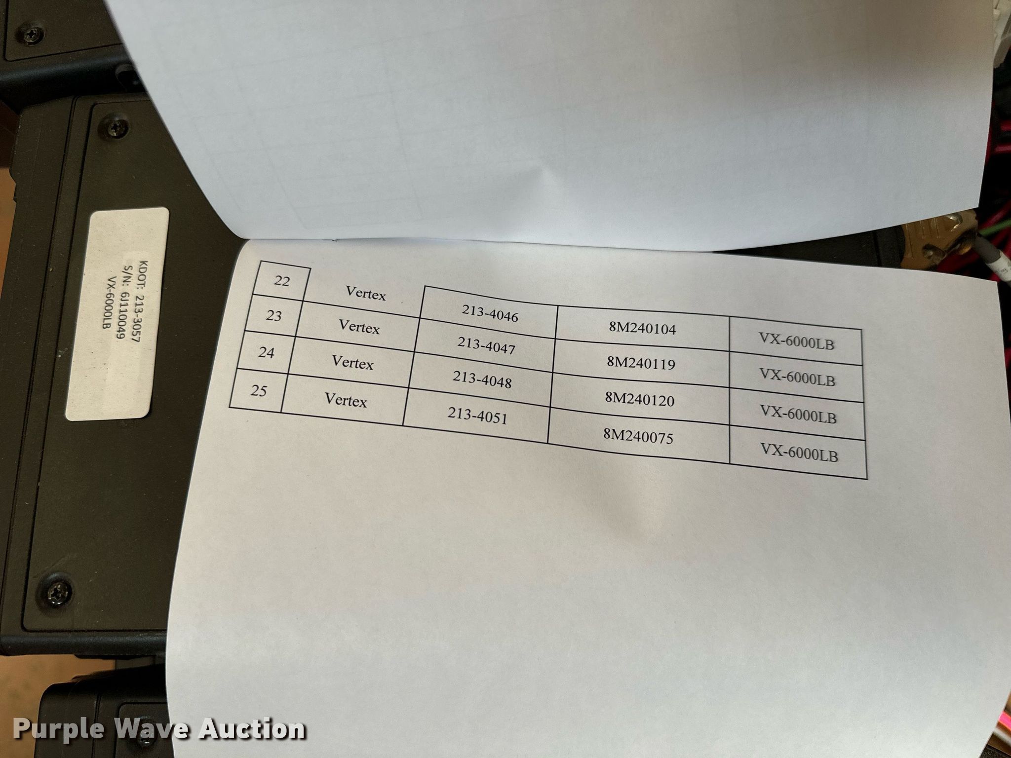 Electronics. (12) Sinclair Q3220E duplexors, (12) Sinclair Q2222E-1 duplexors, (25) Vertex VXC-6000LB radios, (21) Yaesu FP-1023 power supplies, JPS SNV-12 Signal and noise comparator, (12) Sinclair TC3212 transmit combiners, Rohn SSV radio tower section Length: 20', KDOT ID: 1703, 1702, 2134022, 2134023, 2133056, 2133057, 2133058, 2133080, 2133081, 2134039, 2133083, 2133084, 2133085, 2133086, 2133087, 2133088, 2133089, 2134051, 2134040, 2133082, 2134042, 2134043, 2134044, 2134045, 2134046, 2134047, 2134048, 1706, 2130015, 2152005, 1705. View inventory for more information. Kansas Dept. of Transportation-Salina Radio. Salina, KS 67401