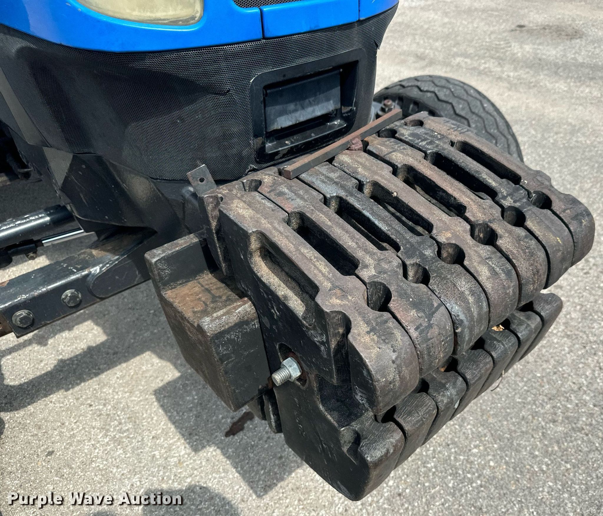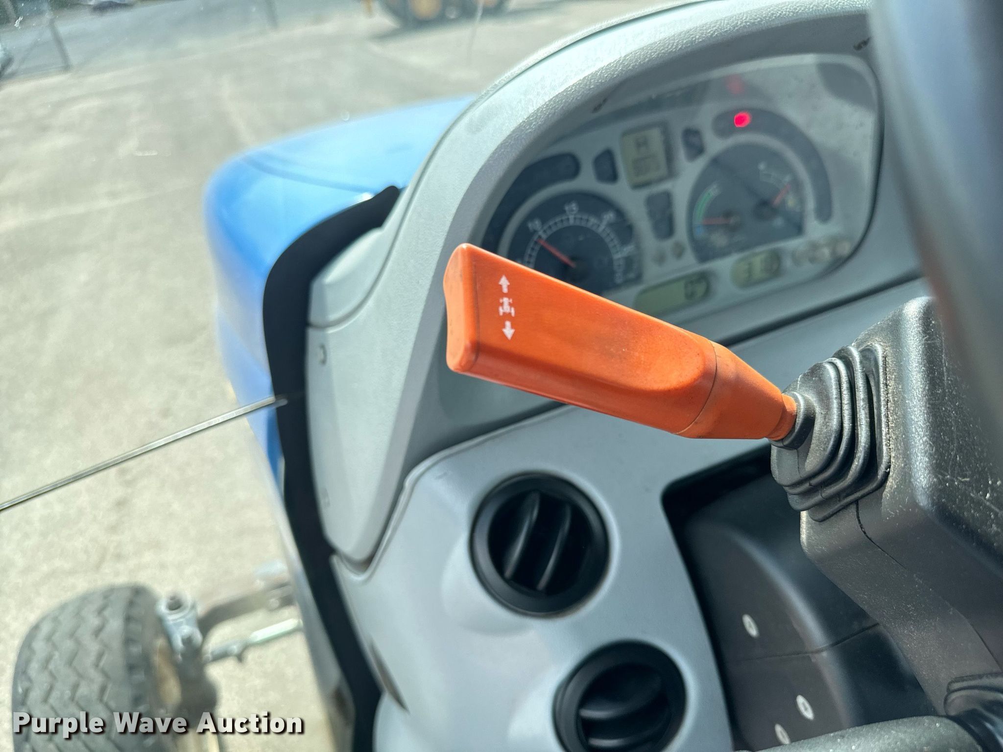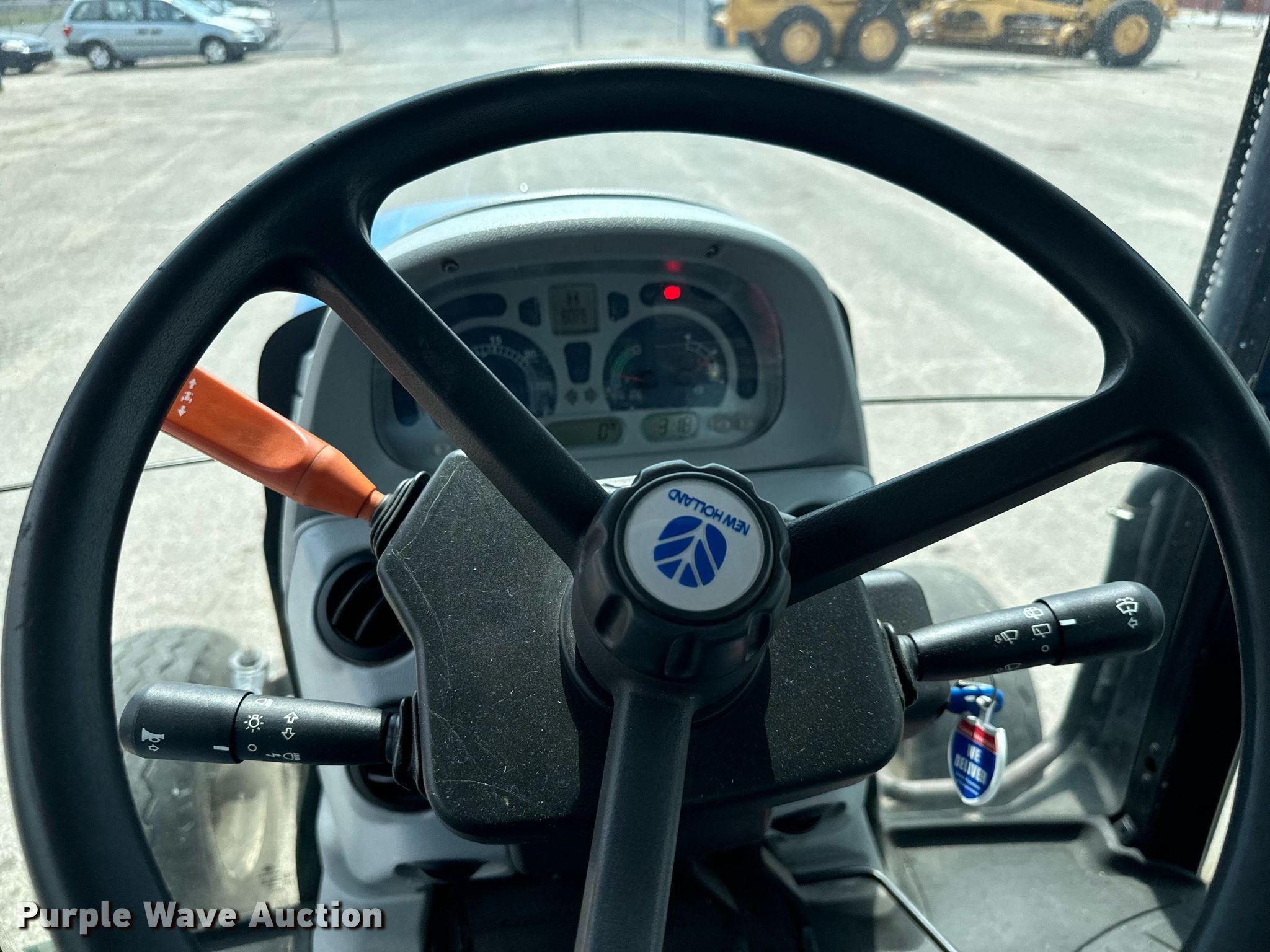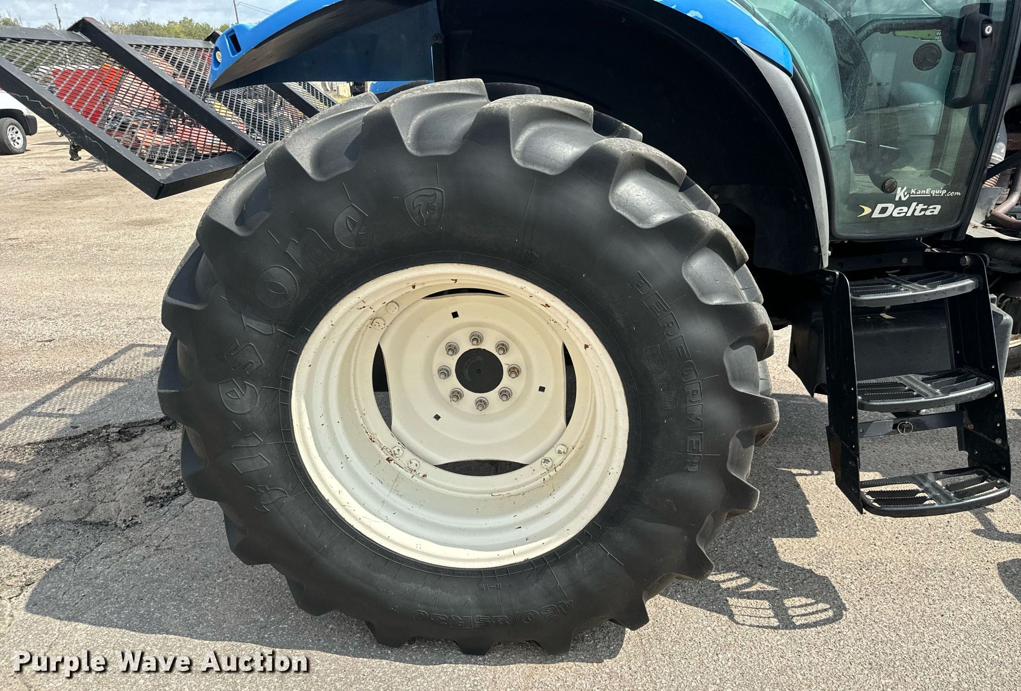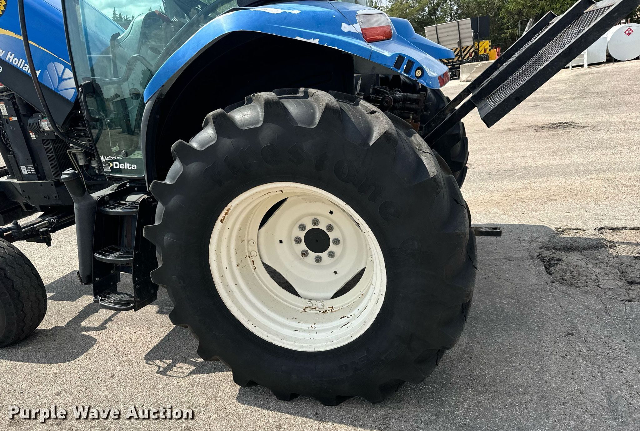 2009 New Holland T6020 tractor. Hours: 6,078 on meter, Serial: Z8BD19851, KDOT ID: 352-5109. Engine CNH 445TAMLM, Cylinders: 4, Fuel type: Diesel, HP: 110. Transmission Dual Command, 24F - 24R, Left-hand reverser, Differential lock. Operators station AC, Heat. Features PTO: 540, Seven pin outlet, Hydraulic remote sets Rear: 3, Suitcase weights: 7. Tires Front: 11L-16, Rear: 460/85R40. Kansas Dept. of Transportation-Shop. Hutchinson, KS 67504