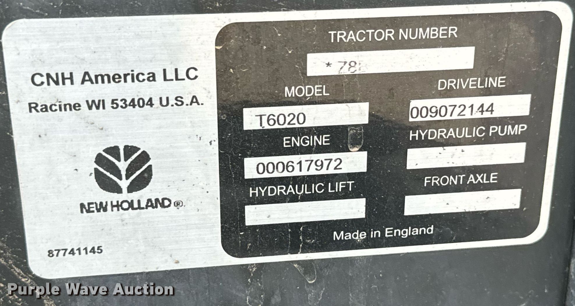 Purple Wave is selling a used Tractor in Kansas. This item is a 2009 New Holland T6020 tractor with the following: Hours: 6,078 on meter, Serial: Z8BD19851, KDOT ID: 352-5109