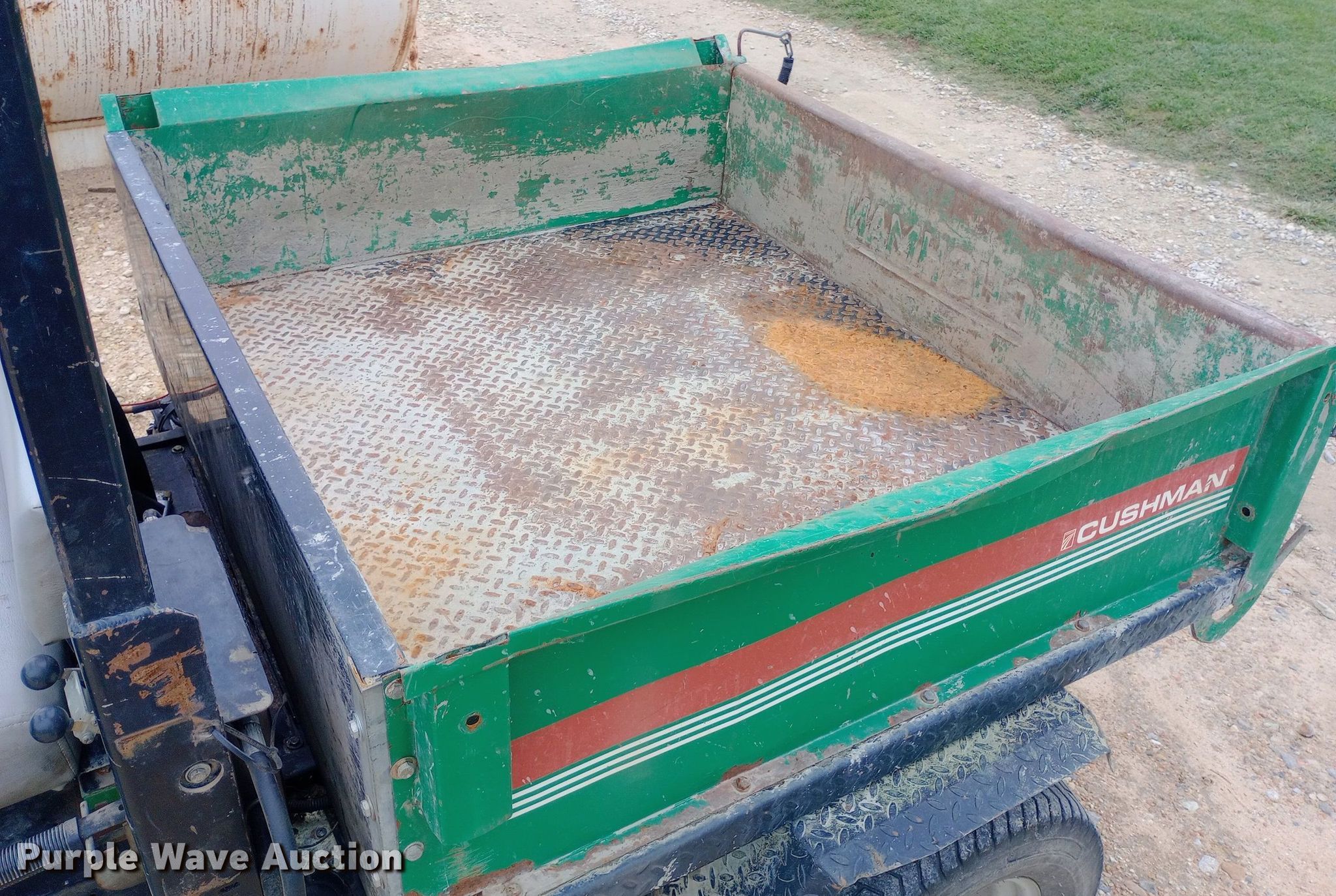 1998 Cushman Turf-Truckster utility vehicle. Hours: 5,458 on meter, Serial: 98005150. Engine Cylinders: 3, Fuel type: Diesel. Transmission Manual, Speed: 3. Operators station OROPS. Features Dump bed 48" L x 57" W, Dump bed type: Electric/ Hydraulic. Tires Front: 18x9.50-8, Rear: 24x13.00-12. Pine Bay Golf Course. Wichita, KS 67216