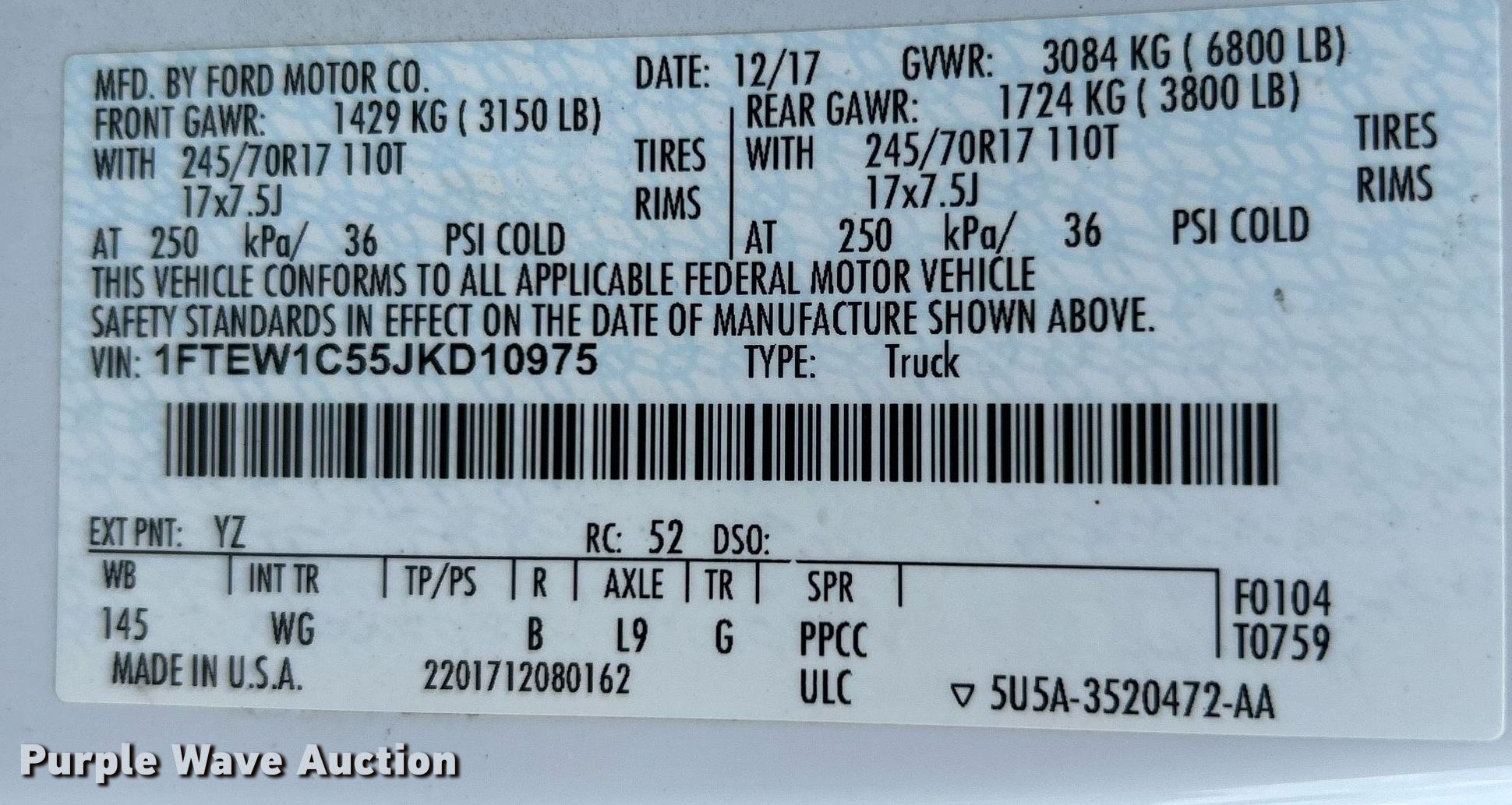 Purple Wave is selling a used 1/2 Ton Pickup or Van in Oklahoma. This item is a 2018 Ford F150 XL SuperCrew pickup truck with the following: Miles: 177,663 on odometer, VIN: 1FTEW1C55JKD10975, Unit #: 02.679